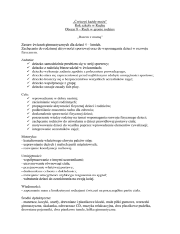 „Ćwiczyć każdy może” Rok szkoły w Ruchu Obszar 8 – Ruch w gronie rodziny „Razem z mamą” Zestaw ćwiczeń gimnastycznych dla dzieci 4 – letnich. Zachęcanie do rodzinnej aktywności sportowej oraz do wspomagania dzieci w rozwoju fizycznym. Zadania: dziecko samodzielnie przebiera się w strój sportowy; dziecko z radością bierze udział w ćwiczeniach; dziecko wykonuje zadania zgodnie z poleceniem prowadzącego; dziecko stara się zaprezentować przed najbliższymi zdobyte umiejętności sportowe; dziecko troszczy się o bezpieczeństwo wszystkich uczestników zajęć; dziecko współpracuje z grupą; dziecko stosuje zasady fair-play. Cele: wprowadzanie w dobry nastrój; zacieśnianie więzi rodzinnych; propagowanie aktywności fizycznej dzieci i rodziców; podkreślanie znaczenia ruchu dla zdrowia; doskonalenie sprawności fizycznej dzieci; poszerzenie wiedzy rodziny na temat wspomagania rozwoju fizycznego dzieci; zachęcenie rodziców do utrwalania u dzieci prawidłowej postawy ciała; motywowanie dzieci do wysiłku poprzez wprowadzenie elementów rywalizacji; integrowanie uczestników zajęć; Motoryka: - kształtowanie właściwego chwytu palców stóp; - usprawnianie dużych i małych partii mięśniowych; - rozwijanie koordynacji ruchowej. Umiejętności: - współpracowanie z innymi uczestnikami; - utrzymywanie równowagi ciała; - przyjmowanie właściwej postawy; - doskonalenie celności i dokładności; - rozwijanie umiejętności szybkiego reagowania na sygnał; - wdrażanie dzieci do oczekiwania na swoją kolej. Wiadomości: - zapoznanie mam z konkretnymi rodzajami ćwiczeń na poszczególne partie ciała. Środki dydaktyczne: - materace, kocyki, szarfy, drewniane i plastikowe klocki, małe piłki gumowe, woreczki gimnastyczne, skakanka, odtwarzacz CD, muzyka relaksacyjna, dwa plastikowe pudełka, drewniane pojemniki, dwa piankowe tunele, kółka gimnastyczne. Metody: - oglądowa, praktyczna. Formy: - indywidualna, grupowa. Miejsce zabaw: sala gimnastyczna. Czas trwania: 30 min. Przebieg zajęcia I Część wstępna: 1. „Witam wszystkich, którzy potrafią stanąć na jednej nodze,…, lubią sport!” 2. Omówienie zasad bezpieczeństwa podczas zajęć sportowych i zachowań fair-play. II Część właściwa zajęć: 1. „ Wieszamy pranie” – unoszenie szarfy za pomocą palców stóp jednej i drugiej nogi; 2. „Makaron” – „wciąganie” pod stopę szarfy poprzez rozluźnianie i zaciskanie mięśni palców stóp; 3. „Przekaż dalej” – podawanie szarfy trzymanej za pomocą palców stóp do osoby siedzącej obok; 4. „Zbieramy skarby” – umieszczanie w drewnianym pudle dostępnych elementów za pomocą stóp; 5.„Walka o kocyk” – przeciąganie koca stopami na swoją stronę przez dwie osoby siedzące naprzeciwko siebie; 6. „Wirujące kocyki” – przeciąganie dziecka leżącego na kocu w pozycji na brzuchu z rękoma uniesionymi w „skrzydełka”; 7. „ Krokodyle” – przesuwanie się na kocu przez dzieci leżące na brzuchu dzięki sile rąk; 8. „Samoloty”– naśladowanie różnego rodzaju samolotów poprzez ułożenie w odpowiedniej pozycji barków i rąk; 9. „Przejdź przez rzekę” – przemierzanie różnej szerokości rzek poprzez przeskakiwanie, przechodzenie po kamieniach (woreczkach) oraz po moście linowym (skakance); 10. „Kto więcej trafi?” – rzucanie woreczkiem do pudełka przez uczestników zajęć podzielonych na dwie rywalizujące grupy; 11. „Tor przeszkód” – przemierzanie określonej trasy wymagającej przełożenia przez siebie szarfy z góry na dół, czworakowania do piankowego tunelu, następnie przeczołgania się pod nim, podbiegnięcia do plastikowych kółek i przejścia przez nie ruchem naprzemiennym, przeturlania się po materacu i dołączenia do swojej grupy. III Część końcowa 1. „Pszczółka” – odpoczywanie na podłodze w pozycji leżącej z wyciągniętymi rękami i nogami podczas odtwarzania muzyki relaksacyjnej aż do momentu obudzenia przez Pszczółkę. 2. Pożegnanie: podziękowanie wszystkim za zaangażowanie i zabawę poprzez klaskanie stopami o siebie.