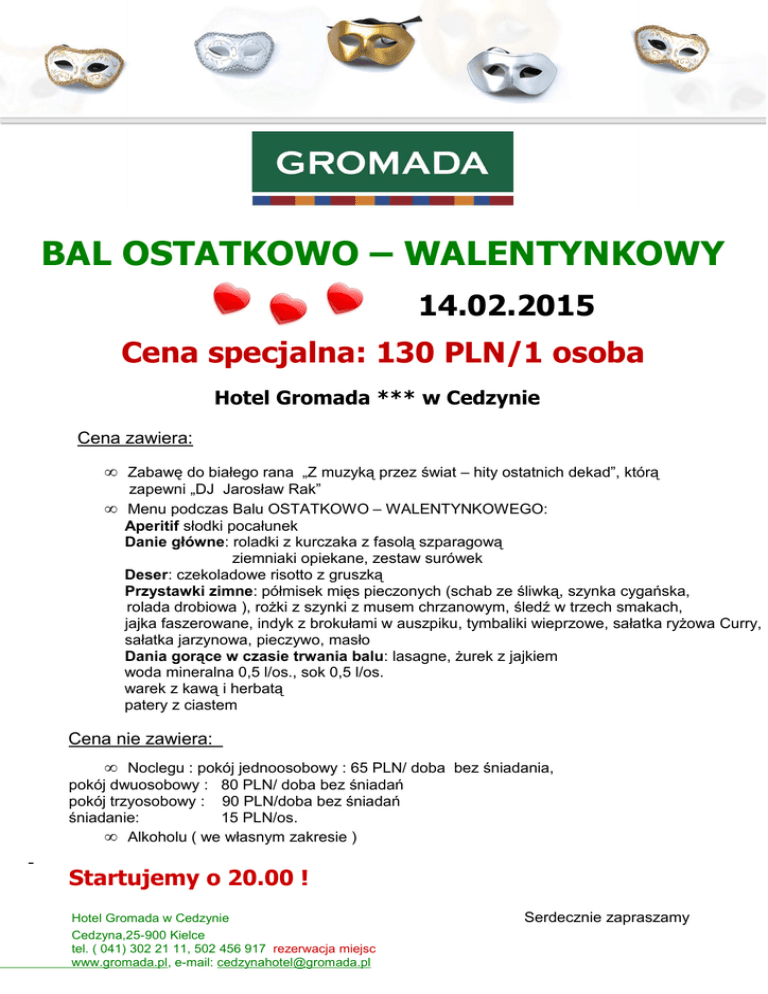 BAL OSTATKOWO – WALENTYNKOWY 14.02.2015 Cena specjalna: 130 PLN/1 osoba Hotel Gromada *** w Cedzynie Cena zawiera: • Zabawę do białego rana „Z muzyką przez świat – hity ostatnich dekad”, którą zapewni „DJ Jarosław Rak” • Menu podczas Balu OSTATKOWO – WALENTYNKOWEGO: Aperitif słodki pocałunek Danie główne: roladki z kurczaka z fasolą szparagową ziemniaki opiekane, zestaw surówek Deser: czekoladowe risotto z gruszką Przystawki zimne: półmisek mięs pieczonych (schab ze śliwką, szynka cygańska, rolada drobiowa ), rożki z szynki z musem chrzanowym, śledź w trzech smakach, jajka faszerowane, indyk z brokułami w auszpiku, tymbaliki wieprzowe, sałatka ryżowa Curry, sałatka jarzynowa, pieczywo, masło Dania gorące w czasie trwania balu: lasagne, żurek z jajkiem woda mineralna 0,5 l/os., sok 0,5 l/os. warek z kawą i herbatą patery z ciastem Cena nie zawiera: • Noclegu : pokój jednoosobowy : 65 PLN/ doba bez śniadania, pokój dwuosobowy : 80 PLN/ doba bez śniadań pokój trzyosobowy : 90 PLN/doba bez śniadań śniadanie: 15 PLN/os. • Alkoholu ( we własnym zakresie ) Startujemy o 20.00 ! Hotel Gromada w Cedzynie Cedzyna,25-900 Kielce tel. ( 041) 302 21 11, 502 456 917 rezerwacja miejsc www.gromada.pl, e-mail: [email protected] Serdecznie zapraszamy