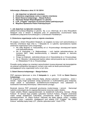 Informacje z Ratusza z dnia 31.10.12014 1. 2. 3. 4. 5. 6. Jak dojechać na lęborski cmentarz Zmieniona organizacja ruchu w rejonie cmentarza Dzień Dworca kolejowego – Stacja Kultura Obchody Święta Niepodległości w Lęborku LCK „Fregata” zaprasza na koncert pieśni patriotycznych Wspólne Śpiewanie Pieśni Patriotycznych 1. Jak dojechać na lęborski cmentarz Zakład Komunikacji Miejskiej w Lęborku Sp. z o.o. informuje, że w dniu Wszystkich Świętych oraz w dniach 2 listopada oraz 31 października, uruchomione będą dodatkowe połączenia komunikacyjne z Cmentarzem Parafialnym. 2. Zmieniona organizacja ruchu w rejonie cmentarza W związku z dniem Wszystkich Świętych, ze względu na duży ruch samochodowy w kierunku cmentarza tego dnia tj. 1 listopada br. w Lęborku wprowadzona będzie zmieniona organizacja ruchu drogowego. Na całej długości ul. Kaszubskiej od ul. Krzywoustego obowiązywał będzie ruch jednokierunkowy Na ul. Kartuskiej i ul. Majkowskiego – ruch będzie jednokierunkowy do hurtowni BAT, dalej dwukierunkowy z nakazem wyjazdu w kierunku Wejherowa Droga na Drętowie - jednokierunkowa od ul. Kaszubskiej do ul. Krzywoustego Na ul. Mieszka I obowiązywał będzie zakaz zatrzymywania się na odcinku od ul. Władysława IV do ul. Krzywoustego Ponadto osoby jadące na cmentarz samochodami muszą stosować się bezwzględnie do poleceń policjantów kierujących ruchem oraz osób ze służb pomocniczych pomagających przy organizacji ruchu w tym dniu. 3. Dzień Dworca kolejowego – Stacja Kultura PKP zaprasza lęborczan w dniu 3 listopada br. o godz. 13.00 na Dzień Dworca kolejowego. W programie m.in. występ Orkiestry Dętej „Ziemia Lęborska”. Uczestnicy - dzieci i dorośli - będą mogli sprawdzić swoją sprawność w multimedialnej grze kolejowej, wziąć udział w warsztatach architektoniczno-kolejowych oraz zabawach w budowanie kolorowej lokomotywy i dekorowanie pociągu. Budynek dworca PKP przeszedł gruntowną modernizację i remont. Samorząd Lęborka zobowiązał się do zagospodarowania znacznej części obiektu. Część obiektu Miasto zagospodarowało na działalność kulturalną, tworząc „Stację Kultura”. W ramach tego projektu Lęborskie Centrum Kultury „Fregata” przeniesie część swojej działalności kulturalnej, prowadzonej dotąd w wynajmowanych pomieszczeniach. W „Stacji Kultura” odbywać się będą zajęcia, próby i występy lęborskich grup i zespołów, działających pod opieką LCK „Fregata”. Na „Stacji Kultura” siedzibę będą miały LOT „Ziemia Lęborska-Łeba” i Koło PTTK. Dworzec PKP wraz z otoczeniem został wyremontowany i zmodernizowany przez PKP S.A. w ramach ogólnopolskiego programu, do którego zakwalifikowano część obiektów dworcowych, pod warunkiem zobowiązania lokalnych samorządów do ich przejęcia i zagospodarowania. 4.Obchody Święta Niepodległości w Lęborku Serdecznie zapraszamy lęborczan do uczestnictwa w tegorocznych obchodach Święta Niepodległości w Lęborku w dniach 7-11 listopada br. Poniżej szczegółowy program obchodów. 7 listopada 2014 (piątek) 12.45 Wykład historyczny z okazji Dnia Niepodległości, sala audiowizualna ZSI-M – prezentacja słowno-muzyczna w wykonaniu uczniów SGJ, – Wykład: Budowa Portu Gdyńskiego w okresie międzywojennym – Dariusz Małszycki, Starszy Kustosz Działu Historycznego Muzeum Miasta Gdyni 8 listopada 2014 (sobota) 11.00 Indywidualne Biegi Przełajowe z okazji Święta niepodległości – lasek przy Stadionie Miejskim 10 listopada 2014 (poniedziałek) 18.00 Msza św. w intencji Ojczyzny – Sanktuarium św. Jakuba Ap. 18.50 Złożenie kwiatów pod tablicą upamiętniająca Ofiary Katastrofy Smoleńskiej przy Sanktuarium św. Jakuba 19.30 Uroczystość pod tablicą Polskiej Rady Ludowej – ul. Targowa 48 11 listopada 2014 (wtorek) 10.00 Msza święta w Sanktuarium św. Jakuba Ap. 11.00 przemarsz pod Obelisk Niepodległości przy Rondzie Solidarności 11.20 uroczystość przed Obeliskiem Niepodległości „Gaude Mater Polonia” – Orkiestra Dęta „Ziemia Lęborska” Hymn państwowy – Orkiestra Dęta „Ziemia Lęborska” Montaż słowno-muzyczny - Szkoła Podstawowa nr 3 wystąpienie Burmistrza Miasta Apel Pamięci, salwa honorowa – 1 Lęborski Batalion Zmechanizowany złożenie kwiatów zakończenie uroczystości – wiązanka pieśni patriotycznych w wykonaniu Orkiestry Dętej „Ziemia Lęborska” Rozstrzygnięcie konkursu „Wolna Polska na wesoło” 11.45 Parada rekonstruktorów 13.00 Wspólne śpiewanie pieśni patriotycznych - sala LCK Fregata 17.00 Koncert chóru „Wiarusy”, sala LCK Fregata 5. LCK „Fregata” zaprasza na koncert pieśni patriotycznych Lęborskie Centrum Kultury „Fregata” zaprasza na koncert z okazji Święta Niepodległości w wykonaniu Wojskowego Zespołu Wokalnego „Wiarusy”. Koncert odbędzie się 11 listopada w Kinie „Fregata” o godzinie 17:00. Wstęp wolny. W programie pieśni patriotyczne oraz piosenki wojskowe. Wojskowy Zespół Wokalny „Wiarusy” powstał w 1968 roku. W 2013 roku otrzymał prestiżową nagrodę Grand Prix Międzynarodowego Festiwalu Pieśni Żołnierskiej w Swietłogorsku (Rosja). 6. Wspólne Śpiewanie Pieśni Patriotycznych Lęborskie Centrum Kultury „Fregata” zaprasza na piąte lęborskie Wspólne Śpiewanie Pieśni Patriotycznych z okazji Święta Niepodległości. Impreza jest jedną z nielicznych okazji do wspólnego przypomnienia sobie starych polskich piosenek i pieśni patriotycznych. Odbędzie się w poniedziałek 11 listopada w Sali Kinowej LCK „Fregata” o godz. 13.00. Poprzednie edycje wspólnego śpiewania cieszyły się bardzo dużym zainteresowaniem, więc i w tym roku organizatorzy liczą, że lęborczanie będą chcieli razem pobawić się śpiewając. Imprezie będzie towarzyszyła aukcja prac wykonanych przez podopiecznych Środowiskowego Domu Samopomocy „Lwiątko”. Teksty pieśni zapewniają organizato