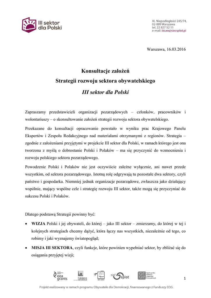 Warszawa, 16.03.2016 Konsultacje założeń Strategii rozwoju sektora obywatelskiego III sektor dla Polski Zapraszamy przedstawicieli organizacji pozarządowych – członków, pracowników i wolontariuszy – o skonsultowanie założeń strategii rozwoju sektora obywatelskiego. Przekazane do konsultacji opracowanie powstało w wyniku prac Krajowego Panelu Ekspertów i Zespołu Redakcyjnego nad materiałami otrzymanymi z regionów. Strategia – zgodnie z założeniami przyjętymi w projekcie III sektor dla Polski, w ramach którego jest ona tworzona z myślą o dobrostanie Polski i Polaków – ma się przyczynić do wzmocnienia i rozwoju polskiego sektora pozarządowego. Powodzenie Polski i Polaków nie jest oczywiście zależne wyłącznie, ani nawet przede wszystkim, od sektora pozarządowego. Istotną rolę odgrywają tu pozostałe dwa sektory, czyli państwo i gospodarka. Niemniej jednak organizacje pozarządowe, zwłaszcza jako działający wspólnie, mający wspólne cele i strategię rozwoju III sektor, także mogą się przyczyniać do sukcesu Polski i Polaków. Dlatego podstawą Strategii powinny być: WIZJA Polski i jej obywateli, do której – jako III sektor – zmierzamy, do której w tej i kolejnych strategiach chcemy dążyć, która łączy nas wszystkich, niezależnie od tego, co robimy i jaki wyznajemy światopogląd; MISJA III SEKTORA, czyli funkcje, które powinien wypełniać sektor, by zbliżać się do osiągania przyjętej wizji; 1 CELE STRATEGICZNE, które chcemy razem, jako III sektor, osiągnąć w perspektywie najbliższych pięciu lat, realizując naszą misję; ZASADY DZIAŁANIA, którymi powinniśmy się kierować, niezależnie od rodzaju podejmowanych działań; OBSZARY DZIAŁAŃ, czyli główne sfery naszej aktywności, w których powinniśmy podjąć działania, aby możliwa była realizacja zaplanowanych celów strategicznych; WYZWANIA I GŁÓWNIE KIERUNKI DZIAŁAŃ we wskazanych obszarach, służące realizacji celów strategicznych, wykorzystujące mocne strony i eliminujące lub neutralizujące słabe strony III sektora. Te właśnie – fundamentalne – elementy Strategii poddajemy konsultacjom na obecnym etapie prac. Po ich uzgodnieniu Strategia zostanie uzupełniona o wskaźniki realizacji celów, sposoby realizacji działań oraz sposoby monitorowania i oceny osiągania zakładanych wskaźników. Następnie cały dokument ponownie zostanie poddany konsultacjom. Czy akceptujecie treść WIZJI, MISJI, ZASAD DZIAŁANIA, CELÓW STRATEGICZNYCH I OBSZARÓW DZIAŁAŃ? Jakie macie propozycje modyfikacji lub uzupełnień? Prosimy Was o przedstawienie propozycji GŁÓWNYCH DZIAŁAŃ w następujących obszarach: 2 I. WIZJA POLSKI I POLAKÓW Polska jest demokratycznym państwem prawa opartym na aktywności społecznej swoich obywateli, równowadze ich praw i obowiązków oraz solidarności społecznej. Czy generalnie akceptujecie taką treść wizji? TAK NIE Jakie macie propozycje modyfikacji i/lub uzupełnień w treści wizji? II. MISJA III SEKTORA Misją III sektora jest tworzenie i wzmacnianie społeczeństwa obywatelskiego, czyli działających razem lokalnie, regionalnie i na poziomie ogólnopolskim obywateli, którzy potrafią: samodzielnie określać własne cele służące dobru wspólnemu, organizować się wokół tych celów i współpracować w oparciu o wspólne wartości i wzajemne zaufanie, współpracować z państwem i gospodarką rynkową na zasadach suwerenności i subsydiarności, wspierać tych, którzy gorzej radzą sobie z zaspokajaniem swoich potrzeb. Czy generalnie akceptujecie taką treść misji? TAK NIE Jakie macie propozycje modyfikacji i/lub uzupełnień w treści misji? 3 III. ZASADY DZIAŁANIA Organizacje w swojej działalności kierują się Kartą Zasad Działania Organizacji Pozarządowych oraz wartościami wynikającymi ze specyfiki ich aktywności. KARTA ZASAD DZIAŁANIA ORGANIZACJI POZARZĄDOWYCH przyjęta przez Walne Zebranie OFOP-u 28 maja 2010 r. Prawo do dobrowolnego zrzeszania się należy do fundamentalnych praw człowieka, a swoboda działalności i angażowania się obywateli w życie społeczne jest podstawą prawdziwej demokracji. Wśród inicjatyw i instytucji, których nie można zaliczyć ani do struktur administracji państwowej czy samorządowej, ani do sfery działań stricte gospodarczych, wyodrębnić trzeba organizacje pozarządowe, czyli powołane przez obywateli dla realizacji celów społecznych organizacje których podstawą działalności jest wolontarystyczne zaangażowanie obywateli i zewnętrzne finansowanie (darowizny, subwencje, dotacje). Są to organizacje realizujące pewną misję (tzn. działające w imię wartości lub społecznie pożytecznych celów), a nie dążące do uzyskania zysku czy zdobycia władzy. Zasady działalności tych organizacji powinny być normowane nie tylko przez przepisy prawa, ale także przez swoisty kodeks etyczny, którego podstawą są następujące zasady, przyjęte na I Ogólnopolskim Forum Inicjatyw Pozarządowych we wrześniu 1996 roku i zaktualizowane w ramach projektu Jawnie Przejrzyście Odpowiedzialnie. Zasady te zostały zaakceptowane przez Walne Zebranie Ogólnopolskiej Federacji Organizacji Pozarządowych w maju 2010 roku. Dobro wspólne Misja organizacji powinna być podstawowym wyznacznikiem podejmowanych przez nią działań. Organizacje pozarządowe w swoich działaniach kierują się zasadą poszanowania godności, praw i wolności człowieka, zasadami pomocniczości i dialogu oraz ideą dobra wspólnego. Legalizm Organizacje pozarządowe działają w ramach obowiązującego w demokratycznym państwie prawa, wpływając w ramach demokratycznych procedur na jego doskonalenie. Organizacje biorące udział w procesie stanowienia prawa muszą jasno określić, w jakim charakterze występują – jako rzecznicy interesu społecznego, w imieniu konkretnych grup zagrożonych wykluczeniem, czy też w imię innych 4 interesów. Niezależność Orga