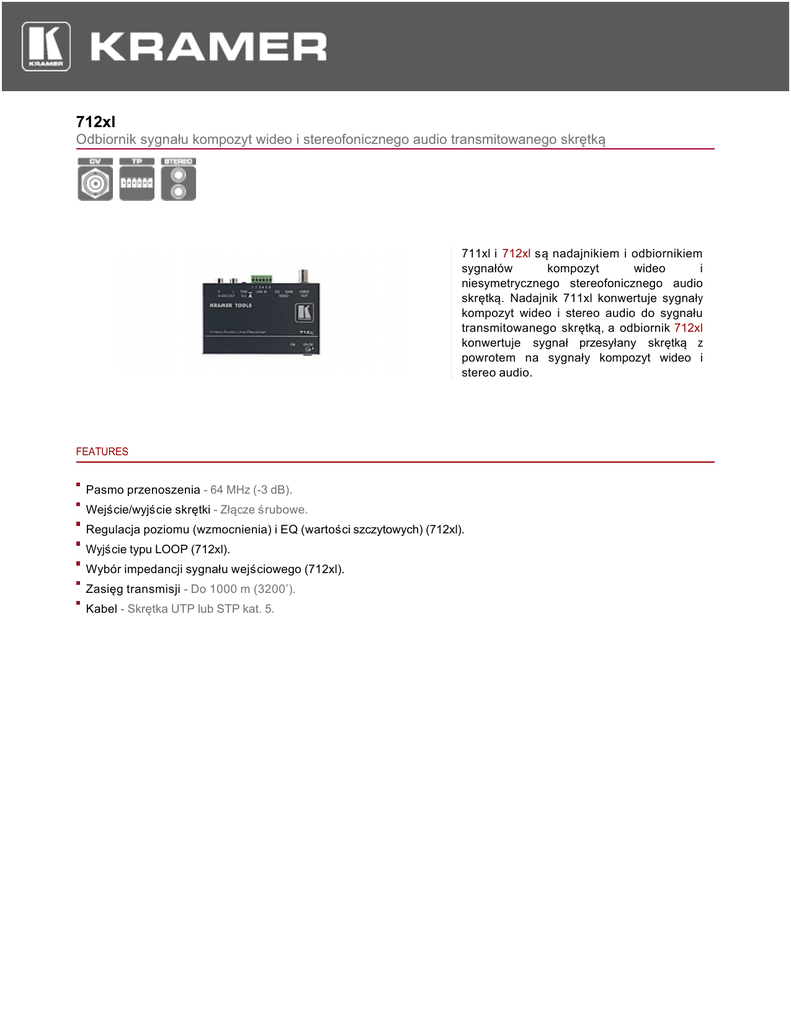 712xl Odbiornik sygnału kompozyt wideo i stereofonicznego audio transmitowanego skrętką 711xl i 712xl są nadajnikiem i odbiornikiem sygnałów kompozyt wideo i niesymetrycznego stereofonicznego audio skrętką. Nadajnik 711xl konwertuje sygnały kompozyt wideo i stereo audio do sygnału transmitowanego skrętką, a odbiornik 712xl konwertuje sygnał przesyłany skrętką z powrotem na sygnały kompozyt wideo i stereo audio. FEATURES Pasmo przenoszenia - 64 MHz (-3 dB). Wejście/wyjście skrętki - Złącze śrubowe. Regulacja poziomu (wzmocnienia) i EQ (wartości szczytowych) (712xl). Wyjście typu LOOP (712xl). Wybór impedancji sygnału wejściowego (712xl). Zasięg transmisji - Do 1000 m (3200’). Kabel - Skrętka UTP lub STP kat. 5. 712xl TECHNICAL SPECIFICATIONS WEJŚCIE: 6-pinowe złącze śrubowe. WYJŚCIE: wideo, 1 Vpp/75 Ω na złączu BNC, audio 1 Vpp/150 Ω na złączach RCA. MAKSYMALNY POZIOM SYGNAŁU: 2,1 Vpp (wideo), 4,2 Vpp (audio). PASMO PRZENOSZENIA WIDEO (-3dB): 64 MHz. PASMO PRZENOSZENIA AUDIO (-3dB): 100 kHz. WZMOCNIENIE RÓŻNICOWE: 1,4%. RÓŻNICA FAZ: 0,63 stopnia. STOSUNEK SYGNAŁ/SZUM WIDEO: 75,5 dB. STOSUNEK SYGNAŁ/SZUM AUDIO: 77,3 dB nieważony. WSPÓŁCZYNNIK ZNIEKSZTAŁCEŃ HARMONICZNYCH AUDIO: 2-ga HARMONICZNA AUDIO: 0,033%, 1 kHz. MAKSYMALNY POZIOM SYGNAŁU: 1,7 Vpp (wideo), 4,2 Vpp (audio). ŹRÓDŁO ZASILANIA: 12 VDC, 80 mA. WYMIARY: 12 cm x 7.5 cm x 2.5 cm (4.7" x 2.95" x 0.98") szer., głęb., wys. MASA: Ok. 0.28 kg (0.62 lbs). AKCESORIA: Zasilacz, zestaw montażowy. OPCJE: Mocowania do szaf rack 19": RK-T1, RK-T3. 0,002%.