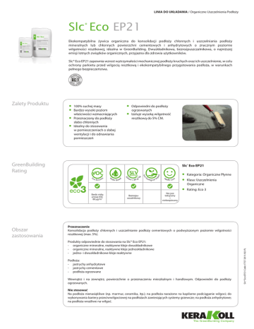 LINIA DO UKŁADANIA / Organiczne Uszczelnienia Podłoży Slc Eco EP21 ® Ekokompatybilna żywica organiczna do konsolidacji podłoży chłonnych i uszczelniania podłoży mineralnych lub chłonnych powierzchni cementowych i anhydrytowych o znacznym poziomie wilgotności resztkowej, idealna w GreenBuilding. Dwuskładnikowa, bezrozpuszczalnikowa, o najniższej emisji lotnych związków organicznych, przyjazna dla zdrowia użytkowników. Slc® Eco EP21 zapewnia wzrost wytrzymałości mechanicznej podłoży kruchych oraz ich uszczelnienie, w celu ochrony parkietu przed wilgocią resztkową i ekokompatybilnego przygotowania podłoża, w warunkach pełnego bezpieczeństwa. •• Odpowiedni do podłoży •• 100% suchej masy •• Bardzo wysoki poziom •• •• ogrzewanych •• Izoluje wysoką wilgotność właściwości wzmacniających Przeznaczony do podłoży słabo chłonnych Idealny do stosowania w pomieszczeniach o słabej wentylacji i do odnawiania pomieszczeń resztkową do 5% CM. GreenBuilding Rating lve n t ≤ 8 0 g/ Ec ological Im He alth Care •• Kategoria: Organiczne Płynne •• Klasa: Uszczelnienia Organiczne •• Rating: Eco 3 Bardo niska emisia VOC 80 µg/m3 Bezrozpuszczalnikowy Nie jest toksyczny i niebezpieczny Przeznaczenie Konsolidacja podłoży chłonnych i uszczelnianie podłoży cementowych o podwyższonym poziomie wilgotności resztkowej (max. 5%). Produkty odpowiednie do stosowania na Slc® Eco EP21: - organiczne mineralne, reaktywne kleje dwuskładnikowe - organiczne mineralne, reaktywne kleje jednoskładnikowe - jedno- i dwuskładnikowe kleje reaktywne Podłoża: - jastrychy anhydrytowe - jastrychy cementowe - podłoża ogrzewane Wewnątrz i na zewnątrz, powierzchnie o przeznaczeniu mieszkalnym i handlowym. Odpowiedni do podłoży ogrzewanych. Nie stosować Na podłoża nienasiąkliwe (np. marmur, ceramika, itp.); na podłoża narażone na kapilarne podciąganie wilgoci; do wykonywania bariery przeciwwilgociowej na podłożach zawierających systemy grzewcze; na podłoża anhydrytowe; na podłoża wrażliwe na wilgoć. Slc® Eco EP21 Code: F757 2011/02-PL Obszar zastosowania ater Ba sed So 3 W kg REDUCED w Emi ssi on Low SLV Lo ct Slc® Eco EP21 pa Zalety Produktu Technologia użycia Przygotowanie podłoży Podłoża muszą być chłonne, stabilne wymiarowo, nie ulegające deformacji, suche, nie mogą być narażone na kapilarne podciąganie wilgoci; bez pęknięć, czyste i pozbawione substancji oddzielających i pyłów. Ubytki i pęknięcia winny być naprawione przy użyciu Kerarep Eco. Powierzchnię podłoży posiadających bardzo zwartą i mało nasiąkliwą warstwę powierzchniową należy zeszlifować dla umożliwienia penetracji przez Slc® Eco EP21. Podłoża anhydrytowe muszą być przygotowane zgodnie z instrukcjami producenta. Sposób użycia Wlać składnik A do czystego pojemnika i dodać składnik B, zachowując proporcję Składnik A : Składnik B = 2 : 1, dokładnie wymieszać, najlepiej mikserem o prędkości obrotowej 300 - 600 obr./min, do uzyskania mieszaniny o jednorodnej konsystencji. Nanoszenie Jako środek do konsolidacji powierzchniowej: rozcieńczyć przy użyciu Keragrip Eco Pulep do 15% w zależności od chłonności podłoża, nanieść jednolicie przy pomocy pędzla lub wałka, przestrzegając wydajności około ≈ 200 ml/m2. Jako środek do konsolidacji wgłębnej: rozcieńczyć przy użyciu Keragrip Eco Pulep do 30% w zależności od chłonności podłoża, nanieść jednolicie przy pomocy pędzla lub wałka, przestrzegając wydajności około ≈ 300 - 400 ml/m2. Jako bariera przeciwwilgociowa (wilgotność resztkowa maks. 5% CM): rozcieńczyć przy użyciu Keragrip Eco Pulep do 15% w zależności od chłonności podłoża i nanieść jednolicie pierwszą warstwę przy pomocy pędzla lub wałka. Po całkowitym wyschnięciu nanieść w ten sam sposób drugą warstwę czystego produktu i jeżeli jest to konieczne, nanieść trzecią warstwę, po uprzednim wyschnięciu warstwy poprzedniej. Przestrzegać wydajności ≈ 300 – 400 ml/m2. W celu przygotowania zapraw syntetycznych: do wysoce wytrzymałych napraw podłoży z jastrychu cementowego zmieszać z Quarzo lub z wysuszonym piachem, aż do uzyskania zarobu o właściwej konsystencji (około 1 część Slc® Eco EP21 i 5 – 7 części piachu) i nanosić, ale dopiero po zagruntowaniu naprawianej części podłoża tymże produktem. Czyszczenie Narzędzia czyścić przy użyciu Slc® Eco Diluente 01. Po stwardnieniu produkt Slc® Eco EP21 może być usunięty jedynie mechanicznie. Bezpośrednie nakładanie dwu- i jednoskładnikowych klejów reaktywnych powinno być wykonane w ciągu kilku dni po zastosowaniu Slc® Eco EP21; dłuższy czas oczekiwania może prowadzić do problemów z przyczepnością. Jeżeli jest przewidywany dłuższy czas oczekiwania przed dalszym klejeniem, ostatnia warstwa Slc® Eco EP21, gdy jest jeszcze świeża, powinna być posypana Quarzo. Przed dalszym stosowaniem cementowych zapraw wyrównujących i samopoziomujących przed układaniem wykładzin z PVC, gumy, dywanowych, itp., stosować Keragrip Eco na Slc® Eco EP21 po całkowitym wyschnięciu, lub ostatnią warstwę Slc® Eco EP21, gdy jest jeszcze świeża, posypać Quarzo. Aby uzyskać szorstką powierzchnię o dobrej przyczepności, ostatnią warstwę Slc® Eco EP21 posypać suchym piaskiem, gdy jest jeszcze świeża. Po stwardnieniu warstwy, resztę piasku nie przylegającego do powierzchni należy usunąć. Slc® Eco EP21 Code: F757 2011/02-PL Inne wskazówki Wzór informacji technicznej dla projektantów Konsolidacja podłoży chłonnych i uszczelnianie chłonnych powierzchni cementowych o znacznym poziomie wilgotności resztkowej (max 5%) przed układaniem parkietu, realizować z użyciem ekokompatybilnej, dwuskładnikowej żywicy organicznej, o podwyższonej płynności i najwyższych właściwościach konsolidacyjnych, klasy ECO 3 GreenBuilding Rating, na przykład Slc® Eco