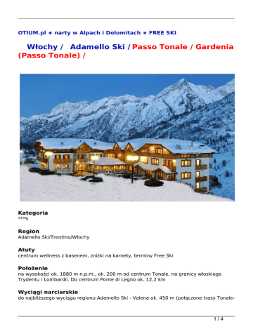 OTIUM.pl ∗ narty w Alpach i Dolomitach ∗ FREE SKI Włochy / Adamello Ski / Passo Tonale / Gardenia (Passo Tonale) / Kategoria ***S Region Adamello Ski/Trentino/Włochy Atuty centrum wellness z basenem, zniżki na karnety, terminy Free Ski Położenie na wysokości ok. 1880 m n.p.m., ok. 200 m od centrum Tonale, na granicy włoskiego Trydentu i Lombardii. Do centrum Ponte di Legno ok. 12,2 km Wyciągi narciarskie do najbliższego wyciągu regionu Adamello Ski - Valena ok. 450 m (połączone trasy Tonale- 1/4 Lodowiec Presena-Ponte di Legno-Temu). Do najbliższych wyciągów Skiarea Campiglio Dolomiti Brenta w Marilleva 900 ok. 22 km. Do tras narciarskich w Pejo ok. 24 km. Przystanek skibusa (gratis) ok. 150 m od obiektu Wyposażenie recepcja, winda, restauracja, bar, sala TV, przechowalnia sprzętu narciarskiego, parking (gratis), garaż (za opłatą, ok. 35 euro/tydz). Hotel posiada 5 pięter Internet tak (WiFi - gratis) Karty kredytowe tak (Visa, Mastercard) Sport i relaks centrum wellness (wstęp gratis, czynne w godz. 16.00-20.00) - basen, sauna, łaźnia turecka, strefa relaksacyjna, jacuzzi. Za dodatkową opłatą - solarium, masaże. Mini club dla dzieci w wieku 4-14 lat (gratis, w jęz. włoskim, angielskim) Pokoje (ok. 20-22 m<sup>2</sup>), hotel dysponuje 56 dwuosobowymi pokojami dwuosobowymi oraz pokojami dwuosobowymi z możliwością dwóch dostawek; Łazienka z WC, suszarka do włosów, TV-sat, sejf. Część pokoi posiada balkon Wyżywienie śniadania w formie wzbogaconego bufetu i ciepłe kolacje podawane przez kelnera (wybór z menu), sałatki w formie bufetu, napoje do kolacji dodatkowo płatne Pieski nie Kategoria lokalna ***S Kolacja Wigilijna w cenie Kolacja Sylwestrowa obowiązkowo płatna na miejscu 50 euro/os. Świadczenia 7 noclegów (Uwaga! w terminie 17-22.12.2016 - oferta z przejazdem autokarem, 5 noclegów, wykwaterowanie 22.12.2016 ok. 18.00, bez kolacji; w terminie 17-23.12.2016 oferta z dojazdem własnym, 6 noclegów), wyżywienie 2 x dziennie wg opisu, ubezpieczenie Signal Iduna - Bezpieczne Podróże (w tym rekreacyjne uprawianie narciarstwa zjazdowego, biegowego lub snowboardu na oznakowanych trasach 2/4 zjazdowych) - KL, KR, NNW i bagażu, opieka włoskiego kontrahenta Uwaga Zalecamy dodatkowe ubezpieczenie OC/SS (w tym sprzęt sportowy) Signal Iduna - 35 zł/os./pobyt Obowiązkowa opłata na miejscu taksa klimatyczna ok. 1-2 euro os./dzień Zakwaterowanie przyjazd - od godz. 15.00, wyjazd - do godz. 10.00 Autokar przejazd komfortowym autokarem (klimatyzacja, WC, bar, video), warunki przewozu, cennik, program i rozkład jazdy na stronie organizatora (Uwaga! W terminie 16-23.12.2016 tylko dla pobytów 5-dniowych) Zniżki (na dostawkach) i dopłaty dzieci do 6,9 lat - gratis, dzieci 7-11,9 lat - 50% zniżki, od 12 lat - 10% zniżki. W terminach Free Ski zniżki wg cen w systemie. Dopłata za ubezpieczenie od kosztów rezygnacji 2,4% Oferta Free Ski w terminach 10-17.12.2016 i 25.03-09.04.2017 - karnet 6-dniowy Superskirama Adamello Brenta w cenie; w terminie 17-22.12.2016 (oferta autokarowa) i 17-23.12.2016 - karnet 5-dniowy Adamello Ski w cenie; w terminach 17-24.12.2016 i 18-25.03.2017 - karnet 6-dniowy Adamello Ski w cenie. Uwaga! W terminie 18-25.03.2017 możliwość dopłaty do karnetu 6-dniowego Superskirama Adamello Brenta - 175 zł/os., wymagane zgłoszenie przy rezerwacji Uwaga w pozostałych terminach na podstawie Vouchera Otium zniżka ok. 23 euro/os. dorosłej przy zakupie karnetu w kasie; zniżka obowiązuje na karnety 6-dniowe Adamello Ski lub Combi 1 (5 dni Adamello Ski + jeden dzień w wybranej stacji narciarskiej Madonna di Campiglio, Marilleva-Folgarida, Pejo, Pinzolo, Andalo-Fai della Paganella, Monte Bondone, Folgaria-Lavarone). Dzieci do 8 lat - gratis (1 karnet dla dziecka gratis na 1 karnet dla osoby dorosłej) Promocja Niezmienność ceny - dla rezerwacji potwierdzonych do 30.11.2016 data skąd pobyt 24.03.2017 Bielsko - Biała 8 dni opis Pokój: Pokój 2 osobowy + dostawką Wyżywienie: śniadania+obiadokolacje cena / os 2974 zł / os 3/4 OTIUM POLSKA SP. Z O.O. 30-150 KRAKÓW UL. ARMII KRAJOWEJ 12 lok. 11 tel./fax +48-12.4469214, 12.4469215, 12.4469216, 12.4469217 Zapraszamy poniedziałek-piątek w godzinach 10.00-18.00 (soboty 10.00-14.00 od połowy listopada do połowy kwietnia) E-mail: [email protected] Strona Internetowa: www.otium.pl 4/4 Powered by TCPDF (www.tcpdf.org)
