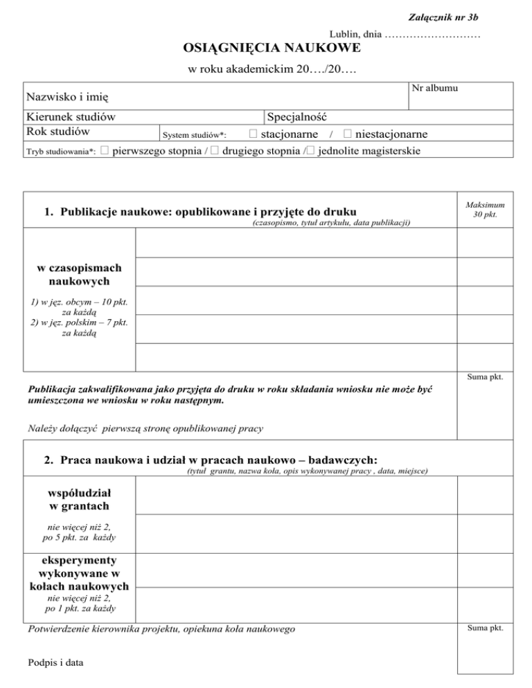 Załącznik nr 3b Lublin, dnia ……………………… OSIĄGNIĘCIA NAUKOWE w roku akademickim 20…./20…. Nr albumu Nazwisko i imię Kierunek studiów Rok studiów Tryb studiowania*: Specjalność System studiów*: pierwszego stopnia / stacjonarne / drugiego stopnia / niestacjonarne jednolite magisterskie 1. Publikacje naukowe: opublikowane i przyjęte do druku Maksimum 30 pkt. (czasopismo, tytuł artykułu, data publikacji) w czasopismach naukowych 1) w jęz. obcym – 10 pkt. za kaŜdą 2) w jęz. polskim – 7 pkt. za kaŜdą Suma pkt. Publikacja zakwalifikowana jako przyjęta do druku w roku składania wniosku nie moŜe być umieszczona we wniosku w roku następnym. NaleŜy dołączyć pierwszą stronę opublikowanej pracy 2. Praca naukowa i udział w pracach naukowo – badawczych: (tytuł grantu, nazwa koła, opis wykonywanej pracy , data, miejsce) współudział w grantach nie więcej niŜ 2, po 5 pkt. za kaŜdy eksperymenty wykonywane w kołach naukowych nie więcej niŜ 2, po 1 pkt. za kaŜdy Potwierdzenie kierownika projektu, opiekuna koła naukowego Podpis i data Suma pkt. Maksimum 30 pkt. 3. Udział w konferencjach naukowych: (nazwa konferencji, temat, data, tytuł referatu, tytuł posteru) wygłoszony referat 1) w jęz. obcym – 10 pkt. za kaŜdy 2) w jęz. polskim – 7 pkt. za kaŜdy poster 1) w jęz. obcym – 5 pkt. za kaŜdy 2) w jęz. polskim – 3 pkt. za kaŜdy Potwierdzeni kierownika projektu, opiekuna koła naukowego: Suma pkt. Podpis i data 4. Praktyki, staŜe lub ukończone kursy nie objęte programem nauczania: (nie więcej niŜ jeden w kaŜdej kategorii) (nazwa, temat, data) kursy o tematyce związanej z kierunkiem studiów poświadczone certyfikatem kompetencji 7 pkt. poświadczone certyfikatem uczestnictwa 2 pkt. co najmniej 2 tyg. 1 pkt. praktyki i staŜe co najmniej 1 m- c 2 pkt. co najmniej 2 m-ce 3 pkt. Potwierdzenie kserokopia świadectwa ukończenia kursu, praktyki, staŜu: Podpis i data Suma pkt. 5. Udział w projektach o tematyce związanej z kierunkiem studiów oraz działalność popularno-naukowa: (nie więcej niŜ 3, po 2 pkt. za kaŜdy) (nazwa, data, miejsce, rodzaj aktywności) Potwierdzenie przewodniczącego lub wiceprzewodniczącego RUSS, opiekuna redakcji wydawnictw studenckich, opiekun koła naukowego: Suma pkt. Podpis i data 6. Odbyte studia w innej uczelni w ramach programów międzynarodowych (min. 4 miesiące) – 10 pkt. potwierdzone przez Biuro Wymiany Międzynarodowej w ramach programu MostAR – 3 pkt. potwierdzone przez Dział Organizacji Studiów Suma pkt. ……………………………………. Podpis studenta Minimalna liczba punktów uprawniająca do ubiegania się o stypendium za osiągnięcia naukowe wynosi 10. W przypadku studentów I roku studiów II stopnia rozpoczynających się od semestru letniego minimalna liczba punktów wynosi 5.