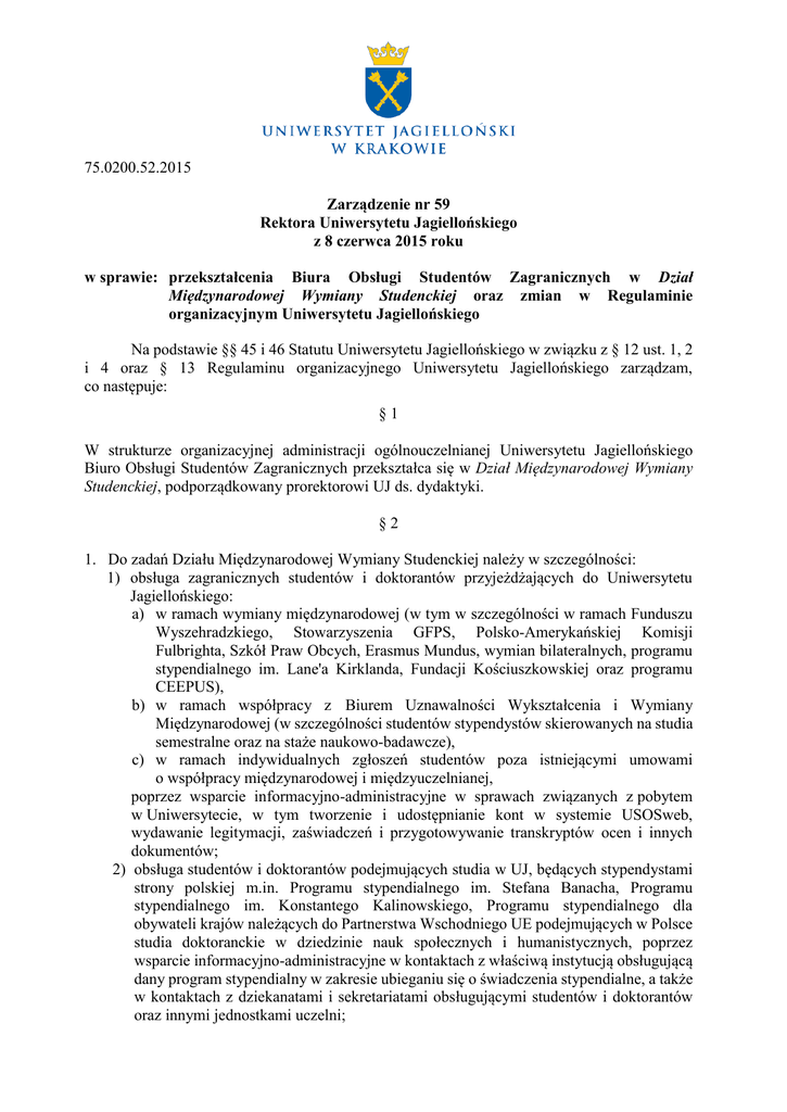 75.0200.52.2015 Zarządzenie nr 59 Rektora Uniwersytetu Jagiellońskiego z 8 czerwca 2015 roku w sprawie: przekształcenia Biura Obsługi Studentów Zagranicznych w Dział Międzynarodowej Wymiany Studenckiej oraz zmian w Regulaminie organizacyjnym Uniwersytetu Jagiellońskiego Na podstawie §§ 45 i 46 Statutu Uniwersytetu Jagiellońskiego w związku z § 12 ust. 1, 2 i 4 oraz § 13 Regulaminu organizacyjnego Uniwersytetu Jagiellońskiego zarządzam, co następuje: §1 W strukturze organizacyjnej administracji ogólnouczelnianej Uniwersytetu Jagiellońskiego Biuro Obsługi Studentów Zagranicznych przekształca się w Dział Międzynarodowej Wymiany Studenckiej, podporządkowany prorektorowi UJ ds. dydaktyki. §2 1. Do zadań Działu Międzynarodowej Wymiany Studenckiej należy w szczególności: 1) obsługa zagranicznych studentów i doktorantów przyjeżdżających do Uniwersytetu Jagiellońskiego: a) w ramach wymiany międzynarodowej (w tym w szczególności w ramach Funduszu Wyszehradzkiego, Stowarzyszenia GFPS, Polsko-Amerykańskiej Komisji Fulbrighta, Szkół Praw Obcych, Erasmus Mundus, wymian bilateralnych, programu stypendialnego im. Lane'a Kirklanda, Fundacji Kościuszkowskiej oraz programu CEEPUS), b) w ramach współpracy z Biurem Uznawalności Wykształcenia i Wymiany Międzynarodowej (w szczególności studentów stypendystów skierowanych na studia semestralne oraz na staże naukowo-badawcze), c) w ramach indywidualnych zgłoszeń studentów poza istniejącymi umowami o współpracy międzynarodowej i międzyuczelnianej, poprzez wsparcie informacyjno-administracyjne w sprawach związanych z pobytem w Uniwersytecie, w tym tworzenie i udostępnianie kont w systemie USOSweb, wydawanie legitymacji, zaświadczeń i przygotowywanie transkryptów ocen i innych dokumentów; 2) obsługa studentów i doktorantów podejmujących studia w UJ, będących stypendystami strony polskiej m.in. Programu stypendialnego im. Stefana Banacha, Programu stypendialnego im. Konstantego Kalinowskiego, Programu stypendialnego dla obywateli krajów należących do Partnerstwa Wschodniego UE podejmujących w Polsce studia doktoranckie w dziedzinie nauk społecznych i humanistycznych, poprzez wsparcie informacyjno-administracyjne w kontaktach z właściwą instytucją obsługującą dany program stypendialny w zakresie ubieganiu się o świadczenia stypendialne, a także w kontaktach z dziekanatami i sekretariatami obsługującymi studentów i doktorantów oraz innymi jednostkami uczelni; 3) współpraca z instytucjami obsługującymi programy stypendialne wymienione w pkt 1 i 2 w zakresie ustalania warunków otrzymania świadczeń stypendialnych, przekazywania dokumentacji stypendialnej, przygotowywania refundacji i innych dokumentów rozliczeniowych w tym zakresie, a także koordynacji i opracowywania zestawień statystycznych na potrzeby tych instytucji; 4) współpraca z uczelnianymi koordynatorami programów międzynarodowych, w których UJ bierze udział (tj. Erasmus Mundus, CEEPUS, program Kirklanda), a także z dziekanatami i sekretariatami obsługującymi studentów będących stypendystami programów wymienionych w pkt 1 i 2 w zakresie przekazywania dokumentacji stypendialnej, a także działań informacyjno-administracyjnych związanych z odbywaniem studiów przez stypendystów; 5) współpraca z jednostkami administracji ogólnouczelnianej w zakresie obsługi programów stypendialnych wymienionych w pkt 1 i 2; 6) koordynacja przyznawania miejsc w domach studenckich studentom zagranicznym we współpracy z Działem Nauczania, a także innymi jednostkami UJ; 7) koordynacja i opracowywanie danych statystycznych dotyczących studentów zagranicznych i studentów UJ wyjeżdżających za granicę, we współpracy z dziekanatami i jednostkami administracji ogólnouczelnianej; 8) obsługa studentów zagranicznych oraz współpraca z dziekanatami i sekretariatami obsługującymi studentów, a także jednostkami administracji ogólnouczelnianej, w zakresie organizacji i obsługi administracyjnej programów pożyczek, kredytów i świadczeń bezzwrotnych przeznaczonych dla studentów zagranicznych w ramach U.S. Department of Education's Direct Loan Program, U.S. Department of Veterans Affairs - Educational Benefit Programs i Canada-Ontario Integrated Students Loans; 9) opiniowanie umów o wspólnie prowadzonych przewodach doktorskich i prowadzenie działalności informacyjnej w tym zakresie; 10) inicjowanie, koordynacja i rozliczanie Projektu pt. Mobilność edukacyjna w sektorze szkolnictwa wyższego w ramach Programu Erasmus+ w zakresie: a) wyjazdów studentów i doktorantów na zagraniczne studia i praktyki oraz wyjazdów absolwentów na praktyki, w szczególności poprzez: współpracę z koordynatorami z jednostek uczestniczących w projekcie w organizacji procesu rekrutacji, organizację we współpracy z innymi jednostkami UJ działań promocyjno-informacyjnych dla studentów i doktorantów UJ i koordynatorów z jednostek uczestniczących w projekcie, obsługę informacyjno-administracyjną studentów i doktorantów zakwalifikowanych do wyjazdu, w tym wydawanie zaświadczeń i uzupełnianie dokumentacji projektowej, przygotowywanie umów o dofinansowaniu wyjazdów studentów i doktorantów oraz aneksów do tych umów, przygotowywanie dokumentacji finansowej niezbędnej do wypłaty dofinansowania, współpracę z dziekanatami i sekretariatami obsługującymi studentów i doktorantów, Centrum Innowacyjnego Rozwoju Społeczeństwa, Erasmus Student Network, Kwesturą UJ, współpracę z zagranicznymi koordynatorami uczelni partnerskich, opracowanie raportów postępu i końcowego na potrzeby Programu Erasmus+, obsługę platformy Mobility Tool+ i licencji OLS, b) przyjazdów studentów zagranicznych na studia poprzez: wsparcie informacyjno-administracyjne w sprawach związanych z pobytem w Uniwersytecie Jagiellońskim, w tym tworzenie i udostępnianie kont w systemie USOSweb, wydawanie legitymacji