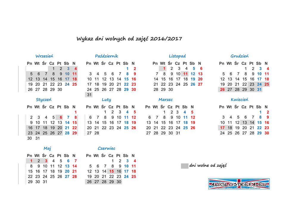 Wykaz dni wolnych od zajęć 2016/2017 Wrzesień Pn Wt Śr Cz 1 5 6 7 8 12 13 14 15 19 20 21 22 26 27 28 29 Październik Pt 2 9 16 23 30 Sb 3 10 17 24 N 4 11 18 25 Styczeń Pn Wt Śr Cz Pt Sb N 1 2 3 4 5 6 7 8 9 10 11 12 13 14 15 16 17 18 19 20 21 22 23 24 25 26 27 28 29 30 31 Maj Pn 1 8 15 22 29 Wt 2 9 16 23 30 Śr 3 10 17 24 31 Cz 4 11 18 25 Listopad Pn Wt Śr Cz Pt Sb 1 3 4 5 6 7 8 10 11 12 13 14 15 17 18 19 20 21 22 24 25 26 27 28 29 31 Luty N 2 9 16 23 30 Pn Wt 1 7 8 14 15 21 22 28 29 Śr 2 9 16 23 30 Cz 3 10 17 24 Pt 4 11 18 25 Grudzień Sb 5 12 19 26 N 6 13 20 27 Pn Wt Śr Cz 1 5 6 7 8 12 13 14 15 19 20 21 22 26 27 28 29 Sb 3 10 17 24 31 N 4 11 18 25 Pn Wt Śr Cz Pt Sb 1 3 4 5 6 7 8 10 11 12 13 14 15 17 18 19 20 21 22 24 25 26 27 28 29 N 2 9 16 23 30 Marzec Pn Wt Śr Cz Pt Sb N 1 2 3 4 5 6 7 8 9 10 11 12 13 14 15 16 17 18 19 20 21 22 23 24 25 26 27 28 Pn Wt Śr 1 6 7 8 13 14 15 20 21 22 27 28 29 Cz 2 9 16 23 30 Kwiecień Pt 3 10 17 24 31 Sb 4 11 18 25 N 5 12 19 26 Czerwiec Pt 5 12 19 26 Sb 6 13 20 27 N 7 14 21 28 Pn Wt Śr Cz 1 5 6 7 8 12 13 14 15 19 20 21 22 26 27 28 29 Pt 2 9 16 23 30 Sb 3 10 17 24 N 4 11 18 25 Pt 2 9 16 23 30 dni wolne od zajęć