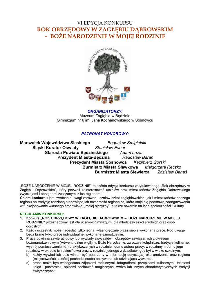 VI EDYCJA KONKURSU ROK OBRZĘDOWY W ZAGŁĘBIU DĄBROWSKIM – BOŻE NARODZENIE W MOJEJ RODZINIE ORGANIZATORZY: Muzeum Zagłębia w Będzinie Gimnazjum nr 6 im. Jana Kochanowskiego w Sosnowcu PATRONAT HONOROWY: Marszałek Województwa Śląskiego Bogusław Śmigielski Śląski Kurator Oświaty Stanisław Faber Starosta Powiatu Będzińskiego Adam Lazar Prezydent Miasta-Będzina Radosław Baran Prezydent Miasta Sosnowca Kazimierz Górski Burmistrz Miasta Sławkowa Małgorzata Reczko Burmistrz Miasta Siewierza Zdzisław Banaś „BOŻE NARODZENIE W MOJEJ RODZINIE” to szósta edycja konkursu zatytułowanego „Rok obrzędowy w Zagłębiu Dąbrowskim”, który pozwoli zainteresować uczniów oraz mieszkańców Zagłębia Dąbrowskiego zwyczajami i obrzędami związanymi z ich regionem. Celem konkursu jest zwrócenie uwagi zarówno uczniów szkół zagłębiowskich, jak i mieszkańców naszego regionu na tradycję rodzinną stanowiącą ich tożsamość regionalną, która staje się podstawą zaangażowania w funkcjonowanie własnego środowiska, „małej ojczyzny”, a także otwarcie na inne społeczności i kultury. REGULAMIN KONKURSU: 1. Konkurs „ROK OBRZĘDOWY W ZAGŁĘBIU DĄBROWSKIM – BOŻE NARODZENIE W MOJEJ RODZINIE” przeznaczony jest dla uczniów gimnazjum, dla młodzieży szkół średnich oraz osób dorosłych. 2. Każdy uczestnik może nadesłać tylko jedną, własnoręcznie przez siebie wykonaną pracę. Pod uwagę będą brane tylko prace indywidualne, wykonane samodzielnie. 3. Praca powinna zawierać opisy lub wywiady zwyczajów i obrzędów zawiązanych z okresem bożonarodzeniowym (Adwent, dzień wigilijny, Boże Narodzenie, zwyczaje kolędnicze, tradycje kulinarne, wystrój pomieszczenia itd.) praktykowanych w rodzinie i domu autora pracy, w rodzinnym domu jego rodziców w okresie ich dzieciństwa oraz w rodzinie jednego z dziadków, gdy był w wieku szkolnym; b) każdy wywiad lub opis winien być opatrzony w informację dotyczącą roku urodzenia oraz regionu (miejscowości), z której pochodzi osoba opisywana lub udzielająca wywiadu; c) praca może być wzbogacona zdjęciami rodzinnymi, fotografiami, przepisami kulinarnymi, tekstami kolęd i pastorałek, opisami zachowań magicznych, wróżb lub innych charakterystycznych tradycji świątecznych; d) praca powinna zawierać do 40 stron (format A4 + okładka) i stanowić formę zwartą np. książki, składanki, itp. (prace w formie luźnych kartek nie będą brane pod uwagę jury) e) praca powinna być opisana czytelnie, drukowanymi literami i zwierać: imię i nazwisko, adres oraz wiek autora pracy, nazwę i adres szkoły oraz telefon kontaktowy, imię i nazwisko nauczyciela lub opiekuna, ewentualnie adres zamieszkania i telefon kontaktowy osób indywidualnych. 4. Prace konkursowe należy dostarczyć do dnia 31.03.10 r. do Muzeum Zagłębia w Będzinie ul. Świerczewskiego 15, pocztą lub osobiście od poniedziałku do piątku w godz. 8.00 - 15.00, w sobotę i niedzielę w godz. 10.00 – 15.00 5. Laureaci oraz osoby wyróżnione zostaną poinformowane telefonicznie. 6. Organizatorzy przewidują podział na kategorie wiekowe: I – od 12 do 16 lat, II – powyżej 16 lat. Jury przyzna w każdej kategorii wiekowej I nagrodę o wartości ok. 1000zł, II nagrodę o wartości ok. 600zł oraz III nagrodę o wartości ok. 300zł, a także wyróżnienia w każdej kategorii. Jury wybierze również prace, które będą prezentowane razem z pracami nagrodzonymi na wystawie pokonkursowej w Muzeum Zagłębia w Będzinie. 7. Zgłoszenie pracy na konkurs jest jednoznaczne z wyrażeniem zgody na jej pozostawienie do dyspozycji organizatorów oraz na wykorzystanie zawartych w niej materiałów zgodnie z wolą organizatorów. 8. Wręczenie nagród, wyróżnień, dyplomów dla uczestników konkursu oraz otwarcie wystawy pokonkursowej będzie miało miejsce 29.04.10 r. (czwartek) w Pałacu Mieroszewskich - siedzibie Muzeum Zagłębia w Będzinie przy ul. Świerczewskiego 15. 9. Skład jury: 1) prof. Maria Z. Pulinowa - Uniwersytet Śląski w Katowicach, Wydział Nauk o Ziemi w Sosnowcu, 2) mgr Dobrawa Skonieczna - Gawlik - etnograf Muzeum Zagłębia w Będzinie, 3) mgr Joanna Adamczyk - nauczyciel języka polskiego, Gimnazjum nr 6 w Sosnowcu, 4) mgr Ewelina Boroń - nauczyciel informatyki, Gimnazjum nr 6 w Sosnowcu, 5) mgr Bartosz Gawlik - plastyk Muzeum Zagłębia w Będzinie, 6) mgr Elżbieta Gwiazda – inspektor Wydziału Edukacji UM w Będzinie, Zapraszamy do współpracy nauczycieli języka polskiego, edukacji regionalnej, historii, plastyki, muzyki, religii, opiekunów świetlic, bibliotekarzy oraz wszystkich chętnych, którym bliska jest tradycja i kultura Zagłębia Dąbrowskiego. Dodatkowych informacji udzielają: mgr Ewelina Boroń - Gimnazjum nr 6 w Sosnowcu, tel. 292 80 18 mgr Bartosz Gawlik - Muzeum Zagłębia w Będzinie, tel. 267 77 07 Regulamin dostępny będzie na stronie:www.muzeum.bedzin.pl