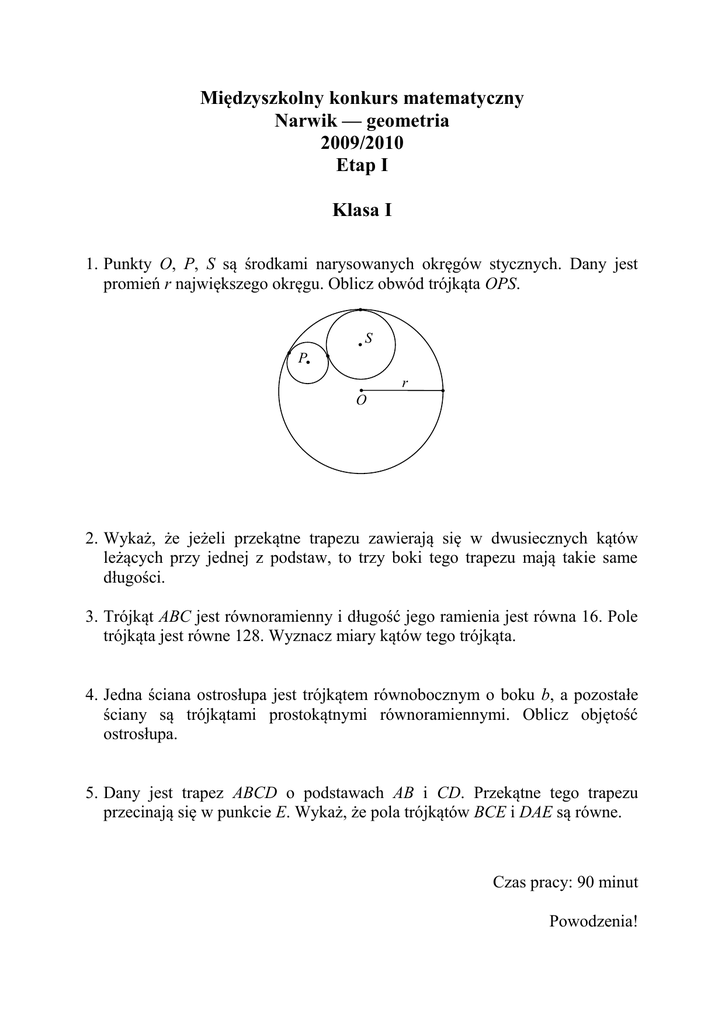 Międzyszkolny konkurs matematyczny Narwik — geometria 2009/2010 Etap I Klasa I 1. Punkty O, P, S są środkami narysowanych okręgów stycznych. Dany jest promień r największego okręgu. Oblicz obwód trójkąta OPS. S P r O 2. Wykaż, że jeżeli przekątne trapezu zawierają się w dwusiecznych kątów leżących przy jednej z podstaw, to trzy boki tego trapezu mają takie same długości. 3. Trójkąt ABC jest równoramienny i długość jego ramienia jest równa 16. Pole trójkąta jest równe 128. Wyznacz miary kątów tego trójkąta. 4. Jedna ściana ostrosłupa jest trójkątem równobocznym o boku b, a pozostałe ściany są trójkątami prostokątnymi równoramiennymi. Oblicz objętość ostrosłupa. 5. Dany jest trapez ABCD o podstawach AB i CD. Przekątne tego trapezu przecinają się w punkcie E. Wykaż, że pola trójkątów BCE i DAE są równe. Czas pracy: 90 minut Powodzenia!