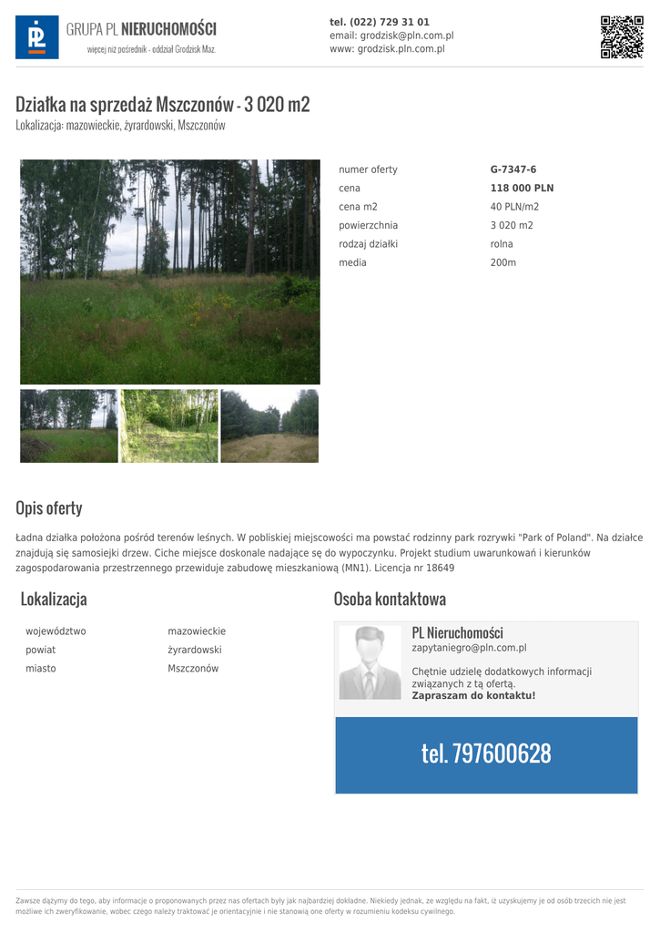 tel. (022) 729 31 01 email: [email protected] www: grodzisk.pln.com.pl Działka na sprzedaż Mszczonów - 3 020 m2 Lokalizacja: mazowieckie, żyrardowski, Mszczonów numer oferty G-7347-6 cena 118 000 PLN cena m2 40 PLN/m2 powierzchnia 3 020 m2 rodzaj działki rolna media 200m Opis oferty Ładna działka położona pośród terenów leśnych. W pobliskiej miejscowości ma powstać rodzinny park rozrywki "Park of Poland". Na działce znajdują się samosiejki drzew. Ciche miejsce doskonale nadające sę do wypoczynku. Projekt studium uwarunkowań i kierunków zagospodarowania przestrzennego przewiduje zabudowę mieszkaniową (MN1). Licencja nr 18649 Lokalizacja Osoba kontaktowa PL Nieruchomości województwo mazowieckie powiat żyrardowski [email protected] miasto Mszczonów Chętnie udzielę dodatkowych informacji związanych z tą ofertą. Zapraszam do kontaktu! tel. 797600628 Zawsze dążymy do tego, aby informacje o proponowanych przez nas ofertach były jak najbardziej dokładne. Niekiedy jednak, ze względu na fakt, iż uzyskujemy je od osób trzecich nie jest możliwe ich zweryfikowanie, wobec czego należy traktować je orientacyjnie i nie stanowią one oferty w rozumieniu kodeksu cywilnego.