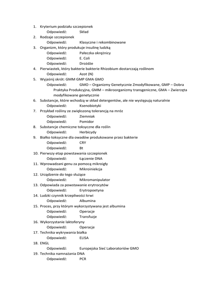 1. Kryterium podziału szczepionek Odpowiedź: Skład 2. Rodzaje szczepionek Odpowiedź: Klasyczne i rekombinowane 3. Organizm, który produkuje insulinę ludzką Odpowiedź: Pałeczka okrężnicy Odpowiedź: E. Coli Odpowiedź: Drożdże 4. Pierwiastek, który bakterie bakterie Rhizobium dostarczają roślinom Odpowiedź: Azot (N) 5. Wyjaśnij skrót: GMM GMP GMA GMO Odpowiedź: GMO – Organizmy Genetycznie Zmodyfikowane, GMP – Dobra Praktyka Produkcyjna, GMM – mikroorganizmy transgeniczne, GMA – Zwierzęta modyfikowane genetycznie 6. Substancje, które wchodzą w skład detergentów, ale nie występują naturalnie Odpowiedź: Ksenobiotyki 7. Przykład rośliny ze zwiększoną tolerancją na mróz Odpowiedź: Ziemniak Odpowiedź: Pomidor 8. Substancje chemiczne toksyczne dla roślin Odpowiedź: Herbicydy 9. Białko toksyczne dla owadów produkowane przez bakterie Odpowiedź: CRY Odpowiedź: Bt 10. Pierwszy etap powstawania szczepionek Odpowiedź: Łączenie DNA 11. Wprowadzani genu za pomocą mikroigły Odpowiedź: Mikroiniekcja 12. Urządzenie do tego służące Odpowiedź: Mikromanipulator 13. Odpowiada za powstawanie erytrocytów Odpowiedź: Erytropoetyna 14. Ludzki czynnik krzepliwości krwi Odpowiedź: Albumina 15. Proces, przy którym wykorzystywana jest albumina Odpowiedź: Operacje Odpowiedź: Transfuzje 16. Wykorzystanie laktoferyny Odpowiedź: Operacje 17. Technika wykrywania białka Odpowiedź: ELISA 18. ENGL Odpowiedź: Europejska Sied Laboratoriów GMO 19. Technika namnażania DNA Odpowiedź: PCR