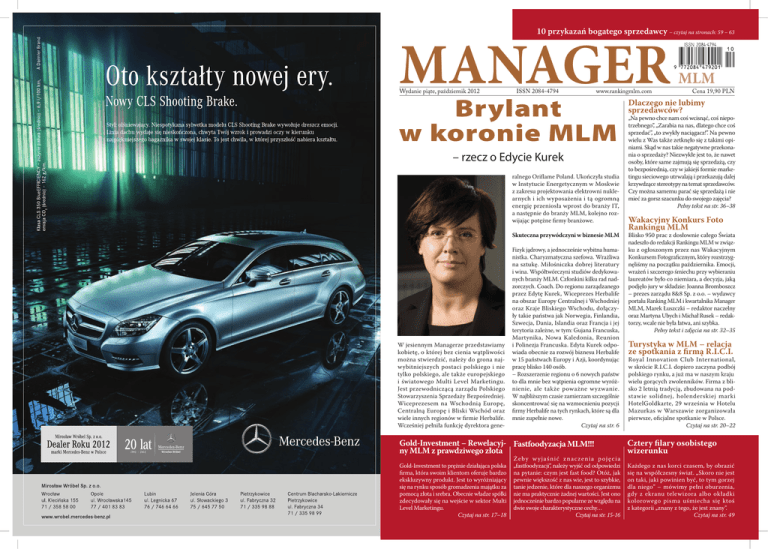 MANAGER 10 przykazań bogatego sprzedawcy – czytaj na stronach: 59 – 63 Wydanie piąte, październik 2012 ISSN 2084-4794 www.rankingmlm.com Brylant w koronie MLM – rzecz o Edycie Kurek ralnego Oriflame Poland. Ukończyła studia w Instytucie Energetycznym w Moskwie z zakresu projektowania elektrowni nuklearnych i ich wyposażenia i tą ogromną energię przeniosła wprost do branży IT, a następnie do branży MLM, kolejno rozwijając potężne firmy branżowe. Skuteczna przywódczyni w biznesie MLM W jesiennym Managerze przedstawiamy kobietę, o której bez cienia wątpliwości można stwierdzić, należy do grona najwybitniejszych postaci polskiego i nie tylko polskiego, ale także europejskiego i światowego Multi Level Marketingu. Jest przewodniczącą zarządu Polskiego Stowarzyszenia Sprzedaży Bezpośredniej. Wiceprezesem na Wschodnią Europę, Centralną Europę i Bliski Wschód oraz wiele innych regionów w firmie Herbalife. Wcześniej pełniła funkcję dyrektora gene- Fizyk jądrowy, a jednocześnie wybitna humanistka. Charyzmatyczna szefowa. Wrażliwa na sztukę. Miłośniczka dobrej literatury i wina. Współtwórczyni studiów dedykowanych branży MLM. Członkini kilku rad nadzorczych. Coach. Do regionu zarządzanego przez Edytę Kurek, Wiceprezes Herbalife na obszar Europy Centralnej i Wschodniej oraz Kraje Bliskiego Wschodu, dołączyły takie państwa jak Norwegia, Finlandia, Szwecja, Dania, Islandia oraz Francja i jej terytoria zależne, w tym: Gujana Francuska, Martynika, Nowa Kaledonia, Reunion i Polinezja Francuska. Edyta Kurek odpowiada obecnie za rozwój biznesu Herbalife w 15 państwach Europy i Azji, koordynując pracę blisko 140 osób. – Rozszerzenie regionu o 6 nowych państw to dla mnie bez wątpienia ogromne wyróżnienie, ale także poważne wyzwanie. W najbliższym czasie zamierzam szczególnie skoncentrować się na wzmocnieniu pozycji firmy Herbalife na tych rynkach, które są dla mnie zupełnie nowe. Czytaj na str. 6 MLM Cena 19,90 PLN Dlaczego nie lubimy sprzedawców? „Na pewno chce nam coś wcisnąć, coś niepotrzebnego”, „Zarabia na nas, dlatego chce coś sprzedać”, „to zwykły naciągacz!”. Na pewno wielu z Was także zetknęło się z takimi opiniami. Skąd w nas takie negatywne przekonania o sprzedaży? Niezwykłe jest to, że nawet osoby, które same zajmują się sprzedażą, czy to bezpośrednią, czy w jakiejś formie marketingu sieciowego utrwalają i przekazują dalej krzywdzące stereotypy na temat sprzedawców. Czy można samemu parać się sprzedażą i nie mieć za gorsz szacunku do swojego zajęcia? Pełny tekst na str. 36–38 Wakacyjny Konkurs Foto Rankingu MLM Blisko 950 prac z dosłownie całego Świata nadeszło do redakcji Rankingu MLM w związku z ogłoszonym przez nas Wakacyjnym Konkursem Fotograficznym, który rozstrzygnęliśmy na początku października. Emocji, wrażeń i szczerego śmiechu przy wybieraniu laureatów było co niemiara, a decyzja, jaką podjęło jury w składzie: Joanna Bromboszcz – prezes zarządu 8&8 Sp. z o.o. – wydawcy portalu Ranking MLM i kwartalnika Manager MLM, Marek Łuszczki – redaktor naczelny oraz Martyna Ubych i Michał Rusek – redaktorzy, wcale nie była łatwa, ani szybka. Pełny tekst i zdjęcia na str. 32–35 Turystyka w MLM – relacja ze spotkania z firmą R.I.C.I. Royal Innovation Club International, w skrócie R.I.C.I. dopiero zaczyna podbój polskiego rynku, a już ma w naszym kraju wielu gorących zwolenników. Firma z blisko 2 letnią tradycją, zbudowana na podstawie solidnej, holen derskiej marki HotelGoldkarte, 29 września w Hotelu Mazurkas w Warszawie zorganizowała pierwsze, oficjalne spotkanie w Polsce. Czytaj na str. 20–22 Gold-Investment – Rewelacyj- Fastfoodyzacja MLM!!! ny MLM z prawdziwego złota Cztery filary osobistego wizerunku Gold-Investment to prężnie działająca polska firma, która swoim klientom oferuje bardzo ekskluzywny produkt. Jest to wyróżniający się na rynku sposób gromadzenia majątku za pomocą złota i srebra. Obecnie władze spółki zdecydowały się na wejście w sektor Multi Level Marketingu. Czytaj na str. 17–18 Każdego z nas korci czasem, by obrazić się na współczesny świat. „Skoro nie jest on taki, jaki powinien być, to tym gorzej dla niego” – mówimy pełni oburzenia, gdy z ekranu telewizora albo okładki kolorowego pisma uśmiecha się ktoś z kategorii „znany z tego, że jest znany”. Czytaj na str. 49 Ż eby w y ja śnić z naczeni a p oj ę c i a „fastfoodyzacji”, należy wyjść od odpowiedzi na pytanie: czym jest fast food? Otóż, jak pewnie większość z nas wie, jest to szybkie, tanie jedzenie, które dla naszego organizmu nie ma praktycznie żadnej wartości. Jest ono jednocześnie bardzo popularne ze względu na dwie swoje charakterystyczne cechy… Czytaj na str. 15-16 Słowo od wydawcy Słowo od redaktora naczelnego Drodzy Czytelnicy! Mija drugi rok obecności naszych mediów na rynku. Portal Ranking MLM już na początku stycznia będzie obchodził swoje drugie urodziny. Kwartalnik Manager MLM doczekał się piątego wydania. Od kilkunastu dni możecie obserwować i oceniać nową szatę graficzną serwisu, jak również korzystać z nowych jego funkcji. Portal jest teraz jeszcze bardziej intuicyjny, czytelny i atrakcyjny dla swoich użytkowników. Dostęp do tworzonych każdego dnia materiałów jest teraz dużo prostszy i przyjazny. Sam wygląd serwisu też napawa nas dumą i mamy nadzieję, że także Wam przypadnie do gustu. Dzięki organizowanym przez naszą redakcję, a moderowanym wspólnie z Wami, rankingom serwis tętni życiem i w pełnym tego słowa znaczeniu jest interaktywny. Cieszy nas, że możemy mieć z Wami kontakt praktycznie codziennie, bardzo podoba się nam, kiedy piszecie, że od świeżego newsa w Rankingu zaczynacie swój pełen wrażeń, aktywny i biznesowo udany dzień. Wiedzcie, że budowany przez nas wspólnymi siłami serwis tworzony jest