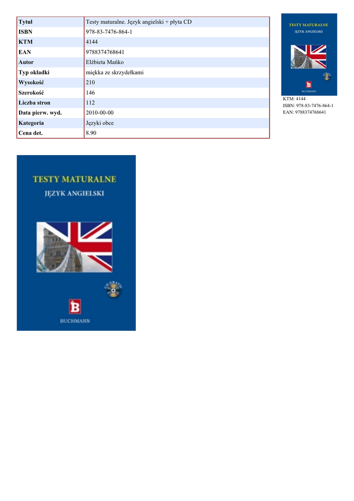 Tytuł Testy maturalne. Język angielski + płyta CD ISBN 978-83