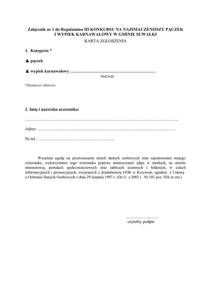Załącznik nr 1 do Regulaminu III KONKURSU NA NAJSMACZENIJSZY PĄCZEK I WYPIEK KARNAWAŁOWY W GMINIE SUWAŁKI KARTA ZGŁOSZENIA 1. Kategoria * pączek wypiek karnawałowy …………………………………………………… (nazwa) *Zaznaczyć właściwe 2. Imię i nazwisko uczestnika: ……………………………..……………………………………………………………….. Adres: ……………………………………………………………………………………. Nr tel.: ……………………………………………… Wyrażam zgodę na przetwarzanie moich danych osobowych oraz rejestrowanie mojego wizerunku, wykorzystanie tego wizerunku poprzez umieszczanie zdjęć w mediach, na stronie internetowej, portalach społecznościowych oraz tablicach ściennych i folderach, w celach informacyjnych i promocyjnych, związanych z działalnością GOK w Krzywem, zgodnie z Ustawą o Ochronie Danych Osobowych z dnia 29 sierpnia 1997 r. (Dz.U. z 2002 r. Nr 101 poz. 926 ze zm.) ………..…….…… czytelny podpis