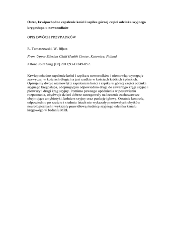 Ostre, krwipochodne zapalenie kości i szpiku górnej części odcinka szyjnego kręgosłupa u noworodków OPIS DWÓCH PRZYPADKÓW R. Tomaszewski, W. Bijata From Upper Silesian Child Health Center, Katowice, Poland J Bone Joint Surg [Br] 2011;93-B:849-852. Krwiopochodne zapalenie kości i szpiku u noworodków i niemowląt występuje zazwyczaj w kościach długich a jest rzadkie w kościach krótkich i płaskich. Opisujemy dwoje niemowląt z zapaleniem kości i szpiku w górnej części odcinka szyjnego kręgosłupa, obejmującym odpowiednio drugi do czwartego kręgi szyjne i pierwszy i drugi krąg szyjny. Pomimo pewnego opóźnienia w postawieniu rozpoznania, obydwoje dzieci dobrze zareagowały na leczenie zachowawcze obejmujące antybiotyki, kołnierz szyjny oraz punkcję igłową. Ostatnie kontrole, odpowiednio po sześciu i siedmiu latach nie wykazały przetrwałych ubytków neurologicznych i wykazały prawidłową średnicę szyjnego odcinka kanału kręgowego w badaniu MRI.