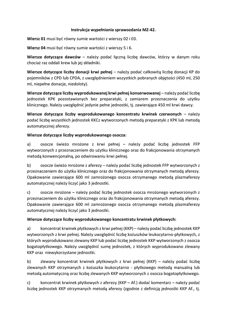 Instrukcja wypełniania sprawozdania MZ-42. Wiersz 01 musi być równy sumie wartości z wierszy 02 i 03. Wiersz 04 musi być równy sumie wartości z wierszy 5 i 6. Wiersze dotyczące dawców – należy podać łączną liczbę dawców, którzy w danym roku chociaż raz oddali krew lub jej składniki. Wiersze dotyczące liczby donacji krwi pełnej – należy podać całkowitą liczbę donacji KP do pojemników z CPD lub CPDA, z uwzględnieniem wszystkich pobranych objętości (450 ml, 250 ml, niepełne donacje, niedoloty). Wiersze dotyczące liczby wyprodukowanej krwi pełnej konserwowanej – należy podać liczbę jednostek KPK pozostawionych bez preparatyki, z zamiarem przeznaczenia do użytku klinicznego. Należy uwzględnić jedynie pełne jednostki, tj. zawierające 450 ml krwi dawcy. Wiersze dotyczące liczby wyprodukowanego koncentratu krwinek czerwonych – należy podać liczbę wszystkich jednostek KKCz wytworzonych metodą preparatyki z KPK lub metodą automatycznej aferezy. Wiersze dotyczące liczby wyprodukowanego osocza: a) osocze świeżo mrożone z krwi pełnej – należy podać liczbę jednostek FFP wytworzonych z przeznaczeniem do użytku klinicznego oraz do frakcjonowania otrzymanych metodą konwencjonalną, po odwirowaniu krwi pełnej. b) osocze świeżo mrożone z aferezy – należy podać liczbę jednostek FFP wytworzonych z przeznaczeniem do użytku klinicznego oraz do frakcjonowania otrzymanych metodą aferezy. Opakowanie zawierające 600 ml zamrożonego osocza otrzymanego metodą plazmaferezy automatycznej należy liczyć jako 3 jednostki. c) osocze mrożone – należy podać liczbę jednostek osocza mrożonego wytworzonych z przeznaczeniem do użytku klinicznego oraz do frakcjonowania otrzymanych metodą aferezy. Opakowanie zawierające 600 ml zamrożonego osocza otrzymanego metodą plazmaferezy automatycznej należy liczyć jako 3 jednostki. Wiersze dotyczące liczby wyprodukowanego koncentratu krwinek płytkowych: a) koncentrat krwinek płytkowych z krwi pełnej (KKP) – należy podać liczbę jednostek KKP wytworzonych z krwi pełnej. Należy uwzględnić liczbę kożuszków leukocytarno-płytkowych, z których wyprodukowano zlewany KKP lub podać liczbę jednostek KKP wytworzonych z osocza bogatopłytkowego. Należy uwzględnić sumę jednostek, z których wyprodukowano zlewany KKP oraz niewykorzystane jednostki. b) zlewany koncentrat krwinek płytkowych z krwi pełnej (KKP) – należy podać liczbę zlewanych KKP otrzymanych z kożuszka leukocytarno - płytkowego metodą manualną lub metodą automatyczną oraz liczbę zlewanych KKP wytworzonych z osocza bogatopłytkowego. c) koncentrat krwinek płytkowych z aferezy (KKP – Af.) dodać komentarz – należy podać liczbę jednostek KKP otrzymanych metodą aferezy (zgodnie z definicją jednostki KKP Af., tj. jednostka KKP z aferezy – krwinki płytkowe, uzyskane przy użyciu separatora komórkowego od jednego dawcy (1 donacja niezależnie od liczby pobranych płytek)). Wiersze dotyczące liczby wyprodukowanego koncentratu granulocytarnego – należy podać liczbę opakowań KG otrzymanych metodą aferezy. Wiersze dotyczące liczby wyprodukowanego jednostek krioprecypitatu – należy podać liczbę jednostek krioprecypitatu, które wyprodukowano w okresie sprawozdawczym.