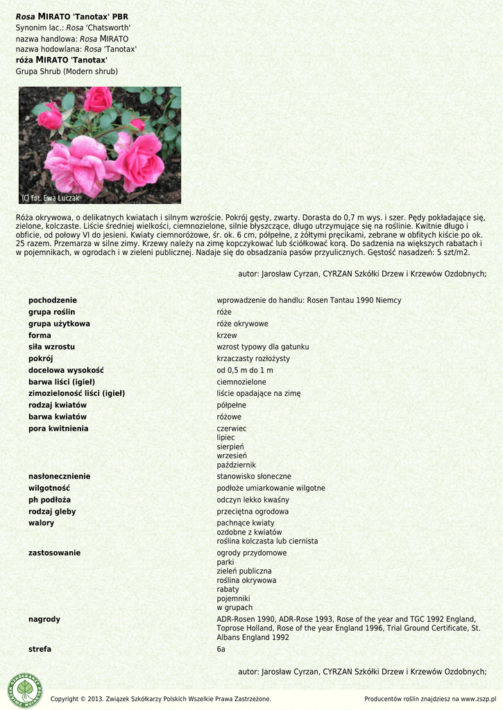 Rosa MIRATO 'Tanotax' PBR Synonim lac.: Rosa 'Chatsworth' nazwa handlowa: Rosa MIRATO nazwa hodowlana: Rosa 'Tanotax' róża MIRATO 'Tanotax' Grupa Shrub (Modern shrub) Róża okrywowa, o delikatnych kwiatach i silnym wzroście. Pokrój gęsty, zwarty. Dorasta do 0,7 m wys. i szer. Pędy pokładające się, zielone, kolczaste. Liście średniej wielkości, ciemnozielone, silnie błyszczące, długo utrzymujące się na roślinie. Kwitnie długo i obficie, od połowy VI do jesieni. Kwiaty ciemnoróżowe, śr. ok. 6 cm, półpełne, z żółtymi pręcikami, zebrane w obfitych kiście po ok. 25 razem. Przemarza w silne zimy. Krzewy należy na zimę kopczykować lub ściółkować korą. Do sadzenia na większych rabatach i w pojemnikach, w ogrodach i w zieleni publicznej. Nadaje się do obsadzania pasów przyulicznych. Gęstość nasadzeń: 5 szt/m2. autor: Jarosław Cyrzan, CYRZAN Szkółki Drzew i Krzewów Ozdobnych; pochodzenie wprowadzenie do handlu: Rosen Tantau 1990 Niemcy grupa roślin róże grupa użytkowa róże okrywowe forma krzew siła wzrostu wzrost typowy dla gatunku pokrój krzaczasty rozłożysty docelowa wysokość od 0,5 m do 1 m barwa liści (igieł) ciemnozielone zimozieloność liści (igieł) liście opadające na zimę rodzaj kwiatów półpełne barwa kwiatów różowe pora kwitnienia czerwiec lipiec sierpień wrzesień październik nasłonecznienie stanowisko słoneczne wilgotność podłoże umiarkowanie wilgotne ph podłoża odczyn lekko kwaśny rodzaj gleby przeciętna ogrodowa walory pachnące kwiaty ozdobne z kwiatów roślina kolczasta lub ciernista zastosowanie ogrody przydomowe parki zieleń publiczna roślina okrywowa rabaty pojemniki w grupach nagrody ADR-Rosen 1990, ADR-Rose 1993, Rose of the year and TGC 1992 England, Toprose Holland, Rose of the year England 1996, Trial Ground Certificate, St. Albans England 1992 strefa 6a autor: Jarosław Cyrzan, CYRZAN Szkółki Drzew i Krzewów Ozdobnych; Copyright © 2013. Związek Szkółkarzy Polskich Wszelkie Prawa Zastrzeżone. Producentów roślin znajdziesz na www.zszp.pl