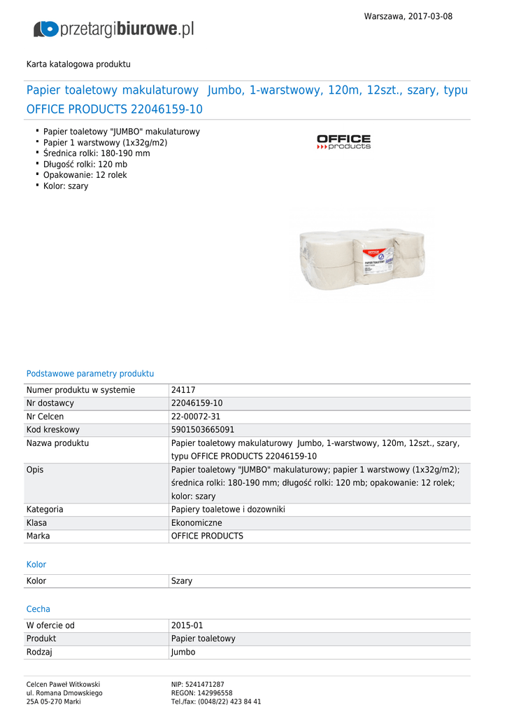 Warszawa, 2017-03-08 Karta katalogowa produktu Papier toaletowy makulaturowy Jumbo, 1-warstwowy, 120m, 12szt., szary, typu OFFICE PRODUCTS 22046159-10 Papier toaletowy "JUMBO" makulaturowy Papier 1 warstwowy (1x32g/m2) Średnica rolki: 180-190 mm Długość rolki: 120 mb Opakowanie: 12 rolek Kolor: szary Podstawowe parametry produktu Numer produktu w systemie 24117 Nr dostawcy 22046159-10 Nr Celcen 22-00072-31 Kod kreskowy 5901503665091 Nazwa produktu Papier toaletowy makulaturowy Jumbo, 1-warstwowy, 120m, 12szt., szary, typu OFFICE PRODUCTS 22046159-10 Opis Papier toaletowy "JUMBO" makulaturowy; papier 1 warstwowy (1x32g/m2); średnica rolki: 180-190 mm; długość rolki: 120 mb; opakowanie: 12 rolek; kolor: szary Kategoria Papiery toaletowe i dozowniki Klasa Ekonomiczne Marka OFFICE PRODUCTS Kolor Kolor Szary Cecha W ofercie od 2015-01 Produkt Papier toaletowy Rodzaj Jumbo Celcen Paweł Witkowski ul. Romana Dmowskiego 25A 05-270 Marki NIP: 5241471287 REGON: 142996558 Tel./fax: (0048/22) 423 84 41 Warszawa, 2017-03-08 Karta katalogowa produktu cd. Papier toaletowy makulaturowy Jumbo, 1-warstwowy, 120m, 12szt., szary, typu OFFICE PRODUCTS 22046159-10 Typ 1-warstwowy Wymiary Gramatura (g/m2) 1x32 Rozmiar 12x120mb Certyfikaty Hit Standard Nowy produkt w ofercie Standard Wspólny słownik zamówień CPV 33761000-2 Papier toaletowy Jesteśmy przekonani, że z pomocą przetargibiurowe.pl usprawnicie Państwo własne procesy biznesowe związane ze żmudnym poszukiwaniem odpowiadających Państwu produktów oraz opracowaniem specyfikacjii zapytań ofertowych. Serdecznie zapraszamy do wspópracy Zespół, PrzetargiBiurowe.pl Celcen Paweł Witkowski ul. Romana Dmowskiego 25A 05-270 Marki NIP: 5241471287 REGON: 142996558 Tel./fax: (0048/22) 423 84 41