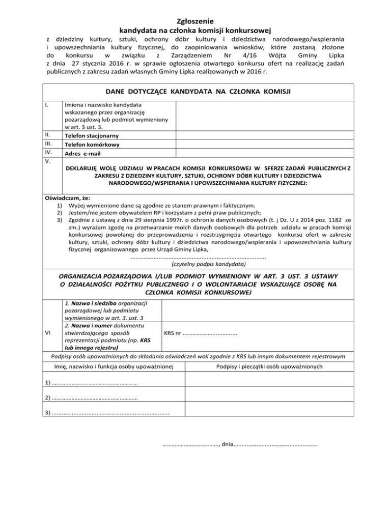 Zgłoszenie kandydata na członka komisji konkursowej z dziedziny kultury, sztuki, ochrony dóbr kultury i dziedzictwa narodowego/wspierania i upowszechniania kultury fizycznej, do zaopiniowania wniosków, które zostaną złożone do konkursu w związku z Zarządzeniem Nr 4/16 Wójta Gminy Lipka z dnia 27 stycznia 2016 r. w sprawie ogłoszenia otwartego konkursu ofert na realizację zadań publicznych z zakresu zadań własnych Gminy Lipka realizowanych w 2016 r. DANE DOTYCZĄCE KANDYDATA NA CZŁONKA KOMISJI I. II. III. IV. V. Imiona i nazwisko kandydata wskazanego przez organizację pozarządową lub podmiot wymieniony w art. 3 ust. 3. Telefon stacjonarny Telefon komórkowy Adres e-mail DEKLARUJĘ WOLĘ UDZIAŁU W PRACACH KOMISJI KONKURSOWEJ W SFERZE ZADAŃ PUBLICZNYCH Z ZAKRESU Z DZIEDZINY KULTURY, SZTUKI, OCHRONY DÓBR KULTURY I DZIEDZICTWA NARODOWEGO/WSPIERANIA I UPOWSZECHNIANIA KULTURY FIZYCZNEJ: Oświadczam, że: 1) Wyżej wymienione dane są zgodnie ze stanem prawnym i faktycznym. 2) Jestem/nie jestem obywatelem RP i korzystam z pełni praw publicznych; 3) Zgodnie z ustawą z dnia 29 sierpnia 1997r. o ochronie danych osobowych (t. j Dz. U z 2014 poz. 1182 ze zm.) wyrażam zgodę na przetwarzanie moich danych osobowych dla potrzeb udziału w pracach komisji konkursowej powołanej do przeprowadzenia i rozstrzygnięcia otwartego konkursu ofert w zakresie kultury, sztuki, ochrony dóbr kultury i dziedzictwa narodowego/wspierania i upowszechniania kultury fizycznej organizowanego przez Urząd Gminy Lipka, .................................................................................. (czytelny podpis kandydata) ORGANIZACJA POZARZĄDOWA I/LUB PODMIOT WYMIENIONY W ART. 3 UST. 3 USTAWY O DZIAŁALNOŚCI POŻYTKU PUBLICZNEGO I O WOLONTARIACIE WSKAZUJĄCE OSOBĘ NA CZŁONKA KOMISJI KONKURSOWEJ 1. Nazwa i siedziba organizacji pozarządowej lub podmiotu wymienionego w art. 3. ust. 3 2. Nazwa i numer dokumentu VI stwierdzającego sposób KRS nr ................................. reprezentacji podmiotu (np. KRS lub innego rejestru) Podpisy osób upoważnionych do składania oświadczeń woli zgodnie z KRS lub innym dokumentem rejestrowym Imię, nazwisko i funkcja osoby upoważnionej Podpisy i pieczątki osób upoważnionych 1) ………………………………………………… 2) ………………………………………………… 3) ....................................................................... ………………………………., dnia...................................................
