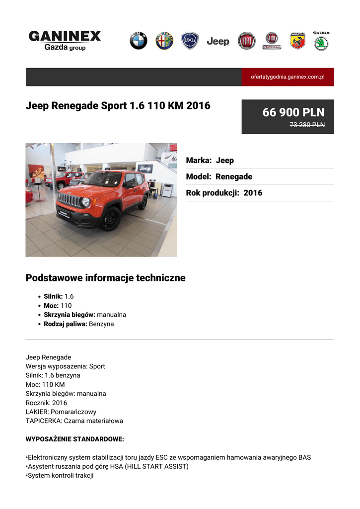 ofertatygodnia.ganinex.com.pl Jeep Renegade Sport 1.6 110 KM 2016 66 900 PLN 73 280 PLN Marka: Jeep Model: Renegade Rok produkcji: 2016 Podstawowe informacje techniczne Silnik: 1.6 Moc: 110 Skrzynia biegów: manualna Rodzaj paliwa: Benzyna Jeep Renegade Wersja wyposażenia: Sport Silnik: 1.6 benzyna Moc: 110 KM Skrzynia biegów: manualna Rocznik: 2016 LAKIER: Pomarańczowy TAPICERKA: Czarna materiałowa WYPOSAŻENIE STANDARDOWE: •Elektroniczny system stabilizacji toru jazdy ESC ze wspomaganiem hamowania awaryjnego BAS •Asystent ruszania pod górę HSA (HILL START ASSIST) •System kontroli trakcji •Boczne fotelowe poduszki powietrzne z przodu •Monitorowanie ciśnienia kół z wyświetlaczem •Elektroniczny hamulec postojowy •Fotel kierowcy regulowany manualnie w 6-ciu płaszczyznach •Podłokietnik tylny z uchwytem na kubki •Klimatyzacja manualna •Elektrycznie otwierane okna, przednie otwierana/zamykana jednym naciśnięciem •Gniazdo 12V w bagażniku •6 głośników •Radio VP2 5" ekran dotykowy z Bluetooth (bez DAB i CD) •Sterowanie radiem w kole kierownicy •3,5" monochromatyczny wyświetlacz TFT w zestawie wskaźników WYPOSAŻENIE DODATKOWE: •Lakier pomarańczowy •Koło zapasowe dojazdowe •Podwójna podłoga bagażnika Katowice Katowice (Škoda) Pszczyna Gliwice Gliwice (BMW) al. Roździeńskiego 170 tel. 32 351 27 50 al. Roździeńskiego 182 tel. 32 203 66 00 ul. Bielska 31c tel. 32 210 10 00 ul. Pszczyńska 306 tel. 32 230 17 30 ul. Pszczyńska 322 tel. 32 700 10 00