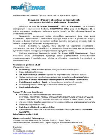 Wydawnictwo INFO-INWEST zaprasza serdecznie na wydarzenie z cyklu: Elewacje i Fasady obiektów komercyjnych wyzwaniem Architekta, Wykonawcy i Inwestora Odbędzie się ono 26 lutego (czwartek) 2015 w Warszawie, w stylowym, ekologicznym i nowoczesnym budynku GREENWINGS Office przy ul 17-Stycznia 48, w którym najnowsze rozwiązania techniczne oparte zostały na idei odpowiedzialności za środowisko naturalne. Wydarzenie poświęcone będzie niezwykłym wyzwaniom, jakie stoją przed architektami, wykonawcami i inwestorami wpisując nowe dzieła w przestrzeń miejską. Elewacje są bardzo istotnym elementem każdego budynku, pomysłowa elewacja staje się znakiem szczególnym, wizytówką każdej inwestycji. Gościć będziemy w budynku, który powstał we współpracy dewelopera i renomowanej pracowni JEMS Architekci, a nadrzędnymi zasadami przy jego projektowaniu były zrównoważony rozwój i wysoka sprawność energetyczna obiektu. Gościem specjalnym Wydarzenia będzie Pan Prezes OKRE Development Ronni Richardson. OKRE Development dysponuje ponad piętnastoletnim doświadczeniem międzynarodowym i specjalistyczną wiedzą w dziedzinie zarządzania inwestycjami w nieruchomościach. Rozpoczęcie godzina 11.00 W programie min.: GreenWings Office – nowoczesność funkcjonalność i innowacyjność Mapa dobrej Architektury. Jak ożywić elewację z metalu? Sposób na niepowtarzalny charakter obiektu. Wpływ podnoszenia standardu energetycznego budynków na bezpieczeństwo pożarowe w świetle nowelizacji Rozporządzenia o Warunkach Technicznych. Projektowanie dachów i fasad z wykorzystaniem bezpłatnych narzędzi Green Wings Office - elewacje aluminiowe - technika wykonania. Iluminacja budynków. Podczas Wydarzenia dodatkowo: konsultacje na stoiskach i materiały Partnerów: PERFOPOL, ROCKWOOL POLSKA, STOWARZYSZENIE DAFA, WSC WITOLD SZYMANIK, BAMIX CERAMIKA, XENO LIGHTING POLAND, PRO-SERVICE, SEKOCENBUD, PROFIL dla uczestników bezpłatna promocja wybranego projektu na anglojęzycznym portalu materiały uzupełniające firm:, Zwiedzanie obiektu GreenWings Office. upominki dla uczestników oraz materiały wydawnicze min.; iPOD oraz DALMIERZE LASEROWE Zakończenie godz. 15.00 Wydarzenie objęli Patronatem: - Stowarzyszenie Wykonawców Dachów Płaskich i Fasad DAFA - Ośrodek Wdrożeń Ekonomiczno – Organizacyjnych Budownictwa PROMOCJA 1 Organizator: Info-Inwest Tel. 225 321 400; 225 321 407 [email protected] www.pracowniaeventow.pl Zapraszamy serdecznie ARCHITEKTÓW, WYKONAWCÓW I INWESTORÓW do udziału w spotkaniu i stworzenia Mapy Dobrej Architektury GreenWings Office przy ul. 17-Stycznia 48 Zapraszamy do rejestracji na bezpłatny udział w konferencji pod numerem tel.: 22 532 14 07 lub e-mail: [email protected] Patronat Honorowy: Patronat Merytoryczny: Partnerzy: Patronat medialny: 2 Organizator: Info-Inwest Tel. 225 321 400; 225 321 407 [email protected] www.pracowniaeventow.pl