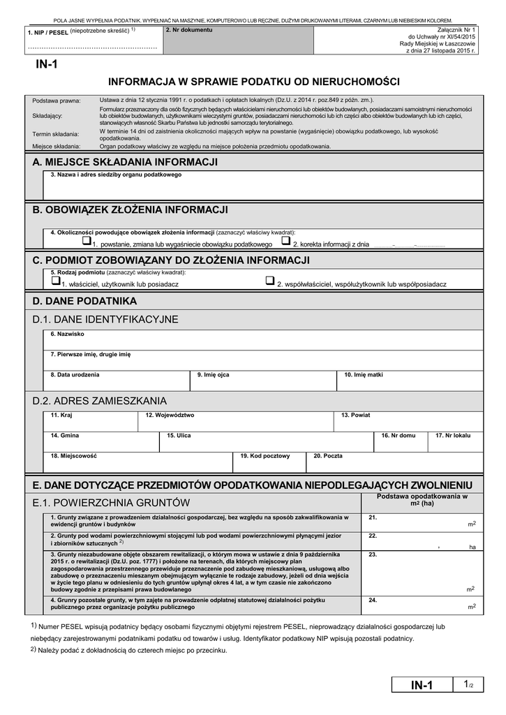 POLA JASNE WYPEŁNIA PODATNIK. WYPEŁNIAĆ NA MASZYNIE, KOMPUTEROWO LUB RĘCZNIE, DUŻYMI DRUKOWANYMI LITERAMI, CZARNYM LUB NIEBIESKIM KOLOREM. 1. NIP / PESEL (niepotrzebne skreślić) 1) Załącznik Nr 1 do Uchwały nr XI/54/2015 Rady Miejskiej w Łaszczowie z dnia 27 listopada 2015 r. 2. Nr dokumentu ………………………………………………… IN-1 INFORMACJA W SPRAWIE PODATKU OD NIERUCHOMOŚCI Ustawa z dnia 12 stycznia 1991 r. o podatkach i opłatach lokalnych (Dz.U. z 2014 r. poz.849 z późn. zm.). Podstawa prawna: Formularz przeznaczony dla osób fizycznych będących właścicielami nieruchomości lub obiektów budowlanych, posiadaczami samoistnymi nieruchomości lub obiektów budowlanych, użytkownikami wieczystymi gruntów, posiadaczami nieruchomości lub ich części albo obiektów budowlanych lub ich części, stanowiących własność Skarbu Państwa lub jednostki samorządu terytorialnego. W terminie 14 dni od zaistnienia okoliczności mających wpływ na powstanie (wygaśnięcie) obowiązku podatkowego, lub wysokość opodatkowania. Organ podatkowy właściwy ze względu na miejsce położenia przedmiotu opodatkowania. Składający: Termin składania: Miejsce składania: A. MIEJSCE SKŁADANIA INFORMACJI 3. Nazwa i adres siedziby organu podatkowego B. OBOWIĄZEK ZŁOŻENIA INFORMACJI 4. Okoliczności powodujące obowiązek złożenia informacji (zaznaczyć właściwy kwadrat): 1. powstanie, zmiana lub wygaśniecie obowiązku podatkowego 2. korekta informacji z dnia …….……–………..…–………………… C. PODMIOT ZOBOWIĄZANY DO ZŁOŻENIA INFORMACJI 5. Rodzaj podmiotu (zaznaczyć właściwy kwadrat): 1. właściciel, użytkownik lub posiadacz 2. współwłaściciel, współużytkownik lub współposiadacz D. DANE PODATNIKA D.1. DANE IDENTYFIKACYJNE 6. Nazwisko 7. Pierwsze imię, drugie imię 9. Imię ojca 8. Data urodzenia 10. Imię matki D.2. ADRES ZAMIESZKANIA 11. Kraj 14. Gmina 12. Województwo 13. Powiat 15. Ulica 18. Miejscowość 16. Nr domu 19. Kod pocztowy 17. Nr lokalu 20. Poczta E. DANE DOTYCZĄCE PRZEDMIOTÓW OPODATKOWANIA NIEPODLEGAJĄCYCH ZWOLNIENIU E.1. POWIERZCHNIA GRUNTÓW Podstawa opodatkowania w m2 (ha) 1. Grunty związane z prowadzeniem działalności gospodarczej, bez względu na sposób zakwalifikowania w ewidencji gruntów i budynków 21. 2. Grunty pod wodami powierzchniowymi stojącymi lub pod wodami powierzchniowymi płynącymi jezior i zbiorników sztucznych 2) 22. 3. Grunty niezabudowane objęte obszarem rewitalizacji, o którym mowa w ustawie z dnia 9 października 2015 r. o rewitalizacji (Dz.U. poz. 1777) i położone na terenach, dla których miejscowy plan zagospodarowania przestrzennego przewiduje przeznaczenie pod zabudowę mieszkaniową, usługową albo zabudowę o przeznaczeniu mieszanym obejmującym wyłącznie te rodzaje zabudowy, jeżeli od dnia wejścia w życie tego planu w odniesieniu do tych gruntów upłynął okres 4 lat, a w tym czasie nie zakończono budowy zgodnie z przepisami prawa budowlanego 23. 4. Grunry pozostałe grunty, w tym zajęte na prowadzenie odpłatnej statutowej działalności pożytku publicznego przez organizacje pożytku publicznego 24. m2 , ha m2 m2 1) Numer PESEL wpisują podatnicy będący osobami fizycznymi objętymi rejestrem PESEL, nieprowadzący działalności gospodarczej lub niebędący zarejestrowanymi podatnikami podatku od towarów i usług. Identyfikator podatkowy NIP wpisują pozostali podatnicy. 2) Należy podać z dokładnością do czterech miejsc po przecinku. IN-1 1/2 POLA JASNE WYPEŁNIA PODATNIK. WYPEŁNIAĆ NA MASZYNIE, KOMPUTEROWO LUB RĘCZNIE, DUŻYMI DRUKOWANYMI LITERAMI, CZARNYM LUB NIEBIESKIM KOLOREM. E.2. POWIERZCHNIA BUDYNKÓW LUB ICH CZĘŚCI Podstawa opodatkowania w m2 1. Mieszkalne w tym kondygnacji o wysokości: - ogółem 25. m2 - od 1,40 do 2,20 m (zaliczyć 50% powierzchni) 26. - powyżej 2,20 m 27. m2 m2 2. Związane z prowadzeniem działalności gospodarczej oraz budynki mieszkalne lub ich części zajęte na prowadzenie działalności gospodarczej - ogółem w tym kondygnacji o wysokości: 29. - powyżej 2,20 m 30. m2 m2 m2 32. - powyżej 2,20 m 33. m2 m2 34. m2 - od 1,40 do 2,20 m (zaliczyć 50% powierzchni) 35. - powyżej 2,20 m 36. m2 m2 5. Pozostałe, w tym zajęte na prowadzenie odpłatnej statutowej działalności pożytku publicznego przez organizacje pożytku publicznego – ogółem w tym kondygnacji o wysokości: 31. - od 1,40 do 2,20 m (zaliczyć 50% powierzchni) 4. Związane z udzielaniem świadczeń zdrowotnych w rozumieniu przepisów o działalności leczniczej, zajęte przez podmioty udzielające tych świadczeń w tym kondygnacji o wysokości: m2 - od 1,40 do 2,20 m (zaliczyć 50% powierzchni) 3. Zajęte na prowadzenie działalności gospodarczej w zakresie obrotu kwalifikowanym materiałem siewnym ogółem w tym kondygnacji o wysokości: 28. 37. m2 - od 1,40 do 2,20 m (zaliczyć 50% powierzchni) 38. - powyżej 2,20 m 39. m2 m2 E.3. WARTOŚĆ BUDOWLI LUB ICH CZĘŚCI ZWIĄZANYCH Z PROWADZENIEM DZIAŁALNOŚCI GOSPODARCZEJ Podstawa opodatkowania w pełnych złotych3) Budowle 40. zł F. INFORMACJA O ZAŁĄCZNIKACH (do niniejszej informacji dołączono) 41. Liczba załączników ZN-1/A 42. Załącznik ZN-1/B składany (zaznaczyć właściwy kwadrat): 1. tak ……………………………… 2. nie G. OŚWIADCZENIE I PODPIS PODATNIKA / OSOBY REPREZENTUJĄCEJ PODATNIKA 43. Imię 44. Nazwisko 45. Data wypełnienia informacji (dzień - miesiąc - rok) 46. Podpis (pieczęć) podatnika / osoby reprezentującej podatnika 4) H. ADNOTACJE ORGANU PODATKOWEGO 47. Uwagi organu podatkowego 48. Data (dzień - miesiąc - rok) 49. Podpis przyjmującego formularz 3) Podstawy opodatkowania zaokrągla się do pełnych złotych w ten sposób, że końcówki kwot wynoszące mniej niż 50 groszy pomija się, a końcówki kwot wynoszące 50 i więcej groszy podwyższa się do pełnych złotych. 4) Niepotrzebne skreślić. IN-1 2/2
