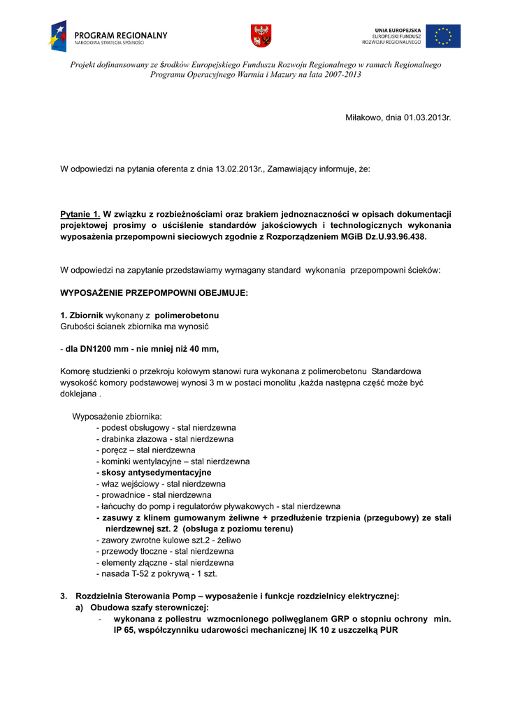 Projekt dofinansowany ze środków Europejskiego Funduszu Rozwoju Regionalnego w ramach Regionalnego Programu Operacyjnego Warmia i Mazury na lata 2007-2013 Miłakowo, dnia 01.03.2013r. W odpowiedzi na pytania oferenta z dnia 13.02.2013r., Zamawiający informuje, Ŝe: Pytanie 1. W związku z rozbieŜnościami oraz brakiem jednoznaczności w opisach dokumentacji projektowej prosimy o uściślenie standardów jakościowych i technologicznych wykonania wyposaŜenia przepompowni sieciowych zgodnie z Rozporządzeniem MGiB Dz.U.93.96.438. W odpowiedzi na zapytanie przedstawiamy wymagany standard wykonania przepompowni ścieków: WYPOSAśENIE PRZEPOMPOWNI OBEJMUJE: 1. Zbiornik wykonany z polimerobetonu Grubości ścianek zbiornika ma wynosić - dla DN1200 mm - nie mniej niŜ 40 mm, Komorę studzienki o przekroju kołowym stanowi rura wykonana z polimerobetonu Standardowa wysokość komory podstawowej wynosi 3 m w postaci monolitu ,kaŜda następna część moŜe być doklejana . WyposaŜenie zbiornika: - podest obsługowy - stal nierdzewna - drabinka złazowa - stal nierdzewna - poręcz – stal nierdzewna - kominki wentylacyjne – stal nierdzewna - skosy antysedymentacyjne - właz wejściowy - stal nierdzewna - prowadnice - stal nierdzewna - łańcuchy do pomp i regulatorów pływakowych - stal nierdzewna - zasuwy z klinem gumowanym Ŝeliwne + przedłuŜenie trzpienia (przegubowy) ze stali nierdzewnej szt. 2 (obsługa z poziomu terenu) - zawory zwrotne kulowe szt.2 - Ŝeliwo - przewody tłoczne - stal nierdzewna - elementy złączne - stal nierdzewna - nasada T-52 z pokrywą - 1 szt. 3. Rozdzielnia Sterowania Pomp – wyposaŜenie i funkcje rozdzielnicy elektrycznej: a) Obudowa szafy sterowniczej: - wykonana z poliestru wzmocnionego poliwęglanem GRP o stopniu ochrony min. IP 65, współczynniku udarowości mechanicznej IK 10 z uszczelką PUR - - wyposaŜona w drzwi wewnętrzne z tworzywa sztucznego, na których są zainstalowane (na sitodruku obrazu pompowni): kontrolki: poprawności zasilania, awarii ogólnej, awarii pompy nr 1, awarii pompy nr 2, pracy pompy nr 1, pracy pompy nr 2; wyłącznik główny zasilania, przełącznik trybu pracy pompowni (Ręczna – 0 – Automatyczna); przyciski Startu i Stopu pompy w trybie pracy ręcznej; stacyjka z kluczem o wymiarach: 800(wysokość)x600(szerokość)x300(głębokość) wyposaŜona w płytę montaŜową z blachy ocynkowanej o grubości 2mm wyposaŜona w co najmniej dwa zamki patentowe w drzwiach zewnętrznych posadzona na cokole plastikowym, umoŜliwiającym montaŜ/demontaŜ wszystkich kabli (np. zasilających, od czujników pływakowych i sondy hydrostatycznej, itd.) bez konieczności demontaŜu obudowy szafy sterowniczej b) Urządzenia elektryczne: - moduł telemetryczny GSM/GPRS/EDGE posiadający co najmniej wyposaŜenie i moŜliwości wymienione w podpunkcie e) - panel dotykowy serwisowy (kolorowy) LCD - czujnik poprawnej kolejności i zaniku faz - układ grzejny 50W wraz z elektronicznym termostatem - czteropolowe zabezpieczenie klasy C - przetwornik prądowy do monitorowania prądu pompy - wyłącznik róŜnicowo-prądowy czteropolowy 25A - wyłącznik główny sieć-agregat 60 - gniazdo agregatu 16A/5P w zabudowie tablicowej - gniazdo serwisowe 230V/10A wraz z jednopolowym wyłącznikiem nadmiarowoprądowym klasy B10 - wyłącznik silnikowy, jako zabezpieczenie kaŜdej pompy przed przeciąŜeniem i zanikiem napięcia na dowolnej fazie zasilającej - stycznik dla kaŜdej pompy - jednopolowy wyłącznik nadmiarowo prądowy klasy B dla fazy sterującej - zasilacz buforowy 24 VDC/1 A wraz z układem akumulatorów - syrenka alarmowa 24 VDC z osobnymi wejściami dla zasilania sygnału dźwiękowego i optycznego - przełącznik trybu pracy (Ręczna – 0 – Automatyczna) - wyłącznik krańcowy otwarcia drzwi szafy sterowniczej - hermetyczny wyłącznik krańcowy otwarcia włazu przepompowni - stacyjka umoŜliwiająca rozbrojenia obiektu - sonda hydrostatyczna z wyjściem prądowym (4-20mA) o zakresie 0-4m H2O wraz z dwoma pływakami (suchobieg i poziom alarmowy) oraz z łańcuchem ze stali nierdzewnej - dla mocy ≥ 5,5kW - rozruch soft-start; - antena typu YAGI dla sygnału GPRS modułu telemetrycznego (w przypadku wysokiego poziomu mocy sygnału GSM wystarczy zastosowanie anteny typu Telesat2 – z montaŜem na obudowie szafy sterowniczej) - Oświetlenie wewnętrzne szafy c) Sterowanie w oparciu o moduł telemetryczny GSM/GPRS, do którego wchodzą następujące sygnały (UWAGA!!! - wszystkie sygnały binarne mają być wyprowadzone z przekaźników pomocniczych): 2 • Wejścia (24VDC): - - tryb pracy (Ręczny/Automatyczny) zasilanie na obiekcie (prawidłowe/nieprawidłowe) potwierdzenie pracy pompy nr 1 potwierdzenie pracy pompy nr 2 awaria pompy nr 1 – kontrola zabezpieczenia termicznego pompy i wyłącznika silnikowego awaria pompy nr 2 – kontrola zabezpieczenia termicznego pompy i wyłącznika silnikowego kontrola otwarcia drzwi i włazu pompowni kontrola pływaka suchobiegu kontrola pływaka alarmowego – przelania kontrola rozbrojenia stacyjki • - wejścia analogowe (4…20mA): sygnał z sondy hydrostatycznej (4…20 mA) zabezpieczony bezpiecznikiem 32mA sygnał z przekładników prądowych (4...20mA) • - Wyjścia (załączanie przekaźników napięciem 24VDC): załączanie pompy nr 1 załączenie pompy nr 2 załączenie sygnału alarmowego sygnalizatora – awaria zbiorcza pompowni załączenie rewersyjne pompy nr 1 załączenie rewersyjne pompy nr 2 załączenie wyjścia włamania – do podłączenia niezaleŜnej centralki alarmowej - d) Rozdzielnia Sterowania Pomp powinna zapewniać: - naprzemienną pracę pomp - automatyczne przełączenie pomp w chwili wystąpienia awarii lub braku potwierdzenia pracy - kontrolę termików pompy i wyłączników silnikowych - funkcje czyszczenia zbiornika – spompowanie ścieków poniŜej poziomu suchobiegu – tylko dla pracy ręcznej - w momencie awarii sondy hydrostatycznej, pr