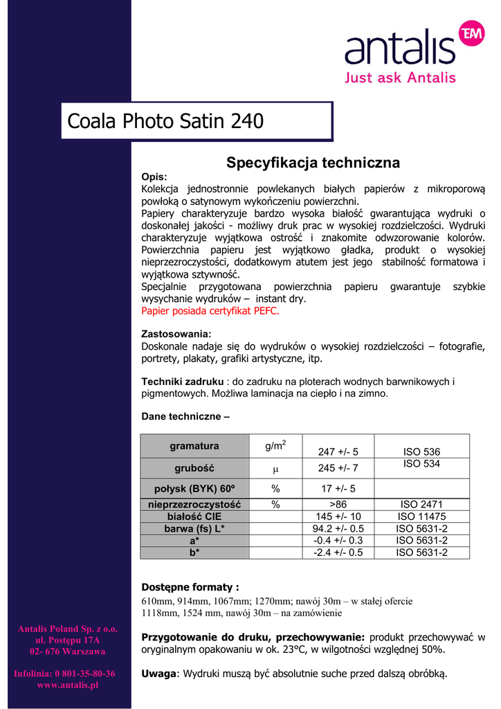 Coala Photo Satin 240 Specyfikacja techniczna Opis: Kolekcja jednostronnie powlekanych białych papierów z mikroporową powłoką o satynowym wykończeniu powierzchni. Papiery charakteryzuje bardzo wysoka białość gwarantująca wydruki o doskonałej jakości - możliwy druk prac w wysokiej rozdzielczości. Wydruki charakteryzuje wyjątkowa ostrość i znakomite odwzorowanie kolorów. Powierzchnia papieru jest wyjątkowo gładka, produkt o wysokiej nieprzezroczystości, dodatkowym atutem jest jego stabilność formatowa i wyjątkowa sztywność. Specjalnie przygotowana powierzchnia papieru gwarantuje szybkie wysychanie wydruków – instant dry. Papier posiada certyfikat PEFC. Zastosowania: Doskonale nadaje się do wydruków o wysokiej rozdzielczości – fotografie, portrety, plakaty, grafiki artystyczne, itp. Techniki zadruku : do zadruku na ploterach wodnych barwnikowych i pigmentowych. Możliwa laminacja na ciepło i na zimno. Dane techniczne – gramatura g/m2 grubość 245 +/- 7 połysk (BYK) 60º % 17 +/- 5 nieprzezroczystość białość CIE barwa (fs) L* a* b* % >86 145 +/- 10 94.2 +/- 0.5 -0.4 +/- 0.3 -2.4 +/- 0.5 247 +/- 5 ISO 536 ISO 534 ISO 2471 ISO 11475 ISO 5631-2 ISO 5631-2 ISO 5631-2 Dostępne formaty : 610mm, 914mm, 1067mm; 1270mm; nawój 30m – w stałej ofercie 1118mm, 1524 mm, nawój 30m – na zamówienie Antalis Poland Sp. z o.o. ul. Postępu 17A 02- 676 Warszawa Infolinia: 0 801-35-80-36 www.antalis.pl Przygotowanie do druku, przechowywanie: produkt przechowywać w oryginalnym opakowaniu w ok. 23°C, w wilgotności względnej 50%. Uwaga: Wydruki muszą być absolutnie suche przed dalszą obróbką.