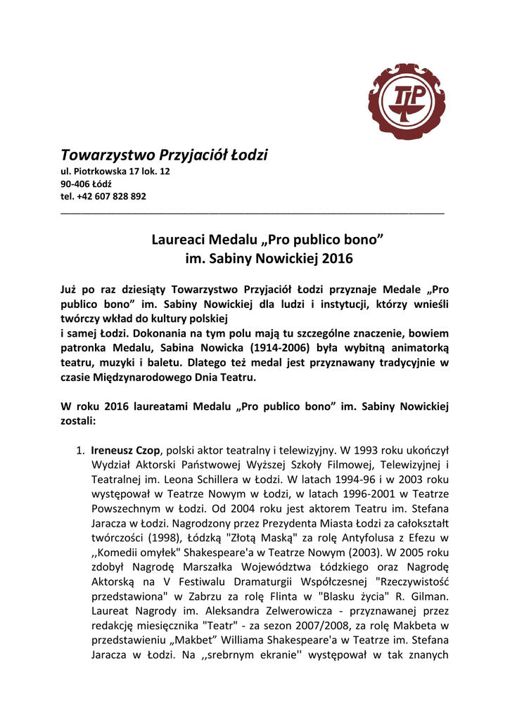 Towarzystwo Przyjaciół Łodzi ul. Piotrkowska 17 lok. 12 90-406 Łódź tel. +42 607 828 892 ___________________________________________________________________________ Laureaci Medalu „Pro publico bono” im. Sabiny Nowickiej 2016 Już po raz dziesiąty Towarzystwo Przyjaciół Łodzi przyznaje Medale „Pro publico bono” im. Sabiny Nowickiej dla ludzi i instytucji, którzy wnieśli twórczy wkład do kultury polskiej i samej Łodzi. Dokonania na tym polu mają tu szczególne znaczenie, bowiem patronka Medalu, Sabina Nowicka (1914-2006) była wybitną animatorką teatru, muzyki i baletu. Dlatego też medal jest przyznawany tradycyjnie w czasie Międzynarodowego Dnia Teatru. W roku 2016 laureatami Medalu „Pro publico bono” im. Sabiny Nowickiej zostali: 1. Ireneusz Czop, polski aktor teatralny i telewizyjny. W 1993 roku ukończył Wydział Aktorski Państwowej Wyższej Szkoły Filmowej, Telewizyjnej i Teatralnej im. Leona Schillera w Łodzi. W latach 1994-96 i w 2003 roku występował w Teatrze Nowym w Łodzi, w latach 1996-2001 w Teatrze Powszechnym w Łodzi. Od 2004 roku jest aktorem Teatru im. Stefana Jaracza w Łodzi. Nagrodzony przez Prezydenta Miasta Łodzi za całokształt twórczości (1998), Łódzką "Złotą Maską" za rolę Antyfolusa z Efezu w ,,Komedii omyłek" Shakespeare'a w Teatrze Nowym (2003). W 2005 roku zdobył Nagrodę Marszałka Województwa Łódzkiego oraz Nagrodę Aktorską na V Festiwalu Dramaturgii Współczesnej "Rzeczywistość przedstawiona" w Zabrzu za rolę Flinta w "Blasku życia" R. Gilman. Laureat Nagrody im. Aleksandra Zelwerowicza - przyznawanej przez redakcję miesięcznika "Teatr" - za sezon 2007/2008, za rolę Makbeta w przedstawieniu „Makbet” Williama Shakespeare'a w Teatrze im. Stefana Jaracza w Łodzi. Na ,,srebrnym ekranie'' występował w tak znanych produkcjach, jak: ,,Słodko gorzki'', ,,Samo życie'', ,,Generał - zamach na Gibraltarze'' i ,,Pokłosie''. 2. Krystyna Bartczak, dyrektor klubu Związku Nauczycielstwa Polskiego, od lat współpracuje z Towarzystwem Przyjaciół Łodzi. Organizowała ogólnopolskie zjazdy Krystyn, upowszechnia łódzką kulturę. 3. Strażnicy Tradycji - młodzieżowa grupa założona w Zespole Szkół na 19 w Łodzi, która podejmuje różnorodne działania popularyzujące historię Łodzi i kraju, asystuje podczas wszystkich uroczystości patriotycznych w Łodzi, wyróżnia się jednolitymi strojami. W tym roku po raz czwarty Towarzystwo Przyjaciół Łodzi wraz z Fundacją im. Wiesława Nowickiego przyzna dodatkowo Nagrodę im. Wiesława Nowickiego (1946-2012), znanego i cenionego aktora teatralnego i filmowego, publicysty, dziennikarza, reżysera teatralnego, działacza kulturalnego, propagatora muzyki klasycznej i poety; urodzonego w Łodzi, gdzie w roku 1968 ukończył Wydział Aktorski Państwowej Wyższej Szkoły Teatralnej i Filmowej im. Leona Schillera. Działał w wielu teatrach; był aktorem Teatru Polskiego w Poznaniu, grał w Teatrze Nowym w Łodzi, w latach 1973-85 występował w Teatrze Wybrzeże w Gdańsku (będąc także w latach 1974-77 sekretarzem literackim za dyrekcji Stanisława Hebanowskiego). Wiesław Nowicki był również kierownikiem literackim gdańskiego Teatru Miniatura, doradcą literackim Teatru Ziemi Pomorskiej w Grudziądzu, konsultantem programowym Teatru im. Juliusza Słowackiego w Koszalinie oraz konsultantem programowym Teatru Polskiego w Bydgoszczy. Na deskach Teatru Wybrzeże zagrał m.in. w „Weselu” Stanisława Wyspiańskiego w reżyserii Stanisława Hebanowskiego (1977), w „Białym małżeństwie” Tadeusza Różewicza w reżyserii Ryszarda Majora (1976) oraz w „Sprawie Dantona” Stanisławy Przybyszewskiej w reżyserii Macieja Karpińskiego (1980). (źródło: www.wieslawnowicki.org) Nagroda ma na celu wyróżnienie i wspieranie rozwoju młodych łódzkich talentów w dziedzinie sztuki, filmu i teatru. Laureatem Nagrody im. Wiesława Nowickiego została utalentowana malarka, absolwentka wydziału Grafiki i Malarstwa w Łódzkiej Akademii Sztuk Pięknych im. Władysława Strzemińskiego: Natalia Kalisz. Natalia Kalisz (ur. 1988, Łódź) w 2007 roku podjęła studia na Wydziale Grafiki i Malarstwa w Łódzkiej Akademii Sztuk Pięknych im. Władysława Strzemińskiego. Otrzymała dwa dyplomy z wyróżnieniem - licencjacki w Pracowni Technik Drzeworytniczych i Książki Artystycznej oraz magisterski w Pracowni Sitodruku i Graficznych Technik Łączonych. Aneksy wykonała w pracowniach Malarstwa i Rysunku. W swoim dorobku artystycznym ma wystawy indywidualne oraz liczne wystawy zbiorowe. Autorka akcji artystycznych, laureatka nagród, współorganizatorka kulturalnych wydarzeń (m.in. Otwarte Pracownie Księży Młyn w ramach Nocy Muzeów 2014 i Łódź Design Festival 2013 i 2014) i warsztatów artystycznych malarskich i graficznych. Od 2014 roku członkini Łódzkiego Stowarzyszenia Artystów ElArt. Artystka w 2013 roku otworzyła Pracownię Malarstwa, Grafiki warsztatowej i Fotografii na Księżym Młynie w Łodzi. W swojej twórczości łączy techniki graficzne z malarstwem olejnym, fotografią oraz technikami rysunkowymi. W obrazach przytacza różne wizje pochodzenia świata, osobiste wyobrażenia na temat natury człowieka, cyklu narodzin, życia i przemijania. Czerpie inspiracje z ekspresji późnogotyckich ołtarzy, jak i XVIII-wiecznego klasycyzmu czy XIX-wiecznego malarstwa symbolicznego. (źródło: www.nataliakalisz.pl) Uroczystość wręczenia Medali „Pro publico bono” im Sabiny Nowickiej jak i przyznanie Nagrody im. Wiesława Nowickiego odbędzie się 19 marca 2016r. o godz. 19:00 w Teatrze im. Stefana Jaracza (mała scena), ul. Kilińskiegoc 45 w Łodzi. Serdecznie zapraszamy. Ryszard Bonisławski Prezes Towarzystwa Przyjaciół Łodzi