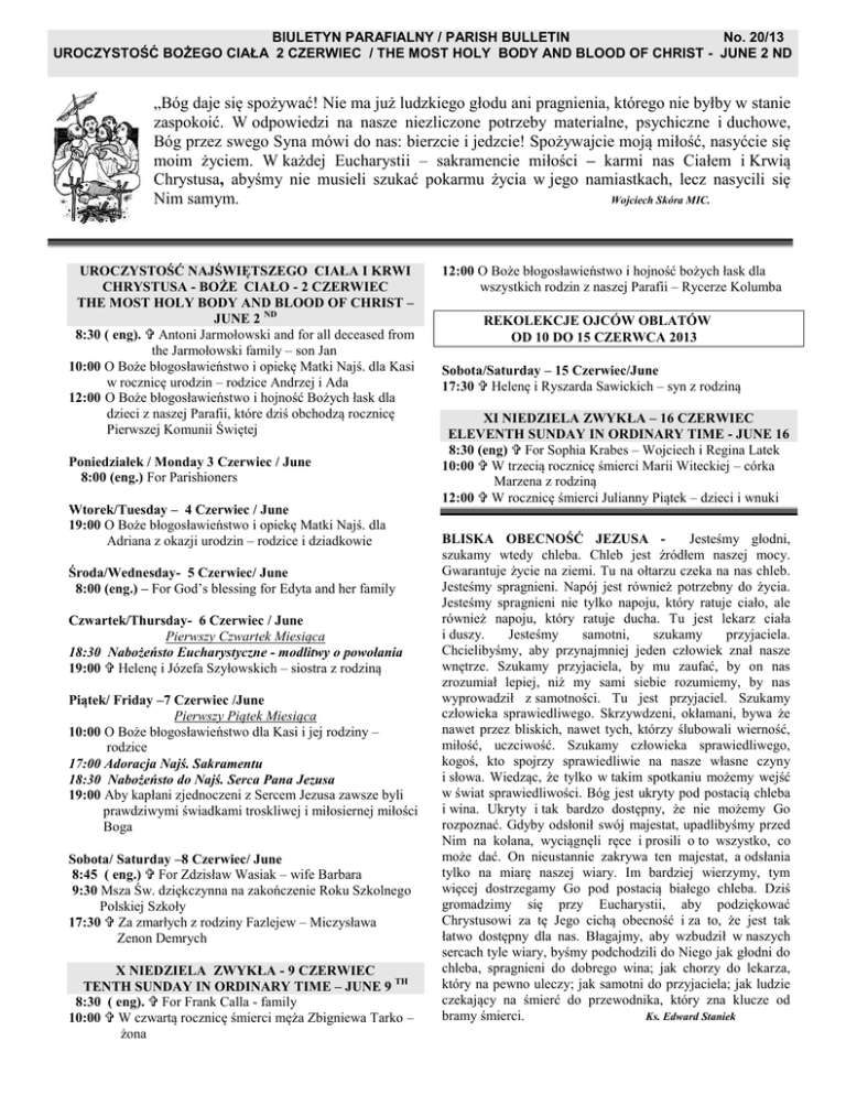 BIULETYN PARAFIALNY / PARISH BULLETIN No. 20/13 UROCZYSTOŚĆ BOŻEGO CIAŁA 2 CZERWIEC / THE MOST HOLY BODY AND BLOOD OF CHRIST - JUNE 2 ND „Bóg daje się spożywać! Nie ma już ludzkiego głodu ani pragnienia, którego nie byłby w stanie zaspokoić. W odpowiedzi na nasze niezliczone potrzeby materialne, psychiczne i duchowe, Bóg przez swego Syna mówi do nas: bierzcie i jedzcie! Spożywajcie moją miłość, nasyćcie się moim życiem. W każdej Eucharystii – sakramencie miłości – karmi nas Ciałem i Krwią Chrystusa, abyśmy nie musieli szukać pokarmu życia w jego namiastkach, lecz nasycili się Nim samym. Wojciech Skóra MIC. UROCZYSTOŚĆ NAJŚWIĘTSZEGO CIAŁA I KRWI CHRYSTUSA - BOŻE CIAŁO - 2 CZERWIEC THE MOST HOLY BODY AND BLOOD OF CHRIST – JUNE 2 ND 8:30 ( eng). Antoni Jarmołowski and for all deceased from the Jarmołowski family – son Jan 10:00 O Boże błogosławieństwo i opiekę Matki Najś. dla Kasi w rocznicę urodzin – rodzice Andrzej i Ada 12:00 O Boże błogosławieństwo i hojność Bożych łask dla dzieci z naszej Parafii, które dziś obchodzą rocznicę Pierwszej Komunii Świętej Poniedziałek / Monday 3 Czerwiec / June 8:00 (eng.) For Parishioners Wtorek/Tuesday – 4 Czerwiec / June 19:00 O Boże błogosławieństwo i opiekę Matki Najś. dla Adriana z okazji urodzin – rodzice i dziadkowie Środa/Wednesday- 5 Czerwiec/ June 8:00 (eng.) – For God’s blessing for Edyta and her family Czwartek/Thursday- 6 Czerwiec / June Pierwszy Czwartek Miesiąca 18:30 Nabożeństo Eucharystyczne - modlitwy o powołania 19:00 Helenę i Józefa Szyłowskich – siostra z rodziną Piątek/ Friday –7 Czerwiec /June Pierwszy Piątek Miesiąca 10:00 O Boże błogosławieństwo dla Kasi i jej rodziny – rodzice 17:00 Adoracja Najś. Sakramentu 18:30 Nabożeństo do Najś. Serca Pana Jezusa 19:00 Aby kapłani zjednoczeni z Sercem Jezusa zawsze byli prawdziwymi świadkami troskliwej i miłosiernej miłości Boga Sobota/ Saturday –8 Czerwiec/ June 8:45 ( eng.) For Zdzisław Wasiak – wife Barbara 9:30 Msza Św. dziękczynna na zakończenie Roku Szkolnego Polskiej Szkoły 17:30 Za zmarłych z rodziny Fazlejew – Miczysława Zenon Demrych X NIEDZIELA ZWYKŁA - 9 CZERWIEC TENTH SUNDAY IN ORDINARY TIME – JUNE 9 TH 8:30 ( eng). For Frank Calla - family 10:00 W czwartą rocznicę śmierci męża Zbigniewa Tarko – żona 12:00 O Boże błogosławieństwo i hojność bożych łask dla wszystkich rodzin z naszej Parafii – Rycerze Kolumba REKOLEKCJE OJCÓW OBLATÓW OD 10 DO 15 CZERWCA 2013 Sobota/Saturday – 15 Czerwiec/June 17:30 Helenę i Ryszarda Sawickich – syn z rodziną XI NIEDZIELA ZWYKŁA – 16 CZERWIEC ELEVENTH SUNDAY IN ORDINARY TIME - JUNE 16 8:30 (eng) For Sophia Krabes – Wojciech i Regina Latek 10:00 W trzecią rocznicę śmierci Marii Witeckiej – córka Marzena z rodziną 12:00 W rocznicę śmierci Julianny Piątek – dzieci i wnuki BLISKA OBECNOŚĆ JEZUSA Jesteśmy głodni, szukamy wtedy chleba. Chleb jest źródłem naszej mocy. Gwarantuje życie na ziemi. Tu na ołtarzu czeka na nas chleb. Jesteśmy spragnieni. Napój jest również potrzebny do życia. Jesteśmy spragnieni nie tylko napoju, który ratuje ciało, ale również napoju, który ratuje ducha. Tu jest lekarz ciała i duszy. Jesteśmy samotni, szukamy przyjaciela. Chcielibyśmy, aby przynajmniej jeden człowiek znał nasze wnętrze. Szukamy przyjaciela, by mu zaufać, by on nas zrozumiał lepiej, niż my sami siebie rozumiemy, by nas wyprowadził z samotności. Tu jest przyjaciel. Szukamy człowieka sprawiedliwego. Skrzywdzeni, okłamani, bywa że nawet przez bliskich, nawet tych, którzy ślubowali wierność, miłość, uczciwość. Szukamy człowieka sprawiedliwego, kogoś, kto spojrzy sprawiedliwie na nasze własne czyny i słowa. Wiedząc, że tylko w takim spotkaniu możemy wejść w świat sprawiedliwości. Bóg jest ukryty pod postacią chleba i wina. Ukryty i tak bardzo dostępny, że nie możemy Go rozpoznać. Gdyby odsłonił swój majestat, upadlibyśmy przed Nim na kolana, wyciągnęli ręce i prosili o to wszystko, co może dać. On nieustannie zakrywa ten majestat, a odsłania tylko na miarę naszej wiary. Im bardziej wierzymy, tym więcej dostrzegamy Go pod postacią białego chleba. Dziś gromadzimy się przy Eucharystii, aby podziękować Chrystusowi za tę Jego cichą obecność i za to, że jest tak łatwo dostępny dla nas. Błagajmy, aby wzbudził w naszych sercach tyle wiary, byśmy podchodzili do Niego jak głodni do chleba, spragnieni do dobrego wina; jak chorzy do lekarza, który na pewno uleczy; jak samotni do przyjaciela; jak ludzie czekający na śmierć do przewodnika, który zna klucze od bramy śmierci. Ks. Edward Staniek OGŁOSZENIA DUSZPASTERSKIE PODZIĘKOWANIE - Pragniemy gorąco podziękować za udział w dzisiejszej procesji, zwłaszcza tym, którzy budowali i dekorowali cztery ołtarze. Szczególne podziękowania kierujemy również do wszystkich, którzy pomogli w organizowaniu procesji: ministrantom, asyście, niosącym chorągwie, feretrony i inne oznaki naszej wiary. Wiara jest do pewnego stopnia sprawą osobistą, gdyż to my podejmujemy decyzję, czy opowiadamy się za Bogiem. Mamy jednakże obowiązek wyznawania jej publicznie i mężnego bronienia. Chrystus Pan wzywa do przyznania się do Niego wobec ludzi. Pamiętajmy, że świat potrzebuje dziś bardziej świadków niż nauczycieli. Słowa wprawdzie uczą, ale przykłady pociągają. Może innym potrzebne jest właśnie nasze świadectwo. Nie zapominajmy, że jako chrześcijanie mamy być solą tej ziemi w pielgrzymce wiary. POLSKIE DNI PARAFIALNE 2013 – JUŻ ZA TYDZIEŃ Głównymi organizatorami są Rycerze Kolumba przy wielkiej pomocy grup parafialnych, organizacji i ludzi dobrej woli. Już dziś serdecznie zapraszamy wszystkich parafian i całą Polonię do naszej parafii na wspólne świętowanie przy dobrym polskim jedzeniu i muzyce. PROJECT ADVANCE 2013- W tym roku 