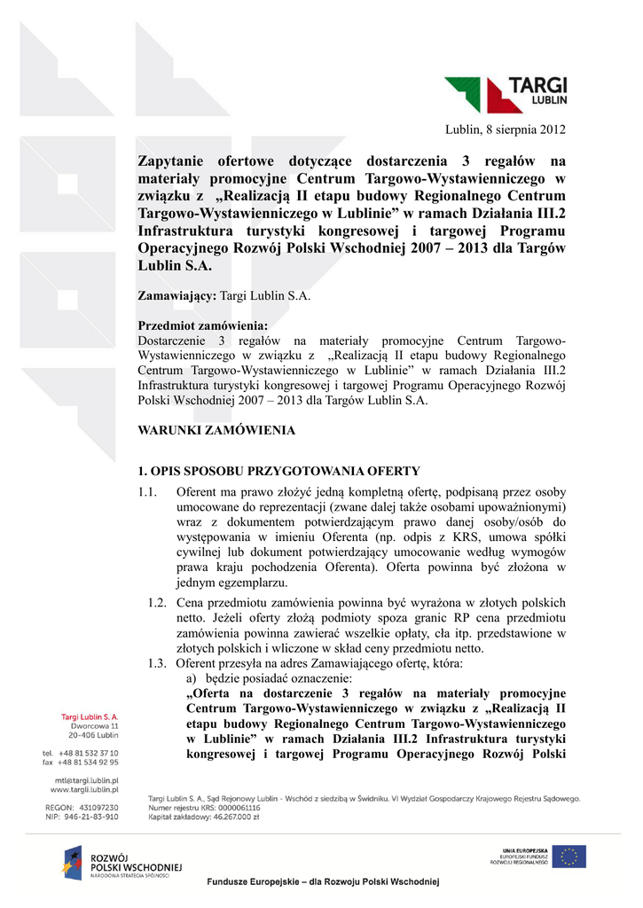 Lublin, 8 sierpnia 2012 Zapytanie ofertowe dotyczące dostarczenia 3 regałów na materiały promocyjne Centrum Targowo-Wystawienniczego w związku z „Realizacją II etapu budowy Regionalnego Centrum Targowo-Wystawienniczego w Lublinie” w ramach Działania III.2 Infrastruktura turystyki kongresowej i targowej Programu Operacyjnego Rozwój Polski Wschodniej 2007 – 2013 dla Targów Lublin S.A. Zamawiający: Targi Lublin S.A. Przedmiot zamówienia: Dostarczenie 3 regałów na materiały promocyjne Centrum TargowoWystawienniczego w związku z „Realizacją II etapu budowy Regionalnego Centrum Targowo-Wystawienniczego w Lublinie” w ramach Działania III.2 Infrastruktura turystyki kongresowej i targowej Programu Operacyjnego Rozwój Polski Wschodniej 2007 – 2013 dla Targów Lublin S.A. WARUNKI ZAMÓWIENIA 1. OPIS SPOSOBU PRZYGOTOWANIA OFERTY 1.1. Oferent ma prawo złożyć jedną kompletną ofertę, podpisaną przez osoby umocowane do reprezentacji (zwane dalej także osobami upoważnionymi) wraz z dokumentem potwierdzającym prawo danej osoby/osób do występowania w imieniu Oferenta (np. odpis z KRS, umowa spółki cywilnej lub dokument potwierdzający umocowanie według wymogów prawa kraju pochodzenia Oferenta). Oferta powinna być złożona w jednym egzemplarzu. 1.2. Cena przedmiotu zamówienia powinna być wyrażona w złotych polskich netto. Jeżeli oferty złożą podmioty spoza granic RP cena przedmiotu zamówienia powinna zawierać wszelkie opłaty, cła itp. przedstawione w złotych polskich i wliczone w skład ceny przedmiotu netto. 1.3. Oferent przesyła na adres Zamawiającego ofertę, która: a) będzie posiadać oznaczenie: „Oferta na dostarczenie 3 regałów na materiały promocyjne Centrum Targowo-Wystawienniczego w związku z „Realizacją II etapu budowy Regionalnego Centrum Targowo-Wystawienniczego w Lublinie” w ramach Działania III.2 Infrastruktura turystyki kongresowej i targowej Programu Operacyjnego Rozwój Polski Wschodniej 2007 – 2013 dla Targów Lublin S.A. Znak sprawy TL/regały/08/2012” b) będzie posiadać nazwę i adres Oferenta. c) Oferta zostanie przesłana na adres mailowy lub pocztowy podany przez Zamawiającego. Oferta może być dostarczona osobiście. 2. WARUNKI, KTÓRE MUSZĄ SPEŁNIAĆ UBIEGAJĄCY SIĘ O ZAMÓWIENIE W postępowaniu mogą wziąć udział Oferenci, którzy spełniają łącznie następujące warunki: 2.1. Posiadają niezbędne doświadczenie w podobnych dostawach oraz kadrę i wiedzę niezbędną dla obsługi gwarancji 2.2. Udzielą dwuletniej gwarancji producenta na dostarczony produkt; 3. ZAWARTOŚĆ OFERTY 3.1 Wycena usługi, opis techniczny i zdjęcia proponowanego modelu regału. 3.2 Deklaracja objęcia gwarancją przedmiotu zamówienia stanowiąca załącznik do Zapytania. 3.3 Oświadczenie o łącznym spełnianiu warunków punktu 2 stanowiące załącznik do Zapytania. 4. UWAGI OGÓLNE DOTYCZĄCE SKŁADANIA OFERT 4.1 Zapytanie ofertowe dostępne jest w wersji elektronicznej na stronie internetowej Targów Lublin S.A., pod adresem www.targi.lublin.pl w zakładce Inwestycje/Inne postępowania. Osobą do kontaktu w postępowaniu jest Pani Karolina Nowacka – Specjalista ds. marketingu, Tel: 81 532 37 10 , e-mail: [email protected] 5. TERMIN WYKONANIA USŁUGI 5.1. Dostawa i montaż będące przedmiotem zamówienia muszą być wykonane w terminie do 05 września 2012 6. KRYTERIA, KTÓRYMI BĘDZIE SIĘ KIEROWAŁ ZAMAWIAJĄCY PRZY WYBORZE OFERTY 6.1. Dopuszczenie do ofertowania uzależnione jest od spełnienia przez Oferenta wszystkich warunków określonych w punkcie 2 i 3. Potwierdzeniem spełnienia przez Oferenta warunków określonych w punkcie 2 będą dołączone do oferty, podpisane przez Oferenta oświadczenia stanowiące załączniki do Zapytania (Oświadczenie o spełnianiu łącznie wszystkich wymagań punktu 2 oraz Oświadczenie o objęciu przedmiotu zamówienia dwuletnią gwarancją na warunkach gwarancji producenta). 6.2. Oferta zakwalifikowana do oceny merytorycznej musi posiadać wszystkie elementy wymienione w punktach 2 i 3 Zapytania. 6.3. Odrzuceniu bez badania zawartości merytorycznej podlega oferta, która nie będzie spełniała łącznie wszystkich warunków wymienionych w punkcie 2 i 3 Zapytania. 6.4. Dla ofert spełniających warunki punktu 2 i 3 zapytania ofertowego kryterium wyboru będzie 100% - cena, 6.5 Dopuszcza się wezwanie oferenta do uzupełnienia oczywistych braków formalnych Oferty, wezwanie Zamawiający wysyła drogą mailową na adres podany w ofercie wyznaczając termin uzupełnienia. 7. OKRES WAŻNOŚCI OFERT Składający ofertę pozostaje nią związany przez okres 30 dni od ostatecznego terminu nadsyłania ofert. 8. TERMIN SKŁADANIA OFERT Oferty należy dostarczyć (drogą elektroniczną, pocztą, osobiście) do siedziby Zamawiającego nie później niż do 16 sierpnia 2012 r. godz. 15.00 do budynku Targów Lublin S.A. w Lublinie, ul. Dworcowa 11 lub na adres [email protected], Oferty złożone/dostarczone po terminie nie będą podlegały badaniu. 9. PORÓWNANIE OFERT Zamawiający zbada oferty w czasie nie dłuższym niż 7 dni roboczych od daty ostatecznego dostarczenia. Na okoliczność powyższych czynności zostanie sporządzona notatka. 9.1. Proces badania ofert jest tajny. 10. OGŁOSZENIE WYNIKÓW O wyniku postępowania Zamawiający zawiadomi Oferentów w formie pisemnej, wybranemu Oferentowi zostanie złożone zamówienie. 11. UNIEWAŻNIENIE KONKURSU OFERT Zamawiający zastrzega sobie prawo unieważnienia postępowania ofertowego bez podania przyczyny w każdym czasie. 12. INFORMACJE O FORMALNOŚCIACH, JAKIE POWINNY ZOSTAĆ DOPEŁNIONE PO ZAKOŃCZENIU OFERTOWANIA 12.1. Zamówienie zostanie wystawione przez Zamawiającego niezwłocznie po zakończeniu procedury wyboru wykonawcy. 12.2 Zamawiający zastrzega sobie prawo do odstąpienia od realizacji Zamówienia, jeżeli wystąpią istotne okoliczności na które Zamawiający nie miał wpływu i które były nie do pr