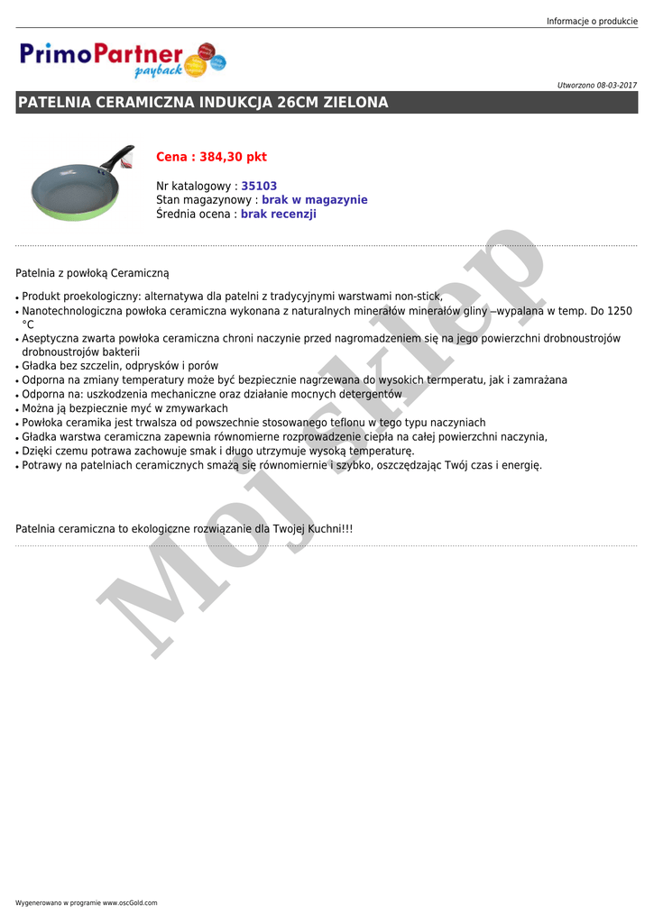 Informacje o produkcie Utworzono 08-03-2017 PATELNIA CERAMICZNA INDUKCJA 26CM ZIELONA Cena : 384,30 pkt Patelnia z powłoką Ceramiczną ● ● ● ● ● ● ● ● ● ● Produkt proekologiczny: alternatywa dla patelni z tradycyjnymi warstwami non-stick, Nanotechnologiczna powłoka ceramiczna wykonana z naturalnych minerałów minerałów gliny –wypalana w temp. Do 1250 °C Aseptyczna zwarta powłoka ceramiczna chroni naczynie przed nagromadzeniem się na jego powierzchni drobnoustrojów drobnoustrojów bakterii Gładka bez szczelin, odprysków i porów Odporna na zmiany temperatury może być bezpiecznie nagrzewana do wysokich termperatu, jak i zamrażana Odporna na: uszkodzenia mechaniczne oraz działanie mocnych detergentów Można ją bezpiecznie myć w zmywarkach Powłoka ceramika jest trwalsza od powszechnie stosowanego teflonu w tego typu naczyniach Gładka warstwa ceramiczna zapewnia równomierne rozprowadzenie ciepła na całej powierzchni naczynia, Dzięki czemu potrawa zachowuje smak i długo utrzymuje wysoką temperaturę. Potrawy na patelniach ceramicznych smażą się równomiernie i szybko, oszczędzając Twój czas i energię. oj sk l ● ep Nr katalogowy : 35103 Stan magazynowy : brak w magazynie Średnia ocena : brak recenzji M Patelnia ceramiczna to ekologiczne rozwiązanie dla Twojej Kuchni!!! Wygenerowano w programie www.oscGold.com