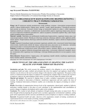 Polska Problemy Nauk Stosowanych, 2016, Tom 4, s. 211 – 218 Szczecin mgr Krzysztof Mirosław PASZOWSKI Wyższa Szkoła Humanistyczna Towarzystwa Wiedzy Powszechnej w Szczecinie Higher School of Humanities of Common Knowledge Society in Szczecin CELE ORGANIZACJI W KSZTAŁTOWANIU BEZPIECZEŃSTWA I HIGIENY PRACY POPRZEZ SZKOLENIA Streszczenie Wstęp i cel: W niniejszym artykule przedstawione zostały problemy związane z obowiązkiem przeprowadzania szkoleń z zakresu bezpieczeństwa i higieny pracy, sposoby i zasady, jakimi pracodawcy i kierującymi pracownikami powinni się kierować. Zwrócono również uwagę na konieczność dążenia do zmian w celach organizacji. Zadaniem artykułu jest wykazanie, iż oddziaływanie na pracowników poprzez organizację miejsca pracy przyczynia się do zwiększenia świadomości pracodawców, wpływa na poprawę zrozumienia aspektów bhp, a także bezpośrednio kształtuje postawy pracowników. Materiał i metody: Materiałem jest problematyka kształtowania bezpieczeństwa, organizacji miejsca pracy oraz zasad przeprowadzania szkoleń. Metodą jest obserwacja zachowań, eliminacja zakłóceń a także zgłębienie problematyki szkoleń. Przeprowadzona obserwacja zachowań umożliwia określenie, wpływu szkoleń na bezpieczeństwo pracowników. Wyniki: Znajomość komunikacji między poziomami organizacji, podziału celów, stosowanych metod skutecznego motywowania, transferowania szkoleń do miejsca wykonywania pracy przyczynia się do wdrożenia i utrwalenia pozytywnych zmian w rozwoju pracownika oraz jego bezpieczeństwa w środowisku pracy. Wniosek: Kształtowanie bezpiecznych postaw pracowników poprzez szkolenia odbywa się na wielu płaszczyznach. Odbywa się poprzez techniczne przygotowanie gruntu pracy, wytworzenie właściwych warunków otoczenia, wyznaczanie celów organizacji oraz świadomego i celowego działania pracodawców na rzecz poprawy warunków pracy. Słowa kluczowe: Bezpieczeństwo i higiena pracy, cele organizacji, transfer szkoleń, socjalizacja organizacyjna, bariery transferu szkoleń, rentowność szkoleń. (Otrzymano: 26.11.2015; Zrecenzowano: 28.11.2015; Zaakceptowano: 15.01.2016) OBJECTIVES OF THE ORGANIZATION IN SHAPING THE SAFETY HEALTH AND WORK THROUGH TRAINING Abstract Introduction and aim: This article presents the problems related to the obligation to carry out training on occupational health and safety, methods and principles that direct the employer and employees should follow. Attention was also drawn to the need to promote changes in the objectives of the organization. The purpose of this article is to demonstrate that the impact on employees by organizing the workplace helps to increase the awareness of employers, improves the understanding of safety aspects, as well as directly shapes the attitude of the staff. Material and methods: The material is shaping issues of safety, workplace organization and principles of training. The method is observation of behavior, interference suppression and also explore the issue of training. Conducted observation of behavior enables you to determine the impacts of training on workers’ safety. Results: Knowledge of communication between levels of the organization, shared goals, methods of effective motivation, training transfer to the place of work contributes to the implementation and consolidation of positive changes in employee development and its safety in the workplace. Conclusion: The creation of safe attitudes of employees through training takes place on many levels. This is done through technical preparing the ground work, to produce appropriate environmental conditions, setting goals of the organization and the conscious and deliberate action of employers to improve working conditions. Keywords: Occupational health and safety, objectives of the organization, transfer of training, socialization of organizational barriers to the transfer of training, training profitability. (Received:26.11.2015; Revised: 28.11.2015; Accepted: 15.01.2016) © K.M. Paszowski 2016 Bezpieczeństwo i higiena pracy / Occupational health and safety K.M. Paszowski 1. Wstęp Człowiek zawsze dążył do ograniczania nakładów na pracę, co wielokrotnie powodowało ogromne straty finansowe oraz potęgowało zagrożenie dla zdrowia i życia ludzkiego. Ciągły brak rąk do pracy, oraz problemy z tym związane, stworzyły podstawy do zabiegania o rozwój organizacyjny pracy. Planowanie oraz kontrola warunków pracy pozwoliły na wprowadzanie ulepszonych, kompleksowych rozwiązań zarządzania pracą. Dzięki ukształtowanemu przeświadczeniu o potrzebie rozwoju zarządzania pracą, ugruntowały się sposoby konstruowania nowych metod szkoleń w zakładach pracy. Powszechniejsza stała się również świadomość pracodawców, że pracownik jest w stanie jednocześnie wydajnie pracować oraz uczestniczyć w działaniach dla zwiększenia bezpieczeństwa Obecnie priorytetem w pracy. w dążeniu do poprawy bezpieczeństwa pracy stało się stworzenie innowacyjnych zasad organizacji przygotowania zawodowego pracowników. Podstawa prawna została przygotowana 20 kwietnia 2004 roku. Ustawa o promocji zatrudnienia i instytucjach rynku pracy (tj. Dz. U. z 2008 r. Nr 69, poz. 415 z późniejszymi zmianami) [1] oraz Rozporządzenie Ministra Pracy i Polityki Społecznej z dnia 7 kwietnia 2009 roku w sprawie przygotowania zawodowego dorosłych (tj. Dz. U. z 2009 r. Nr 61, poz. 502) [2]. Techniczna strona przygotowania gruntu pracy, przyczyniła się do rozwoju mechanizacji oraz automatyzacji pracy. Pracodawca, jako jeden najważniejszych organów funkcjonowania przedsiębiorstwa powinien wprowadzać takie rozwiązania posługiwania się pracą, które poprzez właściwe zarządzanie, zapewnią pracownikom bezpieczne i higieniczne warunki pracy. Należą do niej między innymi, ustalenie wewnętrznej polityki rozwojowej oraz wieloetapowej strategii rozwoju firmy. Ustalenie zakresu i struktury działalnoś