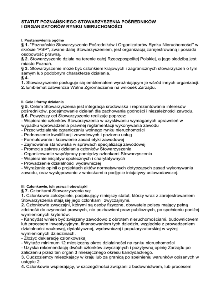 STATUT POZNAŃSKIEGO STOWARZYSZENIA POŚREDNIKÓW I