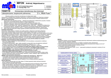 15A0110 Wzmacniacz domofonowy dwu bramowy zabezpieczenie, bezpiecznik polimerowy 2 x „ Multi Fuse ” Oferujemy państwu wzmacniacz domofonowy do obsługi dwóch wejść. Wzmacniacze posiadają wiele znaczących właściwości w stosunku do stosowanych dotychczas rozwiązań, zarówno z wykorzystaniem przekaźnika wielo stykowego, jak równieŜ prostych rozwiązań elektronicznych. Właściwości wzmacniaczy: 1. Ograniczenie czasu wywołania timerem - oddzielnie dla kaŜdej bramy (zablokowanie przycisku w kasecie jednej bramy nie powoduje blokady działania i obsługi drugiej bramy). 2. Oddzielne, odporne na zwarcie wzmacniacze sygnału wywołania dla obydwu bram. 3. Przełączenie sygnałów akustycznych wyłącznie do bramy, z której nastąpiło wywołanie. 4. Załączenie rygli układem triak – optotriak z zabezpieczeniem „Multi Fuse” - oddzielnie dla kaŜdej bramy (nie powoduje zakłóceń, uszkodzenie rygla jednej bramy nie powoduje blokady działania drugiej bramy). 5. Automatyczny priorytet wywołania z bramy „1” podczas jednoczesnego wywołania z obydwu bram. 6. Model 15A0120 posiada dwa rodzaje sygnałów wywołania (kaŜda brama ma inny sygnał wywołania). Instalacja wzmacniacza. Wzmacniacz naleŜy połączyć z kasetami oraz ryglem zgodnie z załączonym schematem połączenia. Zacisk masa, pomiędzy kasetą a wzmacniaczem naleŜy połączyć dwoma Ŝyłami o średnicy 0,5 mm. JeŜeli długość przewodu między kasetą i wzmacniaczem przekracza 15 metrów, lecz nie jest dłuŜsza niŜ 50 metrów. Jeśli odległość ta przekracza 50 metrów, naleŜy zastosować trzy Ŝyły o średnicy 0.5 mm lub przewód o większym przekroju ( dwie Ŝyły o średnicy 0,5mm – przekrój zastępczy 0,5 mm2 , trzy Ŝyły o średnicy 0,5mm - przekrój zastępczy 0,75 mm2 ). Nieprawidłowe podłączenie masy (pominięcie zacisków, łączenie przewodów w powietrzu i nie zachowanie właściwego przekroju przewodu, a co za tym idzie za duŜa rezystancja linii masy) powoduje przesłuchy. Do zasilenia wzmacniacza naleŜy zastosować zasilacz MIFON 20X0020 lub 20X0040. Instalując system domofonowy trzeba pamiętać, Ŝe: - pobór mocy całego urządzenia nie moŜe przekraczać 10VA dla zasilacza z oznaczeniem na tabliczce znamionowej Moc(Pn)10VA - przy doborze elektrozaczepu / rygla / naleŜy sprawdzić czy jego pobór mocy nie przekracza moŜliwości zasilacza i czy pracuje w zakresie napięcia pochodzącego z zasilacza tj.12 V + -10% , - do zasilania elektrozaczepu naleŜy stosować przewody zgodne z zaleceniem producenta. - w wersji standardowej potrzebny jest przewód 5-cio Ŝyłowy Ŝeby połączyć unifony ze wzmacniaczem oraz 9 + n Ŝyłowy /gdzie n oznacza ilość przycisków bramofonu /, by połączyć jeden bramofon ze wzmacniaczem / w tym wliczono podwójne Ŝyły łączące punkty ~V i R – zasilanie elektrozaczepu /. - rezystancja pojedynczego przewodu w linii nie moŜe przekraczać 10 omów, - wzmacniacz naleŜy chronić przed wilgocią / montować w pomieszczeniach suchych/. - w celu osiągnięcia optymalnych parametrów pracy i zapewnienia bezawaryjnego działania układu naleŜy stosować komponenty systemu domofonowego / bramofony, unifony, zasilacze i rygle / sprzedawane lub polecane przez producenta wzmacniaczy. UWAGA: panel sterowania wyposaŜony jest w bezpiecznik automatyczny „ Multi Fuse ”. W przypadku samoczynnego wyłączenia wzmacniacza naleŜy odczekać kilka minut. Jeśli awaria miała charakter chwilowy nastąpi automatyczne włączenie urządzenia. Jeśli włączenie nie nastąpi naleŜy wezwać instalatora w celu usunięcia przyczyny wyłączenia. Warunki gwarancji: - okres gwarancji obejmuje pięć lat od daty zakupu. W okresie gwarancji naleŜy zachować dokument zakupu urządzenia oraz kartę gwarancyjną. - uŜytkownik utraci gwarancję, jeŜeli naruszone jest oznakowanie firmowe /pomalowany wkręt mocujący płytkę i etykieta kodowa /, gdy dokonano samowolnie jakichkolwiek zmian w urządzeniu, jeśli zostało ono zamontowane niezgodnie z instrukcją, uszkodzone mechanicznie, uszkodzone na skutek znacznego wzrostu napięcia zasilania lub było uŜytkowane w niewłaściwy sposób. - karta gwarancyjna musi zawierać datę sprzedaŜy oraz pieczątkę sprzedawcy. Data sprzedaŜy................................................... Pieczątka sprzedawcy UWAGA: 1.Prawidłowe działanie wzmacniacza dwubramowego gwarantuje zastosowanie zasilacza produkowanego przez MIFON o symbolu handlowym 20X0020. Zastosowanie tego zasilacza jest konieczne ze względu na jednolity system zabezpieczeń. 2. Na schemacie grubą linią zaznaczono przewody, których przekrój nie powinien być mniejszy niŜ 0,5 mm2 (moŜna zastosować podwójny przewód o średnicy 0,5 mm). 3. W przypadku rezystancji linii większej niŜ 10 omów naleŜy połączenia „masa” i „GL-K...” poprowadzić podwójnymi przewodami o średnicy 0,5 mm lub przewodem 0,5 mm2.