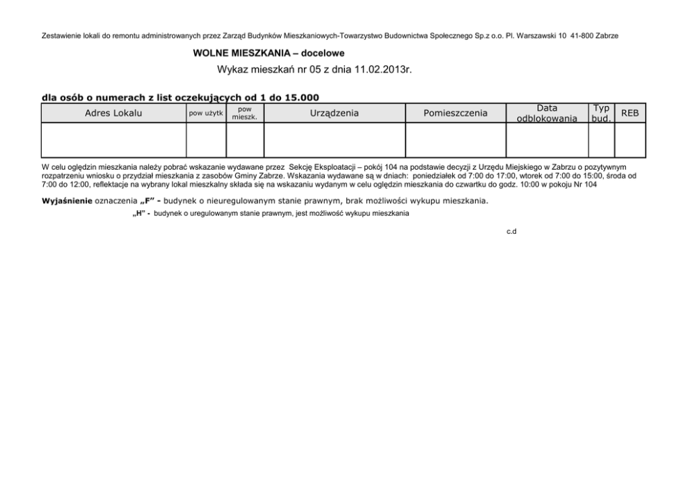 Zestawienie lokali do remontu administrowanych przez Zarząd Budynków Mieszkaniowych-Towarzystwo Budownictwa Społecznego Sp.z o.o. Pl. Warszawski 10 41-800 Zabrze WOLNE MIESZKANIA – docelowe Wykaz mieszkań nr 05 z dnia 11.02.2013r. dla osób o numerach z list oczekujących od 1 do 15.000 Adres Lokalu pow użytk pow mieszk. Urządzenia Data odblokowania Pomieszczenia Typ bud. REB W celu oględzin mieszkania należy pobrać wskazanie wydawane przez Sekcję Eksploatacji – pokój 104 na podstawie decyzji z Urzędu Miejskiego w Zabrzu o pozytywnym rozpatrzeniu wniosku o przydział mieszkania z zasobów Gminy Zabrze. Wskazania wydawane są w dniach: poniedziałek od 7:00 do 17:00, wtorek od 7:00 do 15:00, środa od 7:00 do 12:00, reflektacje na wybrany lokal mieszkalny składa się na wskazaniu wydanym w celu oględzin mieszkania do czwartku do godz. 10:00 w pokoju Nr 104 Wyjaśnienie oznaczenia „F” - budynek o nieuregulowanym stanie prawnym, brak możliwości wykupu mieszkania. „H” - budynek o uregulowanym stanie prawnym, jest możliwość wykupu mieszkania c.d Zestawienie lokali do remontu administrowanych przez Zarząd Budynków Mieszkaniowych-Towarzystwo Budownictwa Społecznego Sp.z o.o. Pl. Warszawski 10 41-800 Zabrze WOLNE MIESZKANIA – bieżące do remontu Wykaz mieszkań nr 05 z dnia 11.02.2013r. dla osób o numerach z list oczekujących od 1 do 20.000 Pow mieszk Adres Lokalu Pow użytk. MEHOFFERA 4/4 33,1 14,29 DAMROTA 64/5 44,7 30,8 GRZYBOWSKA 59/5 30 17,44 GRZYBOWSKA 29/14 32,84 22,32 OSIEDLEŃCZA 16/2 41,52 22,08 REJTANA 24/3 37,89 19,36 Urządzenia Pomieszczenia Data odblokowania Typ bud. REB woda,wc w mieszkaniu 1 pokój, kuchnia, przedpokój, WC 06.02.2013R. H I woda,gaz, łazienka w mieszkaniu 2 pokoje, kuchnia, przedpokój, łazienka 06.02.2013R. H III woda,gaz, łazienka w mieszkaniu 1 pokój, kuchnia, przedpokój, łazienka 06.02.2013R. H V woda,gaz, łazienka w mieszkaniu 2 pokoje, kuchnia, przedpokój, łazienka 06.02.2013R. H V woda w mieszkaniu, wc w podwórzu 1 pokój, kuchnia, komórka 06.02.2013R. F VI 06.02.2013R. F VI woda w mieszkaniu, gaz do 1 pokój. Kuchnia, alkowa sprawdzenia, łazienka demontaż W celu oględzin mieszkania należy pobrać wskazanie wydawane przez Sekcję Eksploatacji – pokój 104 na podstawie decyzji z Urzędu Miejskiego w Zabrzu o pozytywnym rozpatrzeniu wniosku o przydział mieszkania z zasobów Gminy Zabrze. Wskazania wydawane są w dniach: poniedziałek od 7:00 do 17:00, wtorek od 7:00 do 15:00, środa od 7:00 do 12:00, reflektacje na wybrany lokal mieszkalny składa się na wskazaniu wydanym w celu oględzin mieszkania do czwartku do godz. 10:00 w pokoju Nr 104 Wyjaśnienie oznaczenia „F” - budynek o nieuregulowanym stanie prawnym, brak możliwości wykupu mieszkania. „H” - budynek o uregulowanym stanie prawnym, jest możliwość wykupu mieszkania . WOLNE MIESZKANIA – zalegające do remontu Wykaz mieszkań nr 05 z dnia 11.02.2013r. dla osób o numerach z list oczekujących od 1 do 23.668 Adres Lokalu Pow użytk. Pow mieszk. Urządzenia Pomieszczenia Data odblokowania Typ bud. REB W celu oględzin mieszkania należy pobrać wskazanie wydawane przez Sekcję Eksploatacji – pokój 104 na podstawie decyzji z Urzędu Miejskiego w Zabrzu o pozytywnym rozpatrzeniu wniosku o przydział mieszkania z zasobów Gminy Zabrze. Wskazania wydawane są w dniach: poniedziałek od 7:00 do 17:00, wtorek od 7:00 do 15:00, środa od 7:00 do 12:00, reflektacje na wybrany lokal mieszkalny składa się na wskazaniu wydanym w celu oględzin mieszkania do czwartku do godz. 10:00 w pokoju Nr 104 Wyjaśnienie oznaczenia „F” - budynek o nieuregulowanym stanie prawnym, brak możliwości wykupu mieszkania. „ H” - budynek o uregulowanym stanie prawnym, jest możliwość wykupu mieszkania .