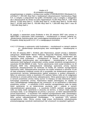 Aneks nr 8 do prospektu emisyjnego przygotowanego w związku z emisją przez spółkę HYDROBUDOWA Włocławek S.A. („Emitent”) 1.303.464 Akcji Serii J wydawanych akcjonariuszom Hydrobudowy Śląsk S.A. w związku z połączeniem tej spółki z Emitentem oraz w związku z ubieganiem się o dopuszczenie do obrotu na rynku regulowanym 10.353 Akcji Serii A, 1.647 Akcji Serii B, 12.000 Akcji Serii C, 10.000 Akcji Serii D, 10.000 Akcji Serii E, 33.000 Akcji Serii F, 43.000 Akcji Serii G, 150.000 Akcji Serii H, 1.200.000 Akcji Serii I oraz do 1.303.464 Akcji Serii J. • I W związku z zawarciem przez Emitenta w dniu 20 sierpnia 2007 roku umowy nr HB/07/086 o wykonanie robót budowlano – montaŜowych w ramach zadania pn. „Modernizacja dystrybucyjnej sieci wodociągowo-kanalizacyjnej w Łodzi”, na str. 47 Prospektu dodaj się punkt 4.4.2.1.21 o następującym brzmieniu: 4.4.2.1.21 Umowa o wykonanie robót budowlano – montaŜowych w ramach zadania pn. „Modernizacja dystrybucyjnej sieci wodociągowo – kanalizacyjnej w Łodzi”. W dniu 20 sierpnia 2007 r. Emitent, jako Wykonawca, zawarł umowę z Zakładem Usługowym „WIERTMAR” Marian Piekarski, Bogumiła Piekarska, Marek Piekarski, Tomasz Piekarski Spółka Jawna, jako Zamawiającym, której przedmiotem jest wykonanie robót budowlano – montaŜowych w ramach zadania pod nazwą „Modernizacja dystrybucyjnej sieci wodociągowo – kanalizacyjnej w Łodzi”. Za wykonanie robót będących przedmiotem umowy zostało określone wynagrodzenie w wysokości 55.502.068,65 zł netto. Termin zakończenia robót został określony na 30 listopada 2009 roku. Zabezpieczenie naleŜytego wykonania umowy stanowi gwarancja ubezpieczeniowa lub bankowa na kwotę 2% wartości wynagrodzenia wykonawcy netto. Zabezpieczenie powyŜsze ma zostać wniesione w terminie 10 dni od daty podpisania niniejszej umowy lub w przypadku nie dostarczenia gwarancji w wyznaczonym terminie zabezpieczenie będzie wniesione w postaci potrącenia z faktur za wykonane roboty w wysokości 2% wartości faktury netto aŜ do osiągnięcia określonej w umowie pełnej kwoty zabezpieczenia. Okres gwarancyjny na wykonane w ramach przedmiotu umowy roboty wynosi 12 miesięcy od daty dokonania odbioru końcowego przedmiotu umowy. Wykonawca będzie zobowiązany do zapłaty na rzecz Zamawiającego następujących kar umownych: a) za opóźnienie w wykonaniu przedmiotu umowy - w wysokości 0,02% wartości wynagrodzenia netto za kaŜdy dzień opóźnienia, b) za nieterminowe usuniecie wad i usterek w ramach odpowiedzialności gwarancyjnej – w wysokości 0,002% wartości wynagrodzenia netto za kaŜdy dzień opóźnienia w stosunku do terminu, w którym miało nastąpić usunięcie wady, c) za odstąpienie od umowy z przyczyn, za które odpowiedzialność ponosi Wykonawca - w wysokości 10% wartości wynagrodzenia netto. Zamawiający zapłaci Wykonawcy karę umowną w przypadku odstąpienia od umowy z przyczyn, za które ponosi odpowiedzialność Zamawiający – w wysokości 10% wartości wynagrodzenia netto. Strony umowy mają prawo dochodzenia odszkodowania przewyŜszającego wysokość zastrzeŜonych kar umownych na zasadach ogólnych. • II W związku z zawarciem przez Hydrobudowę Śląsk S.A. w dniu 20 sierpnia 2007 roku umowy przeniesienia prawa uŜytkowania wieczystego nieruchomości w zamian za udziały z podmiotem z grupy kapitałowej Spółki PBG Dom Sp. z o.o. dodaje się w pkt. 17.2.3 na str. 148 Prospektu w tabeli pkt 9 o następującym brzmieniu: PBG Dom Sp. z o.o. 9. Umowa przeniesienia prawa wieczystego uŜytkowania gruntu połoŜonego w Katowicach – Rozdzień, o łącznym obszarze 2,30.09 ha, zapisanej w księdze wieczystej KA1K/00063541/5 w zamian za 3.572 udziały w Spółce PBG Dom Sp. z o.o. o wartości nominalnej 100,00 zł kaŜdy. 20.08.2007 357.200,00 zł netto Ponadto pkt 10 w tabeli w pkt 5.1 Prospektu, str. 86, otrzymuje następujące brzmienie: 10. PBG Dom Sp. z o.o. z siedzibą w Wysogotowie 84,85% 84,85%
