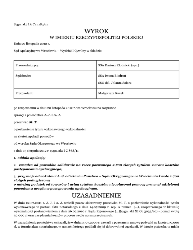 Sygn. akt I A Ca 1183/12 WYROK W IMIENIU RZECZYPOSPOLITEJ POLSKIEJ Dnia 20 listopada 2012 r. Sąd Apelacyjny we Wrocławiu – Wydział I Cywilny w składzie: Przewodniczący: SSA Dariusz Kłodnicki (spr.) Sędziowie: SSA Iwona Biedroń SSO del. Jolanta Solarz Protokolant: Małgorzata Kurek po rozpoznaniu w dniu 20 listopada 2012 r. we Wrocławiu na rozprawie sprawy z powództwa J. J. i A. J. przeciwko M. T. o pozbawienie tytułu wykonawczego wykonalności na skutek apelacji powodów od wyroku Sądu Okręgowego we Wrocławiu z dnia 13 sierpnia 2012 r. sygn. akt I C 868/11 1. oddala apelację; 2. zasądza od powodów solidarnie na rzecz pozwanego 2.700 złotych tytułem zwrotu kosztów postępowania apelacyjnego; 3. przyznaje adwokatowi A. S. od Skarbu Państwa – Sądu Okręgowego we Wrocławiu kwotę 2.700 złotych podwyższoną o należny podatek od towarów i usług tytułem kosztów nieopłaconej pomocy prawnej udzielonej powodom z urzędu w postępowaniu apelacyjnym. UZASADNIENIE W dniu 22.07.2011 r. J. J. i A. J. wnieśli pozew skierowany przeciwko M. T. o pozbawienie wykonalności tytułu wykonawczego w postaci aktu notarialnego z dnia 14.07.2009 r. rep. A numer (...), zaopatrzonego w klauzulę wykonalności postanowieniem z dnia 26.07.2010 r. Sądu Rejonowego (...)(sygn. akt XI Co 3033/10) - ponad kwotę 50.000 zł oraz zasądzenia kosztów procesu wedle norm przepisanych. W uzasadnieniu powództwa wskazali, że w dniu 14.07.2009 r. zawarli z pozwanym umowę pożyczki na kwotę 150.000 zł, w formie aktu notarialnego, w ramach którego poddali się jej dobrowolnej egzekucji. W istocie pożyczka ta miała jednak obejmować jedynie kwotę 50.000 zł, a pozostałe 100.000 zł stanowić miały zawoalowane odsetki, za okres od dnia jej udzielenia do dnia spłaty, tj. do 30.06.2010 r., bowiem przekraczały one maksymalny dopuszczalny poziom. Podnieśli przy tym, że w dniu zawarcia umowy została im przekazana przez pozwanego jedynie kwota 50.000 zł, pobrana w ich obecności z jego rachunku bankowego w (...), a brakującej kwoty 100.000 zł nigdy im nie wydano. W odpowiedzi pozwany wniósł o oddalenie powództwa i zasądzenie od powodów na jego rzecz zwrotu kosztów procesu. W uzasadnieniu swojego stanowiska podniósł, że wbrew twierdzeniom powodów udzielił im pożyczki na 150.000 zł i taka też kwota została im wydana w dniu zawarcia umowy, co potwierdza treść tej umowy. Wskazał przy tym, że do tej pory nie zwracali się do niego z żądaniem wydania im kwoty 100.000 zł, jak również nie formułowali pozostałych zarzutów, które obecnie podnoszą. Na rozprawie w dniu 6.02.2012 r. pełnomocnik powodów oświadczył, że zawarli oni z pozwanym umowę pożyczki pod wpływem błędu, jednakże nie składali oświadczenia w przedmiocie uchylenia się od skutków prawnych z tego powodu, bowiem w dacie uzyskania przez pozwanego klauzuli wykonalności na w/w tytuł egzekucyjny, upłynął już termin do jego złożenia. Wyrokiem z dnia 13.08.2012 r. – sygn. akt I C 868/11 Sąd Okręgowy we Wrocławiu oddalił powództwo (pkt. I), odstąpił od obciążenia powodów obowiązkiem zwrotu pozwanemu kosztów postępowania (pkt. II) oraz przyznał adw. A. S. od Skarbu Państwa – Sądu Okręgowego we Wrocławiu kwotę 3.600 zł, podwyższoną o obowiązująca stawkę podatku od towarów i usług, tytułem kosztów nieopłaconej pomocy prawnej udzielonej z urzędu (pkt. III) Podstawą jego wydania były następujące ustalenia. J. J. prowadził działalność gospodarczą w postaci sklepu spożywczego. W domu naprzeciwko miejsca prowadzonej działalności gospodarczej zamieszkiwał pozwany. Żona pozwanego pracowała w sklepie powoda w charakterze sprzedawcy. M. T. sprzedał nieruchomość i dysponował środkami pieniężnymi w gotówce, zaś powód miał problemy finansowe w związku z prowadzoną działalnością. Powód i pozwany umówili się, że pozwany będzie działał jako „cichy” wspólnik przy prowadzeniu działalności gospodarczej przez powoda. Początkowo M. T. inwestował w sklep kwoty w granicach kilku, bądź kilkunastu tysięcy złotych, głównie w zakup towaru do sklepu powoda. Udzielił też powodowi w 2008 r. pożyczki w kwocie 50.000 zł. Powód posiadał szereg nieuregulowanych zobowiązań. Na skutek braku ich spłaty toczyło się postępowanie egzekucyjne z nieruchomości stanowiącej własność powodów. W dniu 14.07.2009r. A. J. i J. J. zawarli z M. T., w formie aktu notarialnego umowę pożyczki, której przedmiotem była kwota 150.000 zł. W umowie A. i J. J. zobowiązali się zwrócić kwotę pożyczki w terminie do dnia 30.06.2010 r., na rachunek bankowy wskazany przez pożyczkodawcę oraz potwierdzili otrzymanie przedmiotu pożyczki. W §2 umowy powodowie oświadczyli, że co do obowiązku zwrotu kwoty 150.000 zł, w terminie do dnia 30.06.2010 r., poddają się solidarnie egzekucji w myśl art. 777 § 1 pkt 4 k.p.c. Wobec braku spłaty pożyczki w terminie, M. T. wystąpił z wnioskiem o nadanie klauzuli wykonalności aktowi notarialnemu w zakresie obowiązku zwrotu przedmiotu pożyczki. Postanowieniem z dnia 26.07.2010 r. (sygn. akt I Co 3033/10) Sąd Rejonowy (...) nadał klauzulę wykonalności aktowi notarialnemu z dnia 14.07.2009 r. rep. A numer (...) w zakresie w jakim A. i J. J. zobowiązali się solidarnie do zwrotu wierzycielowi M. T. kwoty 150.000 zł w terminie do dnia 30.06.2010 r. Pismem z dnia 30.12.2010 r. Komornik Sądowy przy Sądzie Rejonowym (...) zawiadomił powodów o wszczęciu postępowania egzekucyjnego z wniosku M. T., z nieruchomości stanowiącej ich własność, położonej we W. przy ul. (...), dla której Sąd Rejonowy (...)prowadzi księgę wieczystą o numerze KW (...). W Prokuraturze Rejonowej W. we W. toczyło się postępowanie w sprawie usiłowania wyłudzenia, pieniędzy w kwocie 100.000 zł na szkodę A. i J. J., to jest o czyn z art. 13 § 1 k.k. w zw. z art. 286 § 1 k.k. Postanowieniem z dnia 18.04