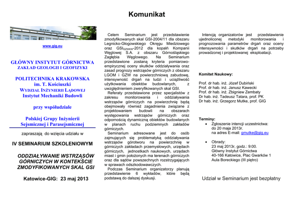 Komunikat www.gig.eu GŁÓWNY INSTYTUT GÓRNICTWA ZAKŁAD GEOLOGII I GEOFIZYKI POLITECHNIKA KRAKOWSKA im. T. Kościuszki WYDZIAŁ INŻYNIERII LĄDOWEJ Instytut Mechaniki Budowli przy współudziale Polskiej Grupy Inżynierii Sejsmicznej i Parasejsmicznej zapraszają do wzięcia udziału w IV SEMINARIUM SZKOLENIOWYM ODDZIAŁYWANIE WSTRZĄSÓW GÓRNICZYCH W KONTEKŚCIE ZMODYFIKOWANYCH SKAL GSI Katowice-GIG: 23 maj 2013 Celem Seminarium jest przedstawienie zmodyfikowanych skal GSI-2004/11 dla obszaru Legnicko-Głogowskiego Okręgu Miedziowego oraz GSIGZWKW-2012 dla kopalń Kompanii Węglowej S.A. z obszaru Górnośląskiego Zagłębia Węglowego. Na Seminarium przedstawione zostaną kryteria pomiarowoempirycznej oceny skutków oddziaływania oraz zasad prognozy wstrząsów górniczych z obszaru LGOM i GZW na powierzchniową zabudowę, intensywność drgań na ludzi i uciążliwość użytkowania obiektów budowlanych, z uwzględnieniem zweryfikowanych skal GSI. Referaty przedstawione przez specjalistów z zakresu monitorowania i oddziaływania wstrząsów górniczych na powierzchnię będą obejmowały również zagadnienia związane z projektowaniem budowli na obszarach występowania wstrząsów górniczych oraz odpornością dynamiczną obiektów budowlanych w planach ruchu podziemnych zakładów górniczych. Seminarium adresowane jest do osób zajmujących się problematyką oddziaływania wstrząsów górotworu na powierzchnię w górniczych zakładach przemysłowych, urzędach górniczych, jednostkach naukowych, urzędach miast i gmin położonych ma terenach górniczych oraz dla sądów powszechnych rozstrzygających w sprawach odszkodowawczych. Podczas Seminarium organizatorzy planują przedstawienie 6 wykładów, które będą podstawą do dalszej dyskusji. Intencją organizatorów jest przedstawienie ujednoliconej metodyki monitorowania i prognozowania parametrów drgań oraz oceny intensywności i skutków drgań na potrzeby prowadzonej i projektowanej eksploatacji. Komitet Naukowy: Prof. dr hab. inż. Józef Dubiński Prof. dr hab. inż. Janusz Kawecki Prof. dr hab. inż. Zbigniew Zembaty Dr hab. inż. Tadeusz Tatara, prof. PK Dr hab. inż. Grzegorz Mutke, prof. GIG Terminy: Zgłoszenie intencji uczestnictwa: do 20 maja 2013r. na adres E-mail: [email protected] Obrady: 23 maj 2013r, godz.: 9:00. Główny Instytut Górnictwa 40-166 Katowice, Plac Gwarków 1 Aula Boreckiego (III piętro) Udział w Seminarium jest bezpłatny Program Seminarium: Dubiński J., Mutke G., Tatara T., Muszyński L., Barański A., Kowal T..: Górnicza Skala Intensywności drgań GSIGZWKW-2012 do prognozy i oceny skutków oddziaływania wstrząsów indukowanych eksploatacją złóż węgla kamiennego w zakładach górniczych KW S.A. na obiekty budowlane i na ludzi. Jaśkiewicz K., Mutke G., Dubiński J., Lurka A. : Górnicza Skala Intensywności Sejsmicznej GSI2004/11 dla wstrząsów górniczych w LGOM. Tatara T.: Proponowane kierunki modyfikacji skali GSI-GZWKW. dalszej Chodacki J: Probabilistyczna metoda oceny intensywności wstrząsów górotworu w GZW w oparciu o skalę GSIGZW. Zembaty Z.: Adaptacja metodologii europejskiej normy sejsmicznej Eurokod 8 do projektowania budowli na obszarach wstrząsów górniczych Muszyński L.: Odporność dynamiczna obiektów budowlanych w planach ruchu podziemnych zakładów górniczych.. Matyas L.: Skutki oddziaływania wstrząsu górniczego o energii E=1.6·108 J z dnia 19.03.2013 na powierzchnię terenu górniczego O/ZG Rudna www.grss.gig.eu