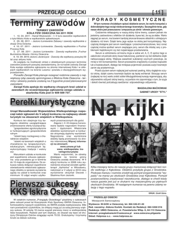 PRZEGLĄD OSIECKI Terminy zawodów TERMINY ZAWODÓW KOŁA PZW OSIECZNA NA 2011 ROK 1. 10. 04. 2011 - Kanał Wojnowicki - I i II tura zawodów wędkarskich o tytuł Mistrz Koła w wędkarstwie spławikowym. 2. 05. 06. 2011 – Jezioro Łoniewskie Zabawy i zawody wędkarskie z okazji Dnia Dziecka 4. 10. 07. 2011 - Jezioro Łoniewskie. Zawody wędkarskie o Puchar Prezesa Koła 5. 27. 08. 2011 - Jezioro Łoniewskie - Zawody wędkarskie „Puchar Burmistrza Miasta i Gminy Osieczna 6. 10. 09. 2010 Jezioro Jezierzyce - Zawody dla wędkarzy powyżej 50 lat oraz aktywu koła. Ze względu na możliwość zmian z obiektywnych przyczyn terminów zawodów podanych powyżej zawiadamiamy, że na każde zawody Zarząd Koła wydaje oddzielne ogłoszenie na stronie internetowej Koła i w sklepach wędkarskich na terenie Leszna i powiatu z dwutygodniowym wyprzedzeniem. Ponadto Zarząd Koła planuje rozegrać rodzinne zawody o największą rybę zawody spinningowe o Mistrza Koła Osieczna - terminy i akweny podane zostaną na 2 tygodnie przed planowanymi zawodami. Zarząd Koła apeluje do wędkarzy chcących brać udział w zawodach do wcześniejszego zgłoszenia swego udziału u skarbnika Koła pod nr 609 509 737. Perełki turystyczne Urząd Marszałkowski Województwa Wielkopolskiego rozpoczął nabór zgłoszeń do V edycji konkursu na najlepszy obiekt turystyki na obszarach wiejskich w Wielkopolsce. Konkurs ten obejmuje trzy kategorie obiektów uwzględniające zróżnicowanie oferty turystycznej: *gospodarstwo agroturystyczne w funkcjonującym gospodarstwie rolnym *obiekt bazy noclegowej o charakterze wiejskim *obiekt na terenach wiejskich o charakterze np. terapeutycznym, edukacyjnym, rekreacyjnym itp. wykorzystujący tradycje i walory wsi Warunkiem udziału w konkursie jest wypełnienie arkusza zgłoszenia oraz przesłanie go w terminie do 15 maja do organizatora. Do arkusza należy dołączyć wypełnione oświadczenie właściciela zgłaszanego obiektu w sprawie wyrażenia zgody na udział w konkursie oraz minimum 10 zdjęć wnętrz użytko- wych przeznaczonych dla gości. Zajęcie I, II i III miejsca honorowane będzie nagrodami finansowymi i dyplomami. Właściciele obiektów wyróżnionych w konkursie otrzymają dyplomy wyróżnień. Nagrodzone oraz wyróżnione obiekty będą promowane na stronie internetowej.Więcej informacji na stronach: www.umww.pl lub www. wielkopolska. travel/agroturystyka Warto wspomnieć, że obiekty działające na terenie gminy Osieczna zostały docenione. W II edycji konkursu w 2008 roku wyróżnienie otrzymał ośrodek apifitoterapii „Apiherba” w Witosławiu, natomiast w V edycji w 2010 roku wyróżnienie otrzymał Dworek i Stadnina Koni Jeziorki. Pierwsze sukcesy KKS Iskra Osieczna W ostatnim numerze „Przeglądu Osieckiego” pisaliśmy o sukcesach jakie odnosił przed lat Koszykarski Klub Sportowy ISKRA Osieczna. Informowaliśmy naszych czytelników, że ISKRA została reaktywowana. Miło nam powiadomić czytelników, że chłopcy mają już za sobą pierwszy większy sukces. W sobotę 18 marca wygrali pierwszy mecz w wielkopolskiej lidze koszykówki. Radość jest tym większa, że okazali się lepsi od drużyny Olimpijczyk Ostrów osiągając wynik 70:53. Gratulujemy i trzymamy kciuki za dalsze sukcesy. [ 11 ] PORADY KOSMETYCZNE W tym numerze chciałabym opisać działanie serum, bo warto korzystać z dobrodziejstw tego wciąŜ niedocenianego kosmetyku. Szczególnie teraz, gdy nasza skóra jest przesuszona i zmęczona po zimie i okresie grzewczym. Codziennie wklepujemy w naszą skórę róŜne kremy, czasem jednak nie jesteśmy zadowolone z efektów ich działania, bywa teŜ, Ŝe są za słabe. Warto sięgnąć po serum, ma bowiem bardziej skoncentrowane składniki o silniejszym działaniu niŜ krem. Dzięki temu jego wpływ na skórę jest korzystniejszy. Najczęściej dostępne jest serum nawilŜające i przeciwzmarszczkowe, lecz coraz częściej moŜna spotkać serum zwęŜające pory, serum dla młodej cery z problemami trądzikowymi czy teŜ rozjaśniające przebarwienia. Serum w odróŜnieniu od kremu kryje w sobie wit. A, C, E oprócz tego w zaleŜności od potrzeb skóry kwas hialuronowy, pantenol czy teŜ delikatne olejki natłuszczające skórę. Większa zawartość substancji czynnych powoduje, Ŝe mniej w nim konserwantów. Serum przewaŜnie znajdziemy w postaci kapsułek lub w buteleczkach, dlatego teŜ mniejsza pojemność pozwala zuŜyć kosmetyk zanim się przeterminuje. Przed uŜyciem serum najlepiej jest wykonać peeling, który dogłębnie oczyści skórę, dzięki czemu kosmetyk będzie się lepiej wchłaniał. Stosując serum (najlepiej na noc) warto zrobić sobie kilkutygodniową kurację regenerującą, aby odpowiednio odŜywić skórę twarzy, oczywiście nie zapominając o tym, Ŝe szyja i dekolt równieŜ potrzebują nawilŜenia i odpowiedniego odŜywienia. Na kijki MAGDALENA MAĆKOWIAK GABINET URODY "STYL" Kilka miesięcy temu do naszej grupy marszowej dołączyli fani nordic walkingu z Kąkolewa. Ostatnio przybyła grupa z Grodziska. Podczas marszu i rozmów zrodził się pomysł zorganizowania "wypadu" na marsz po okolicach Grodziska oraz Kąkolewa. Pomysł postanowiliśmy zrealizować niezwłocznie, dlatego w chwili kiedy nasza gazeta jest już w drukarni my maszerujemy po pięknych okolicach Grodziska. W następnym numerze na pewno zdamy relację z tego wypadu. PRZEGLĄD OSIECKI Miesięcznik Samorządowy DRUK: Grafi Góra Wydawca: M-GOK w Osiecznej, tel. 065 535-01-40 Red. naczelny: Aldona Korbik. Kontakt do Redakcji: 065 5350 016 Redakcja: UMiG Osieczna, ul. Powstańców Wlkp. 6, 64-113 Osieczna Internet: [email protected] www.osieczna.pl/gazeta Skład: Halpress s.c. - www.halpress.eu
