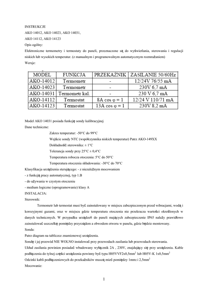 INSTRUKCJE AKO 14012, AKO 14023, AKO 14031, AKO 14112, AKO 14123 Opis ogólny: Elektroniczne termometry i termostaty do paneli, przeznaczone są do wyświetlania, sterowania i regulacji niskich lub wysokich temperatur. (z manualnym i programowalnym automatycznym rozmrażaniem) Wersje: Model AKO 14031 posiada funkcję sondy kalibracyjnej Dane techniczne: Zakres temperatur: -50°C do 99°C Wejście sondy NTC (współczynnika niskich temperatur) Patrz AKO-149XX Dokładność sterownika: ± 1°C Tolerancja sondy przy 25°C ± 0,4°C Temperatura robocza otoczenia: 5°C do 50°C Temperatura otoczenia składowania: -30°C do 70°C Klasyfikacja urządzenia sterującego: - z niezależnym mocowaniem - z funkcją pracy automatycznej, typ 1.B - do używania w czystym otoczeniu - medium logiczne (oprogramowanie) klasy A INSTALACJA: Sterownik: Termometr lub termostat musi być zainstalowany w miejscu zabezpieczonym przed wibracjami, wodą i korozyjnymi gazami, oraz w miejscu gdzie temperatura otoczenia nie przekracza wartości określonych w danych technicznych. W przypadku urządzeń do paneli mających zabezpieczenie IP65 należy prawidłowo zainstalować uszczelkę pomiędzy przyrządem a obwodem otworu w panelu, gdzie będzie montowany. Sonda: Patrz diagram na tabliczce znamionowej urządzenia. Sondę i jej przewód NIE WOLNO instalować przy przewodach zasilania lub przewodach sterowania. Układ zasilania powinien posiadać wbudowany wyłącznik 2A , 230V, znajdujący się przy urządzeniu. Kable podłączenia do tylnej części urządzenia powinny być typu H05VVF2x0,5mm2 lub H05V-K 1x0,5mm2 Odcinki kabli podłączeniowych do przekaźników muszą mieć pomiędzy 1mm2 i 2,5mm2 Mocowanie: 1 Aby zamocować urządzenia na miejscu, należy umieścić elementy łączące w prowadnicach tak jak pokazano to na rysunku. Przesunąć elementy mocujące w kierunku strzałki. Nacisnąć zakładkę aby przesunąć elementy mocujące w kierunku przeciwnym do kierunku strzałki. FUNKCJE PANELU PRZEDNIEGO: Funkcje dla termostatów: ▲ Nacisnąć na 5 sekund aby aktywować manualne rozmrażanie przez zaprogramowany czas trwania Przy programowaniu, zwiększa wyświetlaną wartość. ▼ Nacisnąć na 5 sekund aby wyświetlić wartość zadanej temperatury. Przy programowaniu, zmniejsza wyświetlaną wartość Diody kontrolne: Dioda 1: Kontrolka włączonego rozmrażania Dioda 2: Dioda Włączonego przekaźnika Dioda 2, migająca: Faza programowania USTAWIANIE TEMPERATURY 2 Fabrycznie zadana temperatura ustawiona jest na 0 st. C - Nacisnąć przycisk ▼ na 5 sekund. Wyświetlona zostanie aktualnie ustawiona zadana temperatura a dioda 2 będzie migać. - Za pomocą przycisków ▲ i ▼ ustawić zadaną temperaturę do pożądanej wartości. - Nacisnąć przyciski ▲ i ▼ jednocześnie aby wprowadzić nową wartość. Wyświetlacz powróci do wyświetlania temperatury a dioda 2 przestanie migać. UWAGA: Jeżeli przez 25 sekund nie zostanie naciśniety żaden przycisk, w którejkolwiek z powyższych czynności sterownik powróci automatycznie do trybu wyświetlania temperatury bez zmieniania wartości zadanej temperatury. Ustawiane kalibracji w termometrze AKO-14031 Nacisnąć oba przyciski jednocześnie aby wyświetlić wartość kalibracyjną (domyślnie 0 st. C). Każde naciśnięcie przycisku ▲ lub ▼ spowoduje zmianę temperatury o 1 stopień w zakresie od .20 do +20 stopni Celsjusza. Aby zaakceptować wartość należy jednocześnie przycisnąć oba przyciski. Jeżeli przez 25 sekund nie zostanie naciśniety żaden przycisk, w którejkolwiek z powyższych czynności, sterownik powróci automatycznie do trybu wyświetlania temperatury bez zmieniania wartości temperatury kalibracji. PROGRAMOWANIE: Parametry mogą być programowane tylko przez personel dokładnie zaznajomiony z działaniem i charakterystyką urządzenia oraz miejsca jego zastosowania. Programowanie parametrów: Poziom 1: - Nacisnąć jednocześnie przyciski ▲ i ▼ przez 10 sekund. Dioda 2 zacznie migać a na wyświetlaczu pojawi się parametr .C0.. - Za pomocą przycisku ▲ można przejść do kolejnego parametru lub powrócić do poprzedniego za pomocą przycisku ▼. - Przy ostatnim parametrze, EP, naciśnięcie obu przycisków ▲ i ▼ jednocześnie spowoduje, że sterownik powróci do wyświetlania temperatury a dioda 2 przestanie migać. Poziom 2: 3 - Aby wyświetlić aktualną wartość dowolnego parametru, należy przejść do pożądanego parametru i nacisnąć jednocześnie przyciski ▲ i ▼. Po wyświetleniu wartości parametru, można ją zmieniać za pomocą przycisków ▲ i ▼. Nacisnąć ponownie przyciski ▲ i ▼ jednocześnie aby wprowadzić nową wartość. Programowanie powróci do poziomu 1 (parametry). UWAGA: Jeżeli przez 25 sekund nie zostanie naciśniety żaden przycisk, w którejkolwiek z powyższych czynności, sterownik powróci automatycznie do trybu wyświetlania temperatury bez zmieniania wartości parametru. OPIS PARAMETRÓW: Patrz USTAWIANIE TEMPERATURY (wartość zadana) odnośnie informacji na temat jej programowania. Wartości podane w kolumnie wartości domyślnych są wartościami ustawionymi fabrycznie. 4 5 UWAGA: Przy zmianie parametrów nowe wartości zostaną wprowadzone po zakończeniu trwającego cyklu. Jeżeli chcemy aby zmiany zostały wprowadzone natychmiast, należy wyłączyć i włączyć sterownik. Zaprogramowane czasy zaczną działać prawidłowo po najdalej 1 minucie po ponownym włączeniu sterownika. KOMUNIKATY ROBOCZE: KONSERWACJA Powierzchnię sterownika należy czyścić miękką szmatką zwilżoną wodą z mydłem. Nie wolno używać agresywnych detergentów, benzyny, alkoholu czy rozpuszczalników. OSTRZEŻENIA Eksploatacja urządzenia niezgodna z wskazaniami producenta powoduje unieważnienie klasyfikacji bezpieczeństwa. Należy używać tylko sond typu NTC (ujemny współczynnik temperaturowy) dostarczanych przez AKO, aby urządzenie działało prawidłowo. W tempera