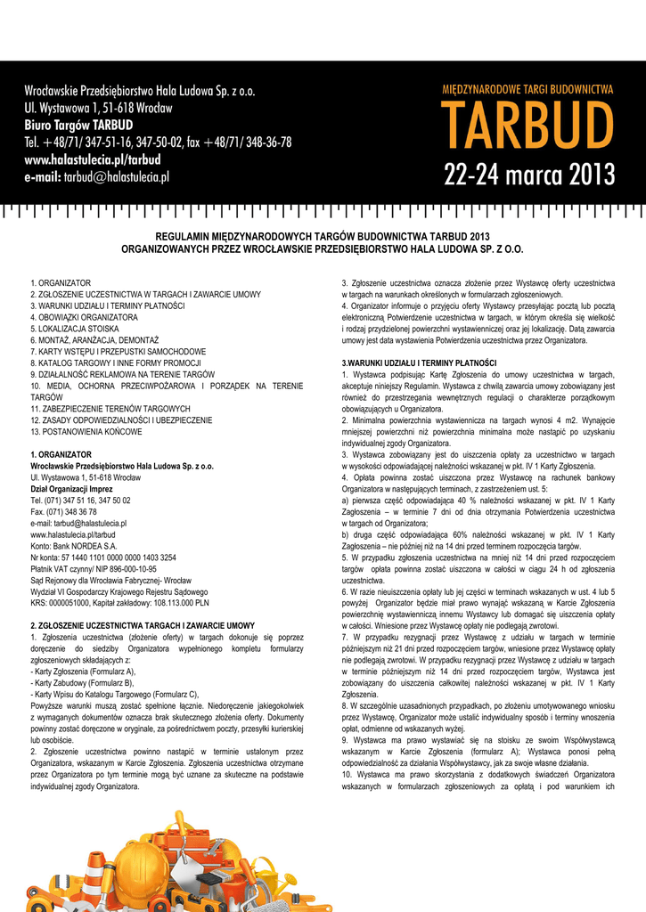 REGULAMIN MIĘDZYNARODOWYCH TARGÓW BUDOWNICTWA TARBUD 2013 ORGANIZOWANYCH PRZEZ WROCŁAWSKIE PRZEDSIĘBIORSTWO HALA LUDOWA SP. Z O.O. 1. ORGANIZATOR 2. ZGŁOSZENIE UCZESTNICTWA W TARGACH I ZAWARCIE UMOWY 3. WARUNKI UDZIAŁU I TERMINY PŁATNOŚCI 4. OBOWIĄZKI ORGANIZATORA 5. LOKALIZACJA STOISKA 6. MONTAŻ, ARANŻACJA, DEMONTAŻ 7. KARTY WSTĘPU I PRZEPUSTKI SAMOCHODOWE 8. KATALOG TARGOWY I INNE FORMY PROMOCJI 9. DZIAŁALNOŚĆ REKLAMOWA NA TERENIE TARGÓW 10. MEDIA, OCHORNA PRZECIWPOŻAROWA I PORZĄDEK NA TERENIE TARGÓW 11. ZABEZPIECZENIE TERENÓW TARGOWYCH 12. ZASADY ODPOWIEDZIALNOŚCI I UBEZPIECZENIE 13. POSTANOWIENIA KOŃCOWE 1. ORGANIZATOR Wrocławskie Przedsiębiorstwo Hala Ludowa Sp. z o.o. Ul. Wystawowa 1, 51-618 Wrocław Dział Organizacji Imprez Tel. (071) 347 51 16, 347 50 02 Fax. (071) 348 36 78 e-mail: [email protected] www.halastulecia.pl/tarbud Konto: Bank NORDEA S.A. Nr konta: 57 1440 1101 0000 0000 1403 3254 Płatnik VAT czynny/ NIP 896-000-10-95 Sąd Rejonowy dla Wrocławia Fabrycznej- Wrocław Wydział VI Gospodarczy Krajowego Rejestru Sądowego KRS: 0000051000, Kapitał zakładowy: 108.113.000 PLN 2. ZGŁOSZENIE UCZESTNICTWA TARGACH I ZAWARCIE UMOWY 1. Zgłoszenia uczestnictwa (złożenie oferty) w targach dokonuje się poprzez doręczenie do siedziby Organizatora wypełnionego kompletu formularzy zgłoszeniowych składających z: - Karty Zgłoszenia (Formularz A), - Karty Zabudowy (Formularz B), - Karty Wpisu do Katalogu Targowego (Formularz C), Powyższe warunki muszą zostać spełnione łącznie. Niedoręczenie jakiegokolwiek z wymaganych dokumentów oznacza brak skutecznego złożenia oferty. Dokumenty powinny zostać doręczone w oryginale, za pośrednictwem poczty, przesyłki kurierskiej lub osobiście. 2. Zgłoszenie uczestnictwa powinno nastąpić w terminie ustalonym przez Organizatora, wskazanym w Karcie Zgłoszenia. Zgłoszenia uczestnictwa otrzymane przez Organizatora po tym terminie mogą być uznane za skuteczne na podstawie indywidualnej zgody Organizatora. 3. Zgłoszenie uczestnictwa oznacza złożenie przez Wystawcę oferty uczestnictwa w targach na warunkach określonych w formularzach zgłoszeniowych. 4. Organizator informuje o przyjęciu oferty Wystawcy przesyłając pocztą lub pocztą elektroniczną Potwierdzenie uczestnictwa w targach, w którym określa się wielkość i rodzaj przydzielonej powierzchni wystawienniczej oraz jej lokalizację. Datą zawarcia umowy jest data wystawienia Potwierdzenia uczestnictwa przez Organizatora. 3.WARUNKI UDZIAŁU I TERMINY PŁATNOŚCI 1. Wystawca podpisując Kartę Zgłoszenia do umowy uczestnictwa w targach, akceptuje niniejszy Regulamin. Wystawca z chwilą zawarcia umowy zobowiązany jest również do przestrzegania wewnętrznych regulacji o charakterze porządkowym obowiązujących u Organizatora. 2. Minimalna powierzchnia wystawiennicza na targach wynosi 4 m2. Wynajęcie mniejszej powierzchni niż powierzchnia minimalna może nastąpić po uzyskaniu indywidualnej zgody Organizatora. 3. Wystawca zobowiązany jest do uiszczenia opłaty za uczestnictwo w targach w wysokości odpowiadającej należności wskazanej w pkt. IV 1 Karty Zgłoszenia. 4. Opłata powinna zostać uiszczona przez Wystawcę na rachunek bankowy Organizatora w następujących terminach, z zastrzeżeniem ust. 5: a) pierwsza część odpowiadająca 40 % należności wskazanej w pkt. IV 1 Karty Zagłoszenia – w terminie 7 dni od dnia otrzymania Potwierdzenia uczestnictwa w targach od Organizatora; b) druga część odpowiadająca 60% należności wskazanej w pkt. IV 1 Karty Zagłoszenia – nie później niż na 14 dni przed terminem rozpoczęcia targów. 5. W przypadku zgłoszenia uczestnictwa na mniej niż 14 dni przed rozpoczęciem targów opłata powinna zostać uiszczona w całości w ciągu 24 h od zgłoszenia uczestnictwa. 6. W razie nieuiszczenia opłaty lub jej części w terminach wskazanych w ust. 4 lub 5 powyżej Organizator będzie miał prawo wynająć wskazaną w Karcie Zgłoszenia powierzchnię wystawienniczą innemu Wystawcy lub domagać się uiszczenia opłaty w całości. Wniesione przez Wystawcę opłaty nie podlegają zwrotowi. 7. W przypadku rezygnacji przez Wystawcę z udziału w targach w terminie późniejszym niż 21 dni przed rozpoczęciem targów, wniesione przez Wystawcę opłaty nie podlegają zwrotowi. W przypadku rezygnacji przez Wystawcę z udziału w targach w terminie późniejszym niż 14 dni przed rozpoczęciem targów, Wystawca jest zobowiązany do uiszczenia całkowitej należności wskazanej w pkt. IV 1 Karty Zgłoszenia. 8. W szczególnie uzasadnionych przypadkach, po złożeniu umotywowanego wniosku przez Wystawcę, Organizator może ustalić indywidualny sposób i terminy wnoszenia opłat, odmienne od wskazanych wyżej. 9. Wystawca ma prawo wystawiać się na stoisku ze swoim Współwystawcą wskazanym w Karcie Zgłoszenia (formularz A); Wystawca ponosi pełną odpowiedzialność za działania Współwystawcy, jak za swoje własne działania. 10. Wystawca ma prawo skorzystania z dodatkowych świadczeń Organizatora wskazanych w formularzach zgłoszeniowych za opłatą i pod warunkiem ich zamówienia wraz ze Zgłoszeniem Uczestnictwa w targach. Późniejsze zgłoszenia nie są wiążące dla Organizatora i będą rozpatrywane indywidualnie. 11. Organizator zastrzega sobie prawo odwołania targów bez podania przyczyn. 4.OBOWIĄZKI ORGANIZATORA 1. Organizator w ramach swoich obowiązków zapewnia objętą umową powierzchnię wystawienniczą w trakcie trwania targów, a przypadku zamówienia na stoisko zabudowane również zabudowę standardową, a także odpłatne świadczenia dodatkowe zgodnie z Kartą Zgłoszenia i Kartą Zabudowy. 2. Organizator w celu promocji Wystawcy i jego produktów zapewnia we współpracy z Wystawcą, odpowiednią organizację, oprawę artystyczną oraz plastyczną targów. 3. Organizator zapewnia stosowną reklamę targów w mediach, zaprasza na targi kontrahentów ora