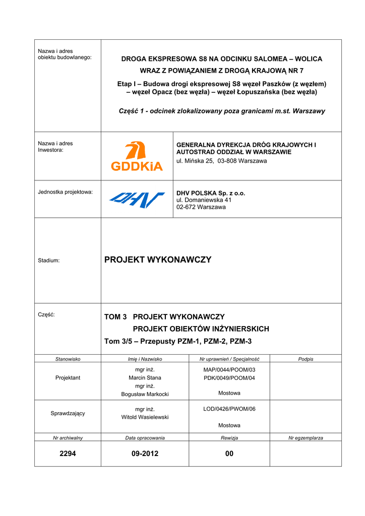 Nazwa i adres obiektu budowlanego: DROGA EKSPRESOWA S8 NA ODCINKU SALOMEA – WOLICA WRAZ Z POWIĄZANIEM Z DROGĄ KRAJOWĄ NR 7 Etap I – Budowa drogi ekspresowej S8 węzeł Paszków (z węzłem) – węzeł Opacz (bez węzła) – węzeł Łopuszańska (bez węzła) Część 1 - odcinek zlokalizowany poza granicami m.st. Warszawy Nazwa i adres Inwestora: GENERALNA DYREKCJA DRÓG KRAJOWYCH I AUTOSTRAD ODDZIAŁ W WARSZAWIE ul. Mińska 25, 03-808 Warszawa Jednostka projektowa: DHV POLSKA Sp. z o.o. ul. Domaniewska 41 02-672 Warszawa Stadium: PROJEKT WYKONAWCZY Część: TOM 3 PROJEKT WYKONAWCZY PROJEKT OBIEKTÓW INŻYNIERSKICH Tom 3/5 – Przepusty PZM-1, PZM-2, PZM-3 Stanowisko Projektant Sprawdzający Imię i Nazwisko Nr uprawnień / Specjalność mgr inż. Marcin Stana mgr inż. Bogusław Markocki MAP/0044/POOM/03 PDK/0049/POOM/04 mgr inż. Witold Wasielewski LOD/0426/PWOM/06 Podpis Mostowa Mostowa Nr archiwalny Data opracowania Rewizja 2294 09-2012 00 Nr egzemplarza DROGA EKSPRESOWA S8 NA ODCINKU SALOMEA – WOLICA WRAZ Z POWIĄZANIEM Z DROGĄ KRAJOWĄ NR 7 Etap I – Budowa drogi ekspresowej S8 węzeł Paszków (z węzłem) – węzeł Opacz (bez węzła) – węzeł Łopuszańska (bez węzła) Część 1 - odcinek zlokalizowany poza granicami m.st. Warszawy SPIS ZAWARTOŚCI: I. 1. 1.1. 1.2. 1.3. 1.4. 2. 2.1. 2.2. 2.3. 2.4. 2.5. 2.6. 3. 3.1. 3.2. 3.3. 3.4. 3.5. 3.6. 3.7. 3.8. 3.9. 4. 4.1. 4.2. 4.3. 4.4. 4.5. 4.6. 4.7. 4.8. 4.9. 5. 5.1. 5.2. 5.3. 5.4. 5.5. 6. OPIS TECHNICZNY ............................................................................................................. 4 WSTĘP ................................................................................................................................... 4 Podstawa opracowania........................................................................................................ 4 Przedmiot opracowania....................................................................................................... 4 Cel i zakres opracowania .................................................................................................... 4 Materiały wyjściowe ........................................................................................................... 4 PODSTAWOWE DANE WYJŚCIOWE................................................................................ 5 Stan istniejący i uzbrojenie terenu ...................................................................................... 5 Charakterystyka rozwiązania projektowego ....................................................................... 5 Opis warunków drogowych ................................................................................................ 5 Podstawowe parametry obiektów ....................................................................................... 6 Warunki geotechniczne....................................................................................................... 6 Zabezpieczenie przed wpływem eksploatacji górniczej. .................................................... 7 ROZWIĄZANIA ARCHITEKTONICZNO - BUDOWLANE ............................................. 7 Konstrukcja przejść dla zwierząt małych PZM-1 i PZM-3 ................................................ 7 Konstrukcja przejścia dla zwierząt małych zespolonego z ciekiem PZM- 2...................... 8 Funkcja obiektów................................................................................................................ 8 Forma architektoniczna i powiązanie z istniejącym terenem ............................................. 8 Zastosowane materiały do budowy PZM-1 i PZM-3.......................................................... 9 Zastosowane materiały do budowy PZM-2 ........................................................................ 9 Schematy statyczne obiektów ............................................................................................. 9 Posadowienie ...................................................................................................................... 9 Płyty przejściowe .............................................................................................................. 10 ELEMENTY WYPOSAŻENIA ........................................................................................... 10 Izolacja .............................................................................................................................. 10 Izolacja powierzchni betonowych stykających się z gruntem .......................................... 10 Odwodnienie płyt stropowych .......................................................................................... 10 Dylatacja pionowa ścian ................................................................................................... 11 Nawierzchnia na gzymsach............................................................................................... 11 Zabezpieczenie antykorozyjne powierzchni betonu ......................................................... 11 Urządzenia bezpieczeństwa ruchu .................................................................................... 11 Ukształtowanie skarp nasypu, rowów i zasypek przyobiektowych.................................. 11 Urządzenia obce................................................................................................................ 12 WYTYCZNE WYKONANIA.............................................................................................. 12 Założenia ogólne ............................................................................................................... 12 Roboty przygotowawcze................................................................................................... 12 Wykonanie ław fundamentowych..................................................................................... 12 Wykonanie konstrukcji obiektów ......................