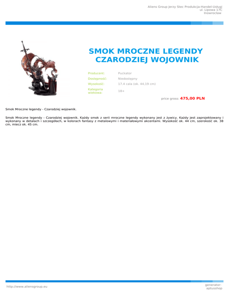 Aliens Group Jerzy Stec Produkcja-Handel-Usługi ul. Lipowa 17C Inowrocław SMOK MROCZNE LEGENDY CZARODZIEJ WOJOWNIK Producent: Puckator Dostępność: Niedostępny Wysokość: 17.4 cala (ok. 44,19 cm) Kategoria wiekowa: 18+ price gross: 475,00 PLN Smok Mroczne legendy - Czarodziej wojownik. Smok Mroczne legendy - Czarodziej wojownik. Każdy smok z serii mroczne legendy wykonany jest z żywicy. Każdy jest zaprojektowany i wykonany w detalach i szczegółach, w kolorach fantasy z metalowymi i materiałowymi akcentami. Wysokość ok. 44 cm, szerokość ok. 38 cm, miecz ok. 45 cm. http://www.aliensgroup.eu generator: aptusshop