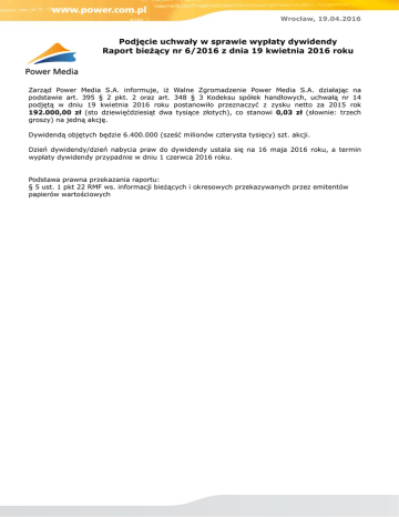 Wrocław, 19.04.2016 Podjęcie uchwały w sprawie wypłaty dywidendy Raport bieżący nr 6/2016 z dnia 19 kwietnia 2016 roku Zarząd Power Media S.A. informuje, iż Walne Zgromadzenie Power Media S.A. działając na podstawie art. 395 § 2 pkt. 2 oraz art. 348 § 3 Kodeksu spółek handlowych, uchwałą nr 14 podjętą w dniu 19 kwietnia 2016 roku postanowiło przeznaczyć z zysku netto za 2015 rok 192.000,00 zł (sto dziewięćdziesiąt dwa tysiące złotych), co stanowi 0,03 zł (słownie: trzech groszy) na jedną akcję. Dywidendą objętych będzie 6.400.000 (sześć milionów czterysta tysięcy) szt. akcji. Dzień dywidendy/dzień nabycia praw do dywidendy ustala się na 16 maja 2016 roku, a termin wypłaty dywidendy przypadnie w dniu 1 czerwca 2016 roku. Podstawa prawna przekazania raportu: § 5 ust. 1 pkt 22 RMF ws. informacji bieżących i okresowych przekazywanych przez emitentów papierów wartościowych
