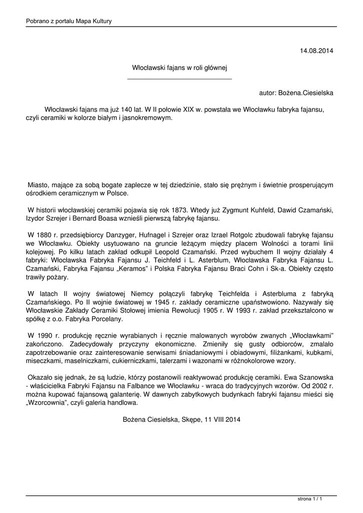 Pobrano z portalu Mapa Kultury 14.08.2014 Włocławski fajans w roli głównej ____________________________ autor: Bożena.Ciesielska Włocławski fajans ma już 140 lat. W II połowie XIX w. powstała we Włocławku fabryka fajansu, czyli ceramiki w kolorze białym i jasnokremowym. Miasto, mające za sobą bogate zaplecze w tej dziedzinie, stało się prężnym i świetnie prosperującym ośrodkiem ceramicznym w Polsce. W historii włocławskiej ceramiki pojawia się rok 1873. Wtedy już Zygmunt Kuhfeld, Dawid Czamański, Izydor Szrejer i Bernard Boasa wznieśli pierwszą fabrykę fajansu. W 1880 r. przedsiębiorcy Danzyger, Hufnagel i Szrejer oraz Izrael Rotgolc zbudowali fabrykę fajansu we Włocławku. Obiekty usytuowano na gruncie leżącym między placem Wolności a torami linii kolejowej. Po kilku latach zakład odkupił Leopold Czamański. Przed wybuchem II wojny działały 4 fabryki: Włocławska Fabryka Fajansu J. Teichfeld i L. Asterblum, Włocławska Fabryka Fajansu L. Czamański, Fabryka Fajansu „Keramos” i Polska Fabryka Fajansu Braci Cohn i Sk-a. Obiekty często trawiły pożary. W latach II wojny światowej Niemcy połączyli fabrykę Teichfelda i Asterbluma z fabryką Czamańskiego. Po II wojnie światowej w 1945 r. zakłady ceramiczne upaństwowiono. Nazywały się Włocławskie Zakłady Ceramiki Stołowej imienia Rewolucji 1905 r. W 1993 r. zakład przekształcono w spółkę z o.o. Fabryka Porcelany. W 1990 r. produkcję ręcznie wyrabianych i ręcznie malowanych wyrobów zwanych „Włocławkami” zakończono. Zadecydowały przyczyny ekonomiczne. Zmieniły się gusty odbiorców, zmalało zapotrzebowanie oraz zainteresowanie serwisami śniadaniowymi i obiadowymi, filiżankami, kubkami, miseczkami, maselniczkami, cukierniczkami, talerzami i wazonami w różnokolorowe wzory. Okazało się jednak, że są ludzie, którzy postanowili reaktywować produkcję ceramiki. Ewa Szanowska - właścicielka Fabryki Fajansu na Falbance we Włocławku - wraca do tradycyjnych wzorów. Od 2002 r. można kupować fajansową galanterię. W dawnych zabytkowych budynkach fabryki fajansu mieści się „Wzorcownia”, czyli galeria handlowa. Bożena Ciesielska, Skępe, 11 VIII 2014 strona 1 / 1
