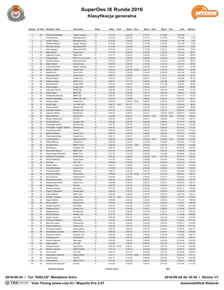 SuperOes IX Runda 2016 Klasyfikacja generalna Miejsce Nr Start. Nazwisko i imię Samochód Klasa Bieg 1 Kara Bieg 2 Kara Bieg 3 Kara Bieg 4 Kara Czas Różnica 1 25 Kwiecień Sebastian Subaru Impreza VI 2:14.25 2:24.38 2:15.27 2:13.98 9:07.88 2 1 Woźniak Piotr Mitsubishi EVO VI 2:12.32 2:27.40 2:17.12 2:13.52 9:10.36 2.48 3 2 Różak Tomasz Mitsubishi EVO VI 2:12.25 2:28.60 2:16.49 2:14.35 9:11.69 3.81 4 5 Zieliński Mariusz Subaru Impreza VI 2:14.83 2:27.22 2:17.28 2:16.07 9:15.40 7.52 5 4 Banasik Dariusz Mitsubishi EVO VI 2:17.88 2:24.49 2:21.68 2:19.65 9:23.70 15.82 6 3 Soja Grzegorz Mitsubishi EVO VI 2:14.79 2:37.61 2:17.98 2:16.71 9:27.09 19.21 7 27 Bigda Zenon Honda Civic IV 2:21.32 2:28.24 2:22.56 2:18.03 9:30.15 22.27 8 12 Zagórski Tomasz BMW E36 V 2:19.71 2:30.53 2:20.87 2:22.79 9:33.90 26.02 9 11 Pawlak Rafał BMW E36 JR Automobile V 2:16.62 2:29.75 2:20.52 2:27.39 9:34.28 26.40 10 94 Skoczeń Łukasz Mitsubishi EVO VI 2:23.42 2:27.81 2:23.52 2:19.74 9:34.49 26.61 11 29 Bęben Adrian Honda Evora IV 2:33.37 2:24.35 2:19.32 2:17.70 9:34.74 26.86 12 8 Łuszcz Krzysztof Subaru Impreza VI 2:22.33 2:27.98 2:22.90 2:22.56 9:35.77 27.89 13 28 Niemiec Maciej Honda Civic IV 2:22.20 2:39.20 10.00 2:20.73 2:18.34 9:40.47 32.59 14 17 Dadok Piotr Volvo S 40 V 2:23.32 2:32.48 2:23.45 2:22.09 9:41.34 33.46 15 61 Pakosiński Piotr Honda Civic III 2:35.77 2:24.96 2:22.21 2:19.11 9:42.05 34.17 16 41 Bieniek Wiktor Honda Civic IV 2:43.97 2:23.81 2:20.21 2:14.07 9:42.06 34.18 17 20 Pukała Tomasz BMW E 30 V 2:22.51 2:31.73 2:26.46 2:21.66 9:42.36 34.48 18 60 Banaś Michał Honda CRX III 2:44.43 2:24.49 2:19.50 2:17.49 9:45.91 38.03 19 59 Kruk Grzegorz Honda CRX III 2:45.87 2:24.51 2:19.72 2:16.77 9:46.87 38.99 20 14 Adamczyk Michał BMW E36 V 2:22.85 2:32.85 2:28.18 2:25.15 9:49.03 41.15 21 16 Kaleta Adam BMW M3 V 2:23.34 2:44.65 2:30.70 2:20.78 9:59.47 51.59 22 21 Podołowski Mariusz BMW 325 V 2:35.78 2:34.36 2:26.34 2:24.73 10:01.21 53.33 23 95 Wójcik Przemysław BMW E36 M3 V 2:33.33 2:35.95 2:29.25 2:23.82 10:02.35 54.47 24 65 Wojtunik Adam Honda Civic III 2:45.64 2:33.83 10.00 2:22.97 2:21.03 10:03.47 55.59 25 6 Stram Paula VW Golf VI R VI 2:29.13 2:41.67 2:28.00 2:25.13 10:03.93 56.05 26 52 Watras Maciej Renault Clio IV 3:00.42 2:25.51 2:21.44 2:19.19 10:06.56 58.68 27 53 Lipowski Tomasz Renault Clio IV 2:51.37 2:27.67 2:26.20 2:23.13 10:08.37 1:00.49 28 63 Zalewski Michał Honda Civic III 2:40.91 2:25.51 2:21.41 2:40.87 20.00 10:08.70 1:00.82 29 62 Mazur Mariusz Honda Civic III 2:44.80 2:26.42 2:29.60 2:28.03 10:08.85 1:00.97 30 73 Muczko Aleksander Fiat CC II 2:43.75 2:32.24 2:29.11 2:28.88 10:13.98 1:06.10 31 78 Mostek Bartosz Peugeot 106 II 2:42.86 2:33.07 2:29.98 2:28.83 10:14.74 1:06.86 32 37 Podsiadło Andrzej Renault Clio IV 3:07.12 2:27.79 2:23.02 2:20.25 10:18.18 1:10.30 33 32 "Podsiadło ""Siadły"" Michał" Renault Clio IV 2:54.01 2:28.72 2:32.47 2:24.03 10:19.23 1:11.35 34 71 Twardowski Karol Fiat CC II 2:50.59 2:33.57 2:30.47 2:28.49 10:23.12 1:15.24 35 31 Niemiec Michał Honda Civic III 2:46.15 2:43.59 2:28.62 2:25.35 10:23.71 1:15.83 36 64 Pasternak Andrzej Honda Civic III 2:50.17 2:32.07 2:26.76 2:34.86 10:23.86 1:15.98 36 7 Koziarz Robert Mitsubishi EVO VI 2:26.39 2:32.00 2:35.94 10:23.86 1:15.98 38 38 Kalara Mariusz Honda Civic IV 3:05.29 2:33.91 2:24.09 2:22.08 10:25.37 1:17.49 39 50 Wodniak Artur BMW 318 IS IV 3:00.39 2:37.36 2:26.46 2:22.63 10:26.84 1:18.96 40 74 Maj Mariusz Peugeot 106 II 2:45.10 2:35.97 2:35.50 2:31.35 10:27.92 1:20.04 41 58 Raszewski Marcin BMW E30 IV 3:01.53 2:34.64 2:26.66 2:25.73 10:28.56 1:20.68 42 40 Krzyczmanik Sebastian BMW E 30 IV 3:17.74 2:31.23 2:23.60 2:20.23 10:32.80 1:24.92 43 26 Kwiecień Przemysław Honda Civic IV 3:03.37 2:28.48 2:43.62 2:21.66 10:37.13 1:29.25 44 85 Witecki Mateusz Suzuki Swift II 2:41.76 2:48.21 2:35.08 2:34.60 10:39.65 1:31.77 45 88 Jorż Igor Fiat 126 I 2:56.66 2:37.58 2:34.22 2:34.26 10:42.72 1:34.84 46 66 Kalara Adrian Honda Civic III 3:06.57 2:39.94 2:30.72 2:25.54 10:42.77 1:34.89 47 51 Dziubiński Marek Honda Civic IV 3:14.80 2:33.02 2:30.05 2:26.00 10:43.87 1:35.99 48 19 Witkowski Rafał BMW M3 V 3:26.72 2:35.39 2:22.47 2:19.30 10:43.88 1:36.00 49 56 Brodowski Miłosz Renault Clio IV 3:08.03 2:41.66 10.00 2:27.02 2:27.74 10:44.45 1:36.57 50 30 Gruca Michał Renault Clio II IV 3:04.86 2:28.87 2:48.45 2:22.75 10:44.93 1:37.05 51 82 Piotrowicz Łukasz Fiat Punto II 3:00.32 2:39.27 2:33.31 2:32.77 10:45.67 1:37.79 52 46 Bakalarczyk Michał Honda Civic IV 3:20.99 2:36.91 2:25.27 2:23.22 10:46.39 1:38.51 53 80 Stokłosa Piotr Fiat SC II 2:50.73 2:40.35 2:38.39 2:37.94 10:47.41 1:39.53 54 18 Sobala Krzysztof Mercedes V 2:41.33 2:53.22 2:42.65 2:33.51 10:50.71 1:42.83 55 77 Pypeć Przemysław Suzuki Swift II 3:04.49 2:35.72 2:35.33 2:35.24 10:50.78 1:42.90 56 23 Kałucki Marek BMW 323i V 2:45.89 2:49.93 2:42.33 2:39.14 10:57.29 1:49.41 57 67 Ciombor Grzegorz Honda Civic III 3:29.73 2:33.13 2:32.07 2:26.04 11:00.97 1:53.09 58 39 Stępień Marek Renault Clio IV 3:09.99 2:42.04 2:39.45 2:32.94 11:04.42 1:56.54 59 55 Mosur Wiktor Renault Clio IV 3:16.64 2:42.48 2:33.33 2:32.42 11:04.87 1:56.99 60 36 Kucała Wojciech Mercedes IV 3:16.94 2:41.90 2:37.28 2:33.34 11:09.46 2:01.58 61 68 Zawłocki Kamil Honda Civic III 3:10.72 2:45.06 2:38.21 2:36.56 11:10.55 2:02.67 62 54 Stępień Michał Renault Clio IV 3:14.00 2:39.58 2:47.48 2:30.17 11:11.23 2:03.35 63 69 Mortka Mariusz Honda Civic III 3:13.19 2:46.03 2:39.41 2:37.93 11:16.56 2:08.68 64 86 Szuter Tomasz Fiat 126 I 3:06.72 2:47.47 2:42.86 2:41.59 11:18.64 2:10.76 65 72 Piotrowicz Mariusz Fiat Punto II 3:14.61 2:39.05 2:45.74 2:43.67 11:23.07 2:15.19 66 47 Barcicki Łukasz Renault Clio IV 3:23.45 2:45.00 2:39.50 2:36.78 11:24.73 2:16.85 67 70 Zarzycki Mateusz Honda Civic III 3:24.29 2:44.15 2:41.37 2:35.31 11:25.12 2:17.24 68 90 Warszawa Łukasz Nissan Micra I 3:05.74 2:50.05 2:47.18 2:45.04 11:28.01 2:20.13 69 49 Domaradzki Jarosław BMW 318 IS IV 3:26.93 2:50.00 2:41.72