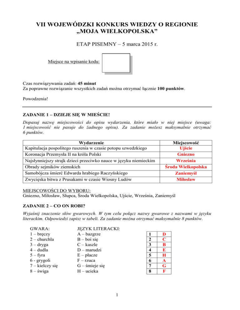 VII WOJEWÓDZKI KONKURS WIEDZY O REGIONIE „MOJA WIELKOPOLSKA” ETAP PISEMNY – 5 marca 2015 r. Miejsce na wpisanie kodu: Czas rozwiązywania zadań: 45 minut Za poprawne rozwiązanie wszystkich zadań można otrzymać łącznie 100 punktów. Powodzenia! ZADANIE 1 – DZIEJE SIĘ W MIEŚCIE! Dopasuj nazwę miejscowości do opisu wydarzenia, które miało w niej miejsce (uwaga: 1 miejscowość nie pasuje do żadnego opisu). Za zadanie możesz maksymalnie otrzymać 6 punktów. Wydarzenie Kapitulacja pospolitego ruszenia w czasie potopu szwedzkiego Koronacja Przemysła II na króla Polski Najsłynniejszy strajk dzieci przeciwko nauce w języku niemieckim Obrady sejmików ziemskich Samobójcza śmierć Edwarda hrabiego Raczyńskiego Zwycięska bitwa z Prusakami w czasie Wiosny Ludów Miejscowość Ujście Gniezno Września Środa Wielkopolska Zaniemyśl Miłosław MIEJSCOWOŚCI DO WYBORU: Gniezno, Miłosław, Słupca, Środa Wielkopolska, Ujście, Września, Zaniemyśl ZADANIE 2 – CO ON ROBI? Wyjaśnij znaczenie słów gwarowych. W tym celu połącz nazwy gwarowe z nazwami w języku literackim. Odpowiedzi zapisz w tabeli. Za zadanie można otrzymać maksymalnie 8 punktów. GWARA: 1 – bręczy 2 – churchla 3 – dryga 4 – dudla 5 – fyra 6 - grygoli 7 – kielczy się 8 – świga JĘZYK LITERACKI: A – bazgrze B – boi się C – kaszle D – marudzi E – płacze F – rzuca G – śmieje się H – ucieka 1 1 2 3 4 5 6 7 8 D C B E H A G F ZADANIE 3 – WCZEŚNIEJ CZY PÓŹNIEJ? Przy każdej z poniższych par zdarzeń wpisz literę „W” obok zdarzenia wcześniejszego, a „P” obok zdarzenia późniejszego. Za zadanie można otrzymać maksymalnie 6 punktów. P W budowa ratusza w Poznaniu lokacja Poznania P W wybuch II wojny światowej złamanie kodu maszyny szyfrującej Enigma P W powstanie pierwszego obszaru Natura 2000 w Wielkopolsce powstanie pierwszego parku narodowego w Wielkopolsce W P powstanie w Poznaniu pierwszego biskupstwa Kościoła katolickiego w Polsce Zjazd Gnieźnieński P W Jan Amos Komeński zostaje rektorem szkół – luterańskiej i braci czeskich w Lesznie przybycie braci czeskich do Wielkopolski W P odzyskanie przez Polskę niepodległości po I wojnie światowej wybuch powstania wielkopolskiego ZADANIE 4 – WARTO PRZEŻYĆ Obok opisu wydarzenia wpisz skrót nazwy parku krajobrazowego, na którego terenie (lub w jego najbliższym sąsiedztwie!) dane wydarzenie się odbywa (uwaga: 1 park krajobrazowy nie pasuje do żadnego opisu). Za zadanie można otrzymać maksymalnie 7 punktów. Wydarzenie Wielkie Smażenie Powideł w Centrum Edukacji Regionalnej i Przyrodniczej w Mniszkach Festiwal Kultury Słowiańskiej i Cysterskiej w Lądzie Ogólnopolskie Spotkanie Młodych Lednica 2000 Festiwal „Chopin w barwach jesieni” w Antoninie Noc Kościołów Drewnianych Dni Otwartych Koszar w 33. Bazie Lotnictwa Transportowego Rowerowa Kopaszewska Droga Krzyżowa Skrót nazwy parku krajobrazowego PsPK NPK LPK PKDB PKPZ PoPK PKDCH PARKI KRAJOBRAZOWE DO WYBORU (w nawiasie skróty nazw do wpisania w tabeli): Lednicki Park Krajobrazowy (LPK), Nadwarciański Park Krajobrazowy (NPK), Park Krajobrazowy „Dolina Baryczy” (PKDB), Park Krajobrazowy im. gen. D. Chłapowskiego (PKDCH), Park Krajobrazowy Promno (PKP), Park Krajobrazowy Puszcza Zielonka (PKPZ), Powidzki Park Krajobrazowy (PoPK), Pszczewski Park Krajobrazowy (PsPK) ZADANIE 5 – PRAWDOMÓWNI Przeczytaj poniższe zdania, a następnie wpisz literę P obok zdań prawdziwych, a literę F obok zdań fałszywych (uwaga: wystarczy 1 element fałszywy, aby całe zdanie również było fałszywe). Za zadanie można otrzymać maksymalnie 6 punktów. 2 F P F F P P Bambrzy to potomkowie katolickich kolonistów przybyłych do podpoznańskich wsi z rejonu Berna w Szwajcarii. Jednym z najciekawszych rejonów turystycznych w Wielkopolsce jest Pojezierze Międzychodzko-Sierakowskie z bogatą rzeźbą terenu i licznymi jeziorami. Na początku XXI wieku w Starym Licheniu pod Koninem, w sanktuarium św. Wojciecha powstała okazała bazylika - jeden z największych kościołów na świecie. Diabeł Wenecki to legendarna postać ogromnego wilka, który budził powszechną grozę napadając na mieszkańców okolic Wenecji koło Żnina. W dotychczasowych rozgrywkach o mistrzostwo Polski w hokeju na trawie mężczyzn zdecydowanie najczęściej triumfowały zespoły z Wielkopolski. Wielkopolskie złoża węgla brunatnego występują nie tylko na wschodzie regionu, ale również między innymi na południe i południowy zachód od Poznania. ZADANIE 6 – CO KRYJĄ NAZWY MIEJSCOWOŚCI? Dopasuj nazwy do właściwego typu według ich znaczenia (do każdego typu pasują 2 nazwy, 1 nazwa nie pasuje do żadnego typu!). Za zadanie można otrzymać maksymalnie 8 punktów. Typ miejscowości Miejscowość Piła Trzykolne Młyny Piekary Szczytniki Czerniejewskie Ostrów Wielkopolski Ujście Grodzisk Wielkopolski Osieczna Dawne osady przemysłowe Dawne osady służebne Miejscowości, których nazwy wywodzą się od ich położenia Miejscowości, których nazwy wywodzą się od umocnień NAZWY MIEJSCOWOŚCI DO WYBORU: Grodzisk Wielkopolski, Osieczna, Ostrów Wielkopolski, Czerniejewskie, Środa Wielkopolska, Trzykolne Młyny, Ujście Piekary, Piła, Szczytniki ZADANIE 7 – WARTO NAD WARTĄ? Zaznacz właściwe położenie miasta względem Warty na terenie Wielkopolski, wpisując krzyżyk w odpowiedniej kratce (uwaga: dla danego miasta tylko 1 odpowiedź jest prawidłowa!). Za zadanie można maksymalnie otrzymać 10 punktów. Miasto Grodzisk Wielkopolski Jarocin Koło Krotoszyn Nowy Tomyśl Śrem Trzcianka Turek Wągrowiec Złotów Położenie względem Warty Na południe od rzeki Bezpośrednio Na północ od rzeki (na lewym brzegu) nad Wartą (na prawym brzegu) X X X X X X X X X X 3 ZADANIE 8 – ZBIORNIKI WODNE Uzupełnij tabelę, wpisując obok opisu zbiornika wodnego jego nazwę oraz odpowiednie oznaczenie literowe na mapie. Dla 5 jezior podaj d