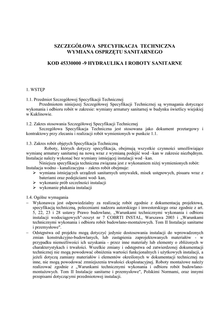 SZCZEGÓŁOWA SPECYFIKACJA TECHNICZNA WYMIANA OSPRZĘTU SANITARNEGO KOD 45330000 -9 HYDRAULIKA I ROBOTY SANITARNE 1. WSTĘP 1.1. Przedmiot Szczegółowej Specyfikacji Technicznej Przedmiotem niniejszej Szczegółowej Specyfikacji Technicznej są wymagania dotyczące wykonania i odbioru robót w zakresie: wymiany armatury sanitarnej w budynku świetlicy wiejskiej w Kuklinowie. 1.2. Zakres stosowania Szczegółowej Specyfikacji Technicznej Szczegółowa Specyfikacja Techniczna jest stosowana jako dokument przetargowy i kontraktowy przy zlecaniu i realizacji robót wymienionych w punkcie 1.1. 1.3. Zakres robót objętych Specyfikacja Techniczną Roboty, których dotyczy specyfikacja, obejmują wszystkie czynności umoŜliwiające wymianę armatury sanitarnej na nową wraz z wymianą podejść wod –kan w zakresie niezbędnym. Instalacje naleŜy wykonać bez wymiany istniejącej instalacji wod –kan. Niniejsza specyfikacja techniczna związana jest z wykonaniem niŜej wymienionych robót: Instalacja wodno - kanalizacyjna – zakres robót obejmuje: wymiana istniejących urządzeń sanitarnych umywalek, misek ustępowych, pisuaru wraz z bateriami oraz podejściami wod- kan, wykonanie prób szczelności instalacji wykonanie płukania instalacji 1.4. Ogólne wymagania − Wykonawca jest odpowiedzialny za realizację robót zgodnie z dokumentacją projektową, specyfikacją techniczną, poleceniami nadzoru autorskiego i inwestorskiego oraz zgodnie z art. 5, 22, 23 i 28 ustawy Prawo budowlane, „Warunkami technicznymi wykonania i odbioru instalacji wodociągowych"-zeszyt nr 7 COBRTI INSTAL, Warszawa 2003 i „Warunkami technicznymi wykonania i odbioru robót budowlano-montaŜowych. Tom II Instalacje sanitarne i przemysłowe". − Odstępstwa od projektu mogą dotyczyć jedynie dostosowania instalacji do wprowadzonych zmian konstrukcyjno-budowlanych, lub zastąpienia zaprojektowanych materiałów - w przypadku niemoŜliwości ich uzyskania - przez inne materiały lub elementy o zbliŜonych w charakterystykach i trwałości. Wszelkie zmiany i odstępstwa od zatwierdzonej dokumentacji technicznej nie mogą powodować obniŜenia wartości funkcjonalnych i uŜytkowych instalacji, a jeŜeli dotyczą zamiany materiałów i elementów określonych w dokumentacji technicznej na inne, nie mogą powodować zmniejszenia trwałości eksploatacyjnej. Roboty montaŜowe naleŜy realizować zgodnie z „Warunkami technicznymi wykonania i odbioru robót budowlanomontaŜowych. Tom II Instalacje sanitarne i przemysłowe", Polskimi Normami, oraz innymi przepisami dotyczącymi przedmiotowej instalacji. 2. MATERIAŁY − Do wykonania instalacji mogą być stosowane wyroby producentów krajowych i zagranicznych. − Wszystkie materiały uŜyte do wykonania instalacji muszą posiadać aktualne polskie aprobaty techniczne lub odpowiadać Polskim Normom. Wykonawca uzyska przed zastosowaniem wyrobu akceptację Inspektora Nadzoru. Odbiór techniczny materiałów powinien być dokonywany według wymagań i w sposób określony aktualnymi normami. Przewody - podejścia wody zimnej ciepłej wykonać z rur polipropylenowych zgrzewanych, a zawory kulowe na ciśnienie min.1MPa. Armatura sanitarna typowa – umywalki, wc kompakt , pisuary z zaworem spłukującym porcelanowe. 3. SPRZĘT − Wykonawca jest zobowiązany do uŜywania jedynie takiego sprzętu, który nie spowoduje niekorzystnego wpływu na jakość wykonywanych robót, zarówno w miejscu tych robót, jak teŜ przy wykonywaniu czynności pomocniczych oraz w czasie transportu, załadunku i wyładunku materiałów. 4. TRANSPORT l SKŁADOWANIE 4.1. Rury − Rury w wiązkach muszą być transportowane na samochodach o odpowiedniej długości. Kształtki naleŜy przewozić w odpowiednich pojemnikach. Podczas transportu, przeładunku i magazynowania rur i kształtek naleŜy unikać ich zanieczyszczenia. 4.2. Elementy wyposaŜenia − Transport elementów wyposaŜenia do „białego montaŜu" powinien odbywać się krytymi środkami. Zaleca się transportowanie w oryginalnych opakowaniach producenta. Elementy wyposaŜenia naleŜy przechowywać w magazynach lub w pomieszczeniach zamkniętych w pojemnikach. 4.3. Armatura − Dostarczoną na budowę armaturę naleŜy uprzednio sprawdzić na szczelność. Armaturę naleŜy składować w magazynach zamkniętych. 4.4. Izolacja termiczna − Materiały przeznaczone do wykonania izolacji cieplnych powinny być przewoŜone krytymi środkami transportu w sposób zabezpieczający je przed zawilgoceniem, zanieczyszczeniem i zniszczeniem. 5. WYKONANIE ROBÓT 5.1. Roboty demontaŜowe − DemontaŜ istniejącej instalacji wodociągowej wykonywany będzie z odzyskiem elementów armatury sanitarnej − Rurociągi stalowe naleŜy pociąć palnikami lub tarczą na odcinki długości pozwalającej na wyniesienie z budynku i transport. − Materiały uzyskane z demontaŜu naleŜy posegregować i przekazać Inwestorowi lub w uzgodnieniu z Inwestorem wywieźć do składnicy złomu lub na najbliŜsze (uzgodnione z Inwestorem) miejsce zwałki. 5.2. MontaŜ rurociągów − Rurociągi łączone będą przez kształtki i zgrzew polifuzyjny. Wymagania ogólne dla połączeń jak wyŜej określone są „Warunków technicznych wykonania i odbioru robót instalacji wodociągowych zeszyt 7 dodatek A3, oraz instrukcjach producentów rur.. Wymagania ogólne dla połączeń kielichowych instalacji kanalizacyjnej określone są w ”Warunkach technicznych wykonania i odbioru rurociągów z tworzyw sztucznych” wydanych przez PKTSG,G i K W-wa 1994 − Przed układaniem przewodów naleŜy sprawdzić trasę oraz usunąć moŜliwe do wyeliminowania przeszkody, mogące powodować uszkodzenie przewodów (np. pręty, wystające elementy zaprawy betonowej i muru). − Przed zamontowaniem naleŜy sprawdzić, czy elementy przewidziane do zamontowania nie posiadają uszkodzeń mechanicznych oraz czy w przewodach nie ma zanieczyszczeń (ziemia, papiery i inne elementy).