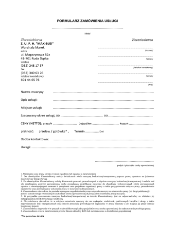 FORMULARZ ZAMÓWIENIA USŁUGI ………………………………………………………………. /data/ Zleceniobiorca Z. U. P. H. "MAX-BUD" Warchala Marek Zleceniodawca …….……………………………………………………………….. /nazwa/ adres ul. Magazynowa 52a 41-701 Ruda Śląska …….……………………………………………………………….. /adres/ telefon …….……………………………………………………………….. (032) 248 17 37 /telefon kontakowy/ fax (032) 340 63 26 …….……………………………………………………………….. telefon komórkowy /email/ 601 44 65 76 …….……………………………………………………………….. /nip/ Nazwa maszyny: ................................................................................................................. Opis usługi: ................................................................................................................. Miejsce usługi: ................................................................................................................. Szacowany okres usługi, OD ................................................ DO................................................... CENY (NETTO): praca/h ........................... Dojazd/km .............................. Ryczałt ........................... płatność: przelew / gotówka* , Osoba kontaktowa: Termin ............... Dni ................................................................................................................. Uwagi: ........................................................................................................................................ ................................................................... podpis i pieczątka osoby upoważnionej 1. Minimalny czas pracy sprzętu wynosi 4 godziny lub zgodnie z zamówieniem 2. Do obowiązków Zleceniobiorcy należy świadczenie robót maszyną budowlaną/transportową poprzez pracę operatora na jednostce maszynowej/ transportowej. 3. Do obowiązków Zleceniodawcy należy kierowanie pracami prowadzonymi z użyciem maszyny budowlanej/transportowej i nadzór nad ich przebiegiem, poprzez upoważnioną osobę posiadającą kwalifikacje stosowne do charakteru wykonywanych robót, prowadzonych zgodnie z obowiązującymi normami i przepisami oraz projektem organizacji pracy a także przygotowanie miejsca pracy, przeszkolenie operatorów oraz potwierdzenie wykonania pracy w stosownych dokumentach. 4. Zleceniodawca oświadcza, że posiada wymagane uzgodnienia dotyczące dojazdu maszyny na stanowisko pracy (od drogi publicznej) i ponosi konsekwencje ewentualnych uszkodzeń terenu spowodowanych przejazdem i normalną pracą maszyny. 5. W przypadku garażowania maszyny budowlanej/transportowej na terenie Zleceniodawcy, jest on odpowiedzialny za właściwe jej zabezpieczenie przed dewastacją i kradzieżą, 6. Zleceniodawca oświadcza, że w miejscu ustawienia maszyny nie ma wykopów, studzienek, podziemnych kanałów i skarp, a także napowietrznych linii energetycznych oraz innych przeszkód powodujących zagrożenie w pracy maszyny a do miejsca jej pracy istnieje bezpieczny dojazd, 7. Zleceniodawca zapewnia w/w pracach wykwalifikowaną kadrę specjalistów oraz osoby uprawnionej do nadzorowania przebiegu pracy, 8. Zleceniodawca wraz z zamówieniem prześle faksem aktualny KRS lub zaświadczenie o działalności gospodarczej. *Nie potrzebne skreślić