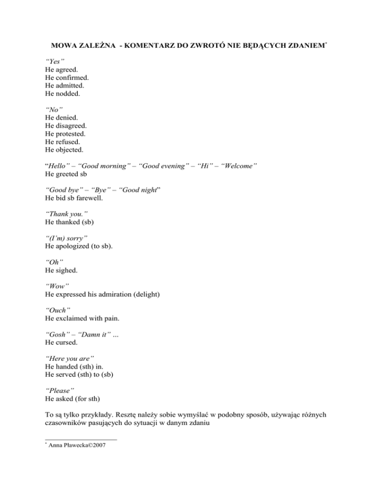 MOWA ZALEŻNA - KOMENTARZ DO ZWROTÓ NIE BĘDĄCYCH ZDANIEM* “Yes” He agreed. He confirmed. He admitted. He nodded. “No” He denied. He disagreed. He protested. He refused. He objected. “Hello” – “Good morning” – “Good evening” – “Hi” – “Welcome” He greeted sb “Good bye” – “Bye” – “Good night” He bid sb farewell. “Thank you.” He thanked (sb) “(I’m) sorry” He apologized (to sb). “Oh” He sighed. “Wow” He expressed his admiration (delight) “Ouch” He exclaimed with pain. “Gosh” – “Damn it” … He cursed. “Here you are” He handed (sth) in. He served (sth) to (sb) “Please” He asked (for sth) To są tylko przykłady. Resztę należy sobie wymyślać w podobny sposób, używając różnych czasowników pasujących do sytuacji w danym zdaniu * Anna Pławecka©2007